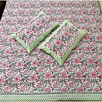 These Bedsheets and Pillow covers are created through a labour-intensive process involving skilled artisans. First, the fabric is typically made of pure cotton or silk, providing a soft and comfortable feel. Then, the fabric is hand-block printed using wooden blocks carved with intricate patterns. Natural vegetable dyes are often used to give vibrant colours to designs. Sanganeri Kantha bed covers are known for their unique and eye-catching designs, which combine the art of block printing with the beauty of hand embroidery. They are often characterized by intricate patterns, vibrant colours, and fine detailing. This bed covers not only add a touch of elegance and charm to a bedroom but also represent the rich cultural heritage of Rajasthan.