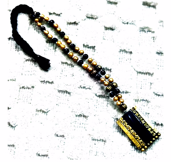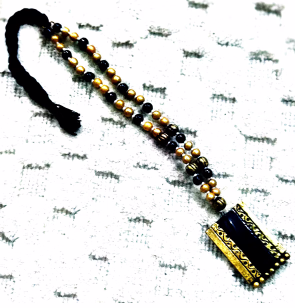 Experience the charm of traditional Indian craftsmanship with this handmade terracotta necklace from Uttar Pradesh. This elegant design features a bold rectangular pendant in striking black and gold tones, complemented by a double-strand beaded chain that adds richness and texture to the piece.