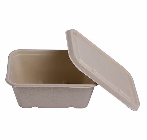 Technical Specs: Capacity 1000ml. Rectangular "block" profile. Crafted from 100% renewable Sugarcane Bagasse with a matching secure-fit lid. Performance: Microwave and freezer safe (-20°C to 120°C). Deep walls and tight lid seal make it ideal for saucy dishes and curries without leakage. Logistics: Efficiently packed (typically 300 sets/carton). Optimizes shelf space and shipping volume. Compliance: Certified compostable (EN 13432), FDA food-safe, and PFAS-Free. Customization: Lid embossing available.