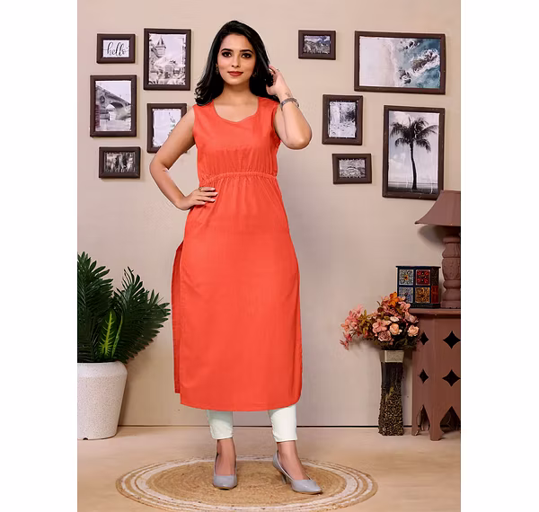 Featuring a classic round neckline and a knee-length straight fit, this kurti offers a clean, polished look that works beautifully for both casual and formal occasions. The sleeveless design adds a modern touch, making it easy to layer with jackets, shrugs, or scarves depending on your style and the weather.