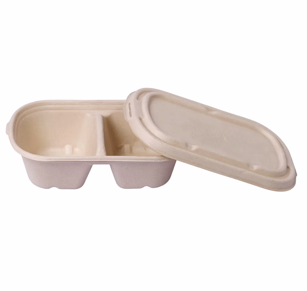 Technical Specs: Capacity ~900ml total. Crafted from 100% renewable Sugarcane Bagasse with a matching tight-seal lid. Performance: Microwave and freezer safe (-20°C to 120°C). High divider prevents cross-contamination of flavors. Resistant to hot grease and liquids without leaking. Logistics: Bases and lids nested separately (typically 300 sets/carton). A 40ft HQ maximizes shipping volume. Compliance: Certified compostable (EN 13432/ASTM D6400), FDA food-safe, and PFAS-Free. Customization: Lid embossing available.