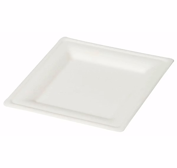 8" Square Plate: Crafted from renewable sugarcane bagasse. Modern square design adds style to appetizers, desserts, or light meals. Microwave-safe, sturdy, and oil-resistant. A fully compostable, eco-friendly dining solution.