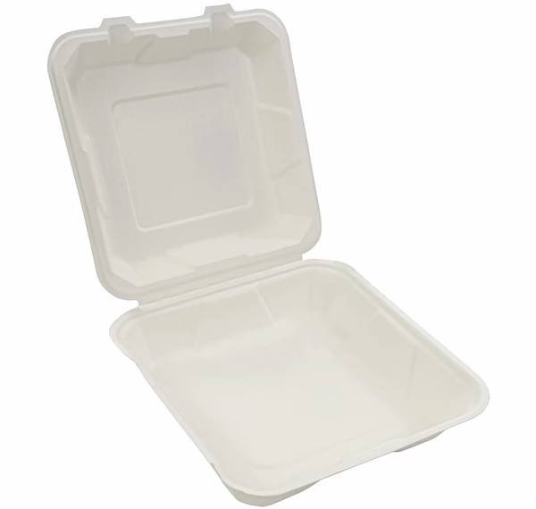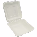 8x8" Clamshell Container: Crafted from renewable sugarcane bagasse. Versatile single-compartment design with a secure hinged lid. Microwave-safe and oil-resistant. Ideal for standard meals, offering a sturdy, fully compostable takeaway solution.