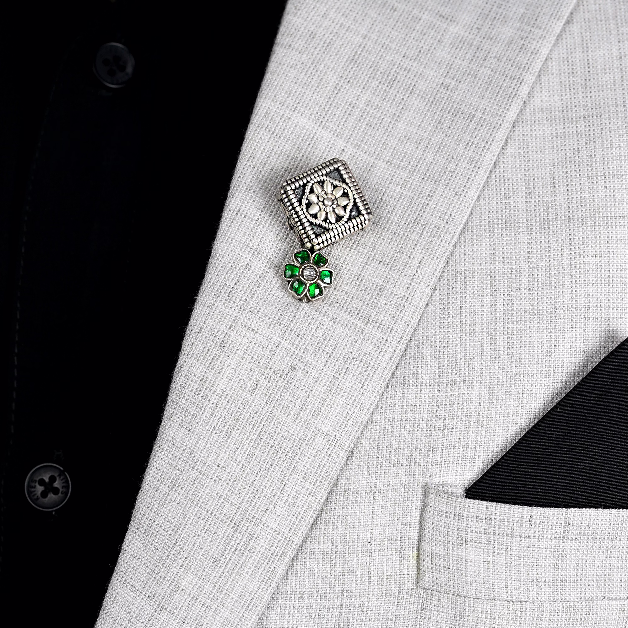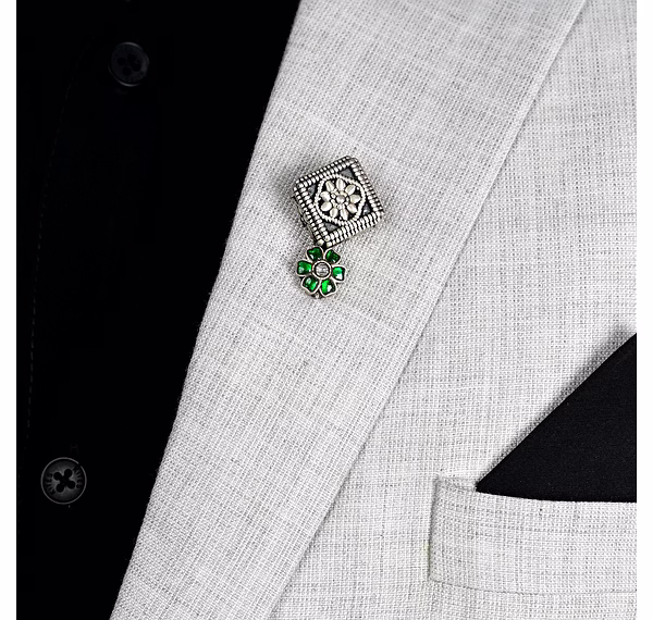 Add a touch of timeless elegance to your ensemble with this handcrafted floral lapel pin. Designed in 925 sterling silver, the piece features a dual motif: a square floral crest with antique detailing and a vibrant green flower accent with a gem-like centerpiece. This fusion of classic metalwork and colorful embellishment makes it a standout accessory for jackets, coats, or ethnic wear.