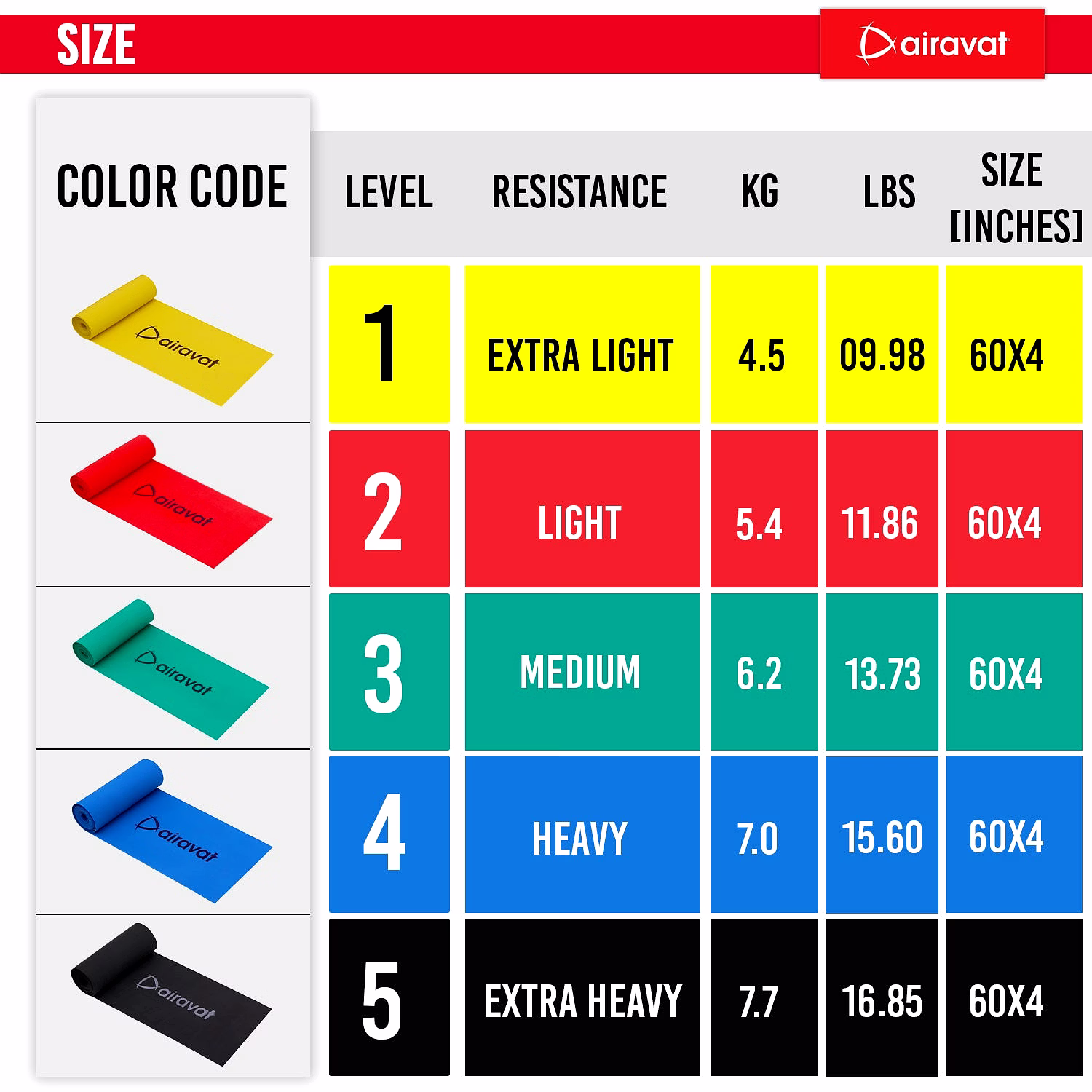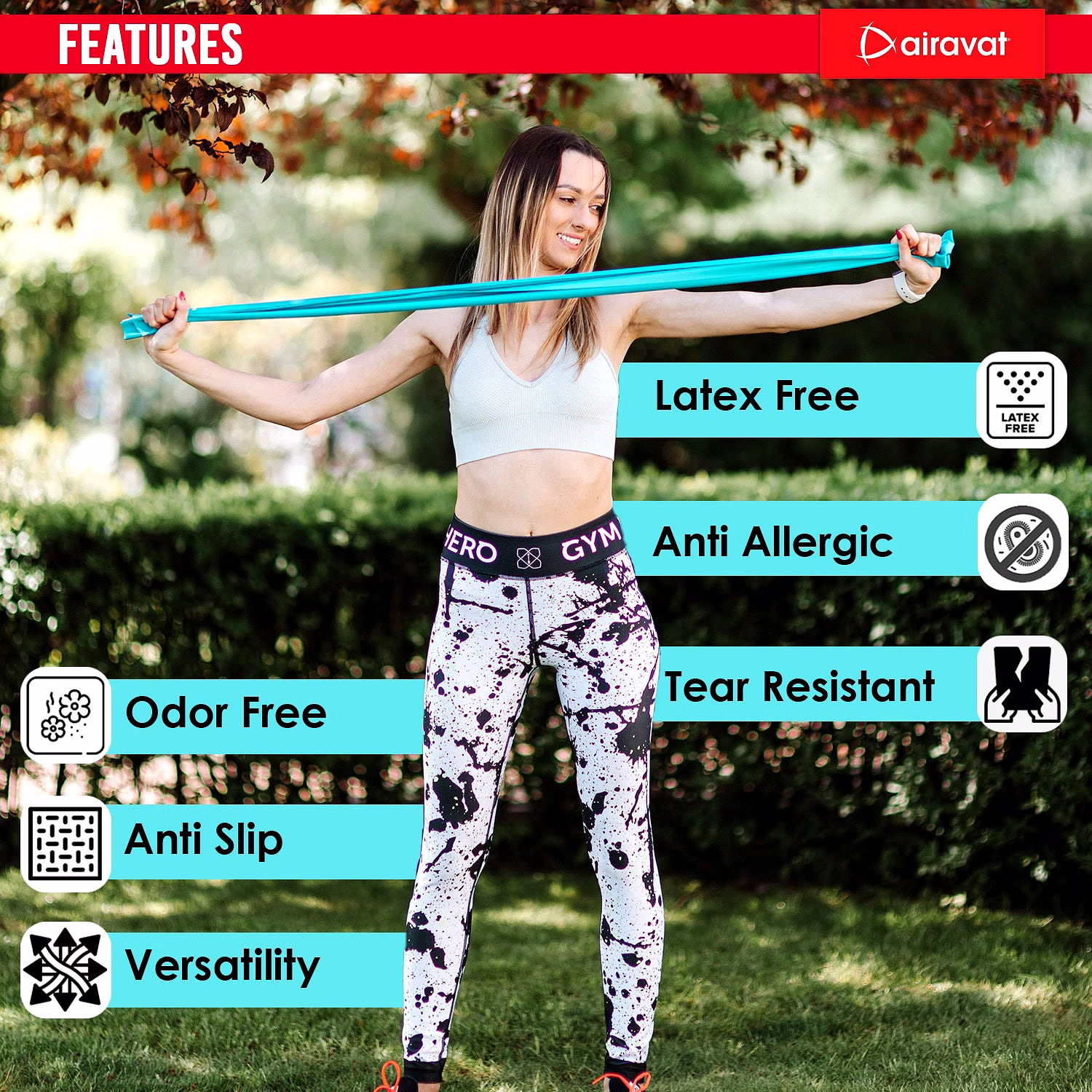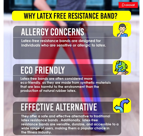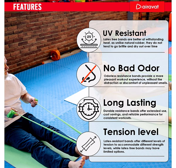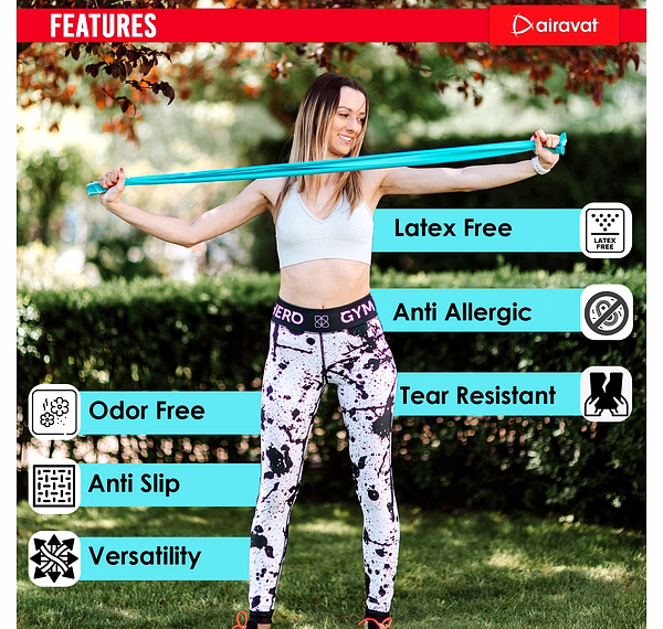 # LATEX FREE: AIRAVAT latex-free resistance bands, that do not contain any natural rubber latex, which can be an allergen for some people. Instead, they are made from synthetic materials such as TPE, which are hypoallergenic and suitable for people with latex allergies. # TEXTURE: Non-slip texture for maximum grip and performance experiences the difference with our latex free training bands. # ODOR-FREE: Latex free loop bands exercises are made with synthetic materials, which do not have the strong odor that is associated with latex. # ANTI-SLIP: The surface of latex free gym resistance bands is textured to provide a non-slip grip, which helps prevent the band from slipping or rolling during exercise. # TEAR-RESISTANT: The synthetic materials used in latex free stretch bands are generally more durable and tear resistant than latex bands, making them less likely to snap or break during use. This can also help extent the lifespan of the band. # PORTABILITY: Resistance band workout is lightweight and portable, making them easy to take with you wherever you go, including the gym, office, or even while traveling. # VERSATILITY: Resistance bands come in different strengths and sizes, allowing you to target various muscle groups and adjust the resistance level according to your fitness level. # LOW IMPACT: Resistance band exercises are low impact, meaning they are gentle on your joints and can be an excellent option for people with joint pain or injuries. # ECO FRIENDLY: Latex-free loop bands are often considered more eco-friendly, as they are made from synthetic materials that are less harmful to the environment than the production of natural rubber latex.