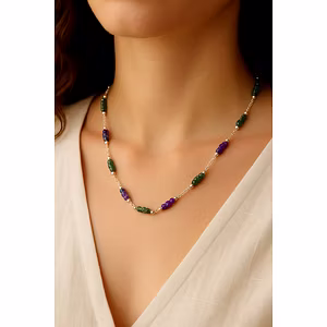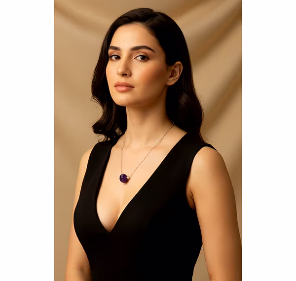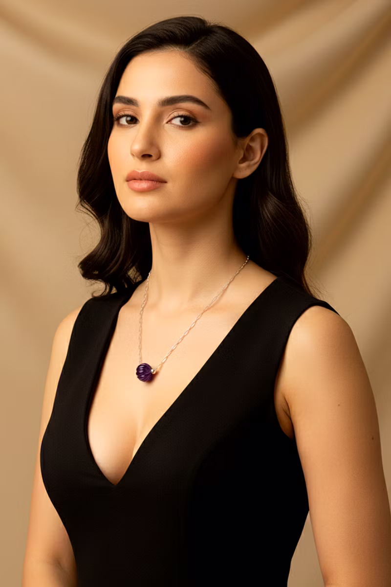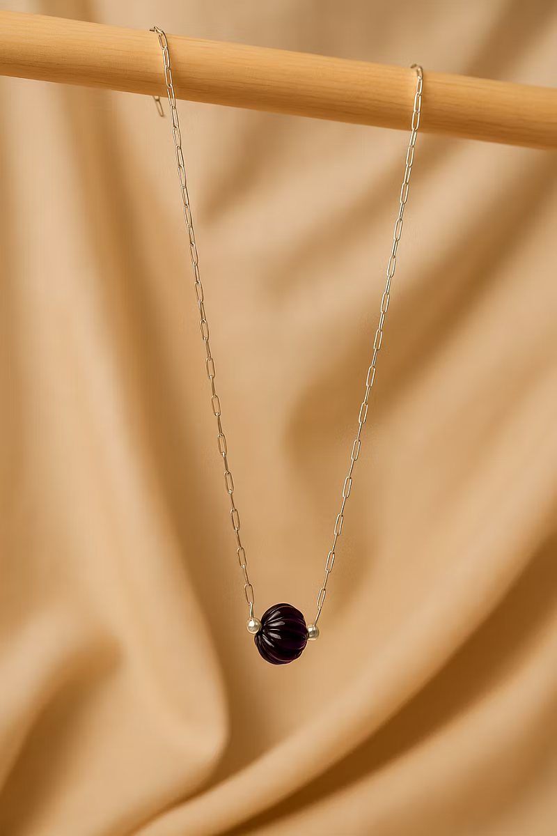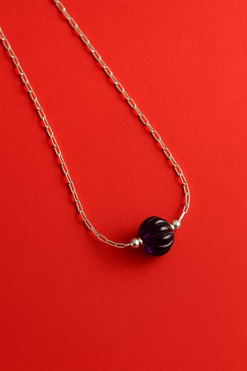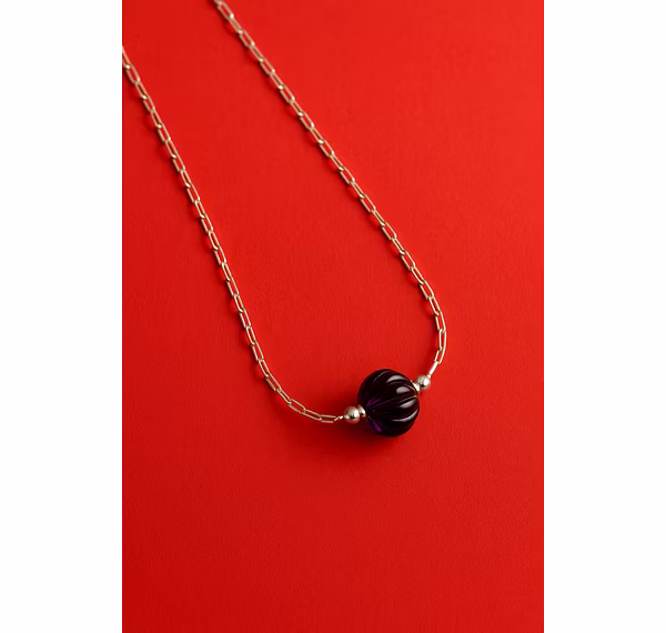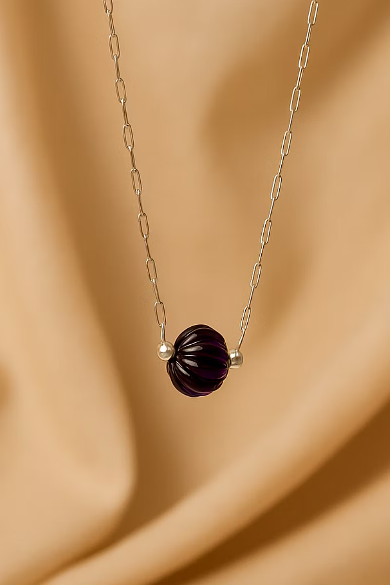 Crafted with natural carved amethyst in a rich deep purple hue, this necklace beautifully captures the elegance of gemstones in their most refined form. The amethyst beads are thoughtfully paired with 925 sterling silver chain and spacers, creating a balanced design that feels both modern and timeless. Designed in princess length, it gracefully rests at the collarbone, making it perfect for everyday wear as well as special occasions. Its minimalist yet elegant style allows it to complement both casual and formal outfits. Whether worn solo for subtle sophistication or layered for added charm, this versatile piece enhances any look. A thoughtful gift and a refined statement accessory, it’s an essential addition to every jewelry collection.