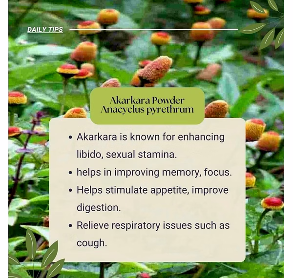 Boosts sesual health : Akarkara is known for enhancing liebeido, sesual stamina, and overall reproductive health in both men and women.