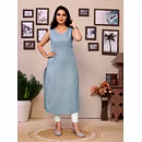 Featuring a classic round neckline and a knee-length straight fit, this kurti offers a clean, polished look that works beautifully for both casual and formal occasions. The sleeveless design adds a modern touch, making it easy to layer with jackets, shrugs, or scarves depending on your style and the weather.