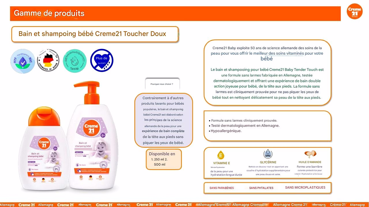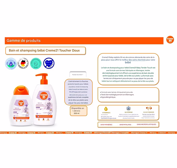 Le bain et shampooing Creme21 Baby Tender Touch, fabriqué en Allemagne, est formulé sans larmes, testé dermatologiquement et offre un moment de plaisir et de bien-être pour le bain complet de bébé.