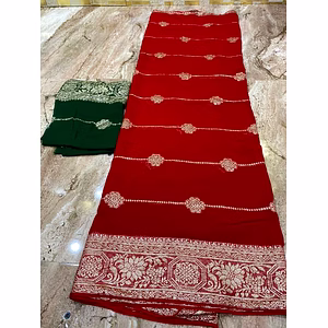 This is a handwoven banarasi georgette saree in beautiful eye catching colors . Each saree comes with zari butis all over the body , zari borders on both the sides and with a heavy pallu .
