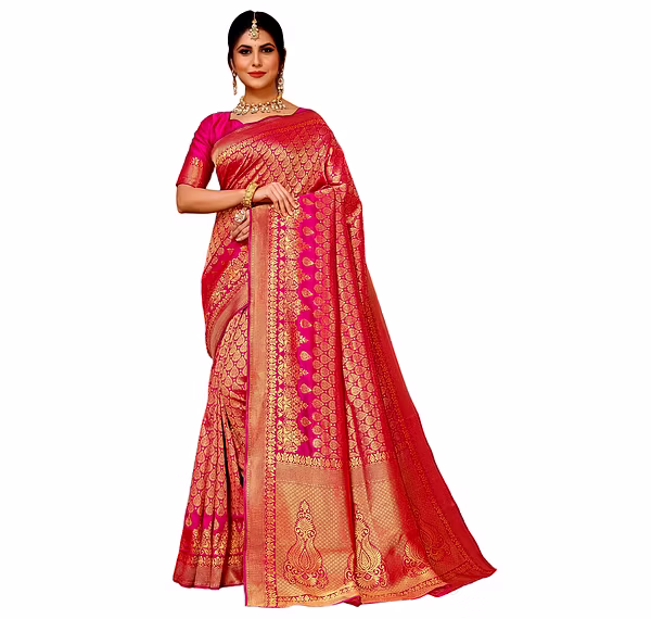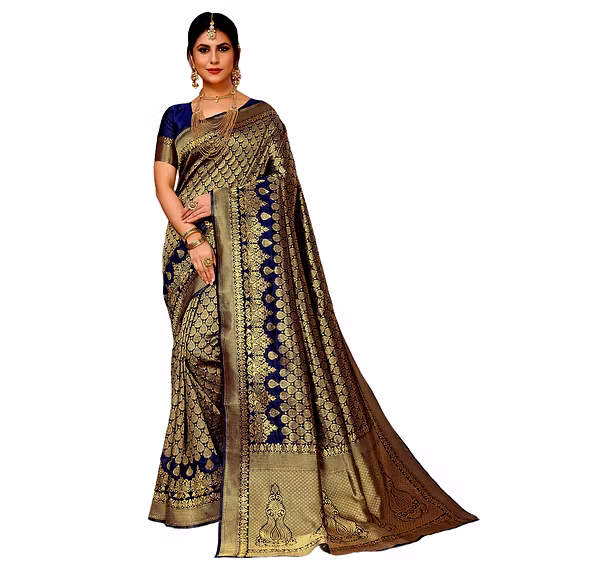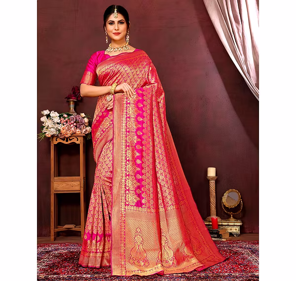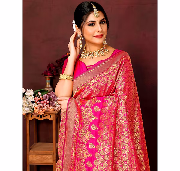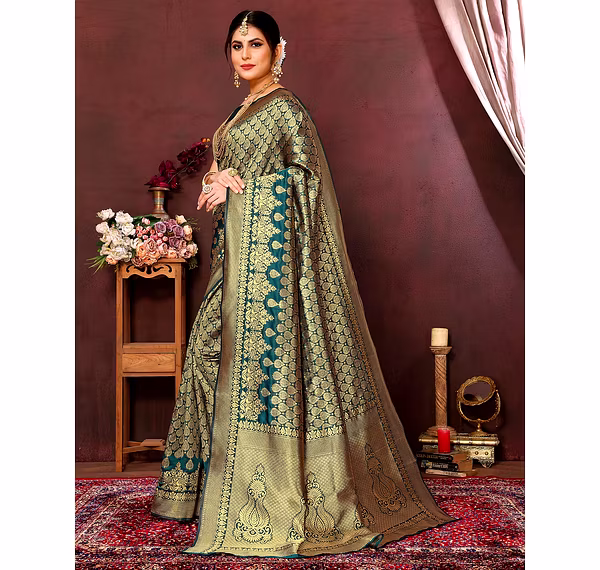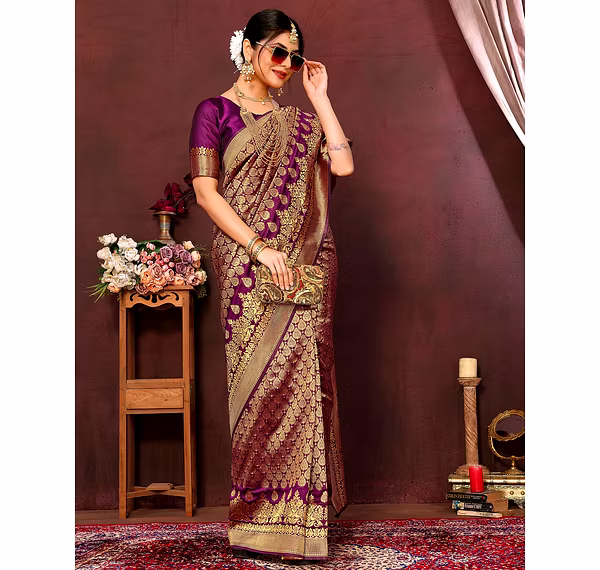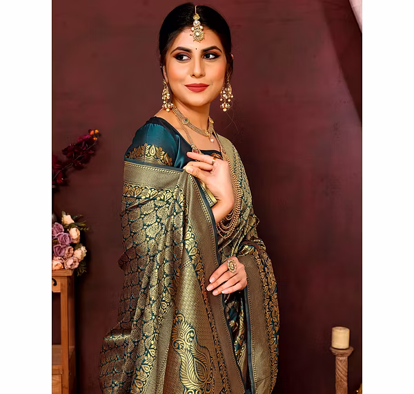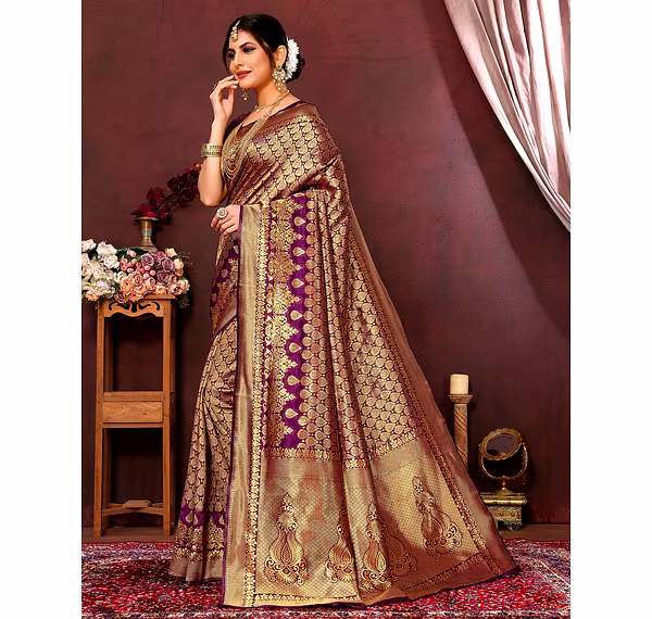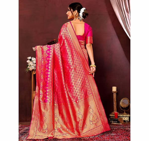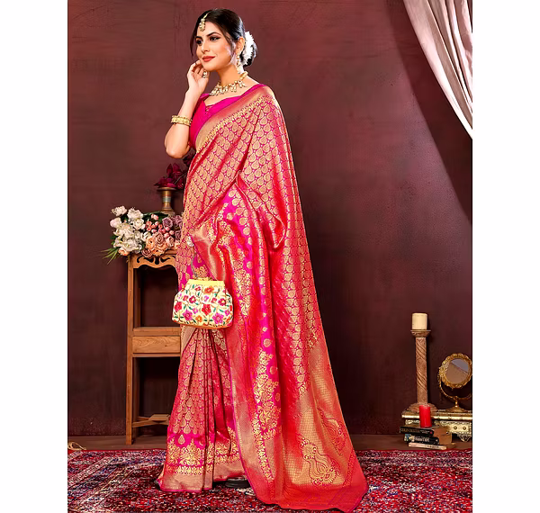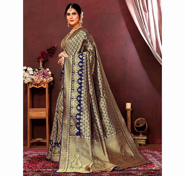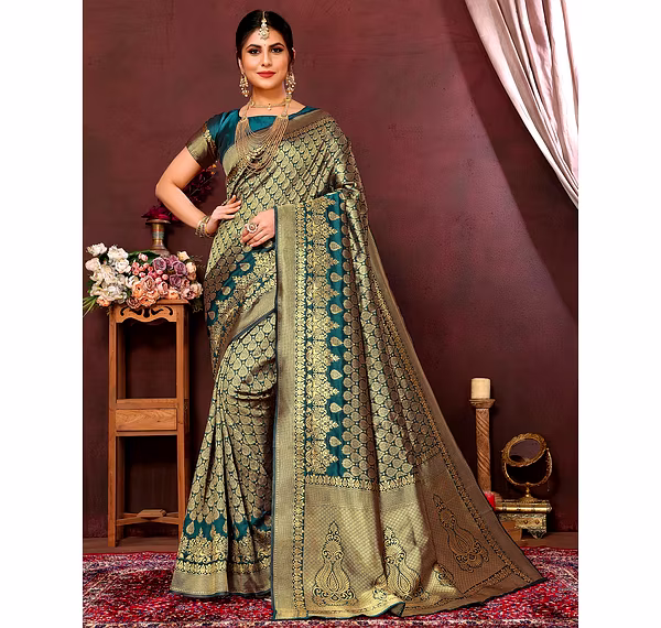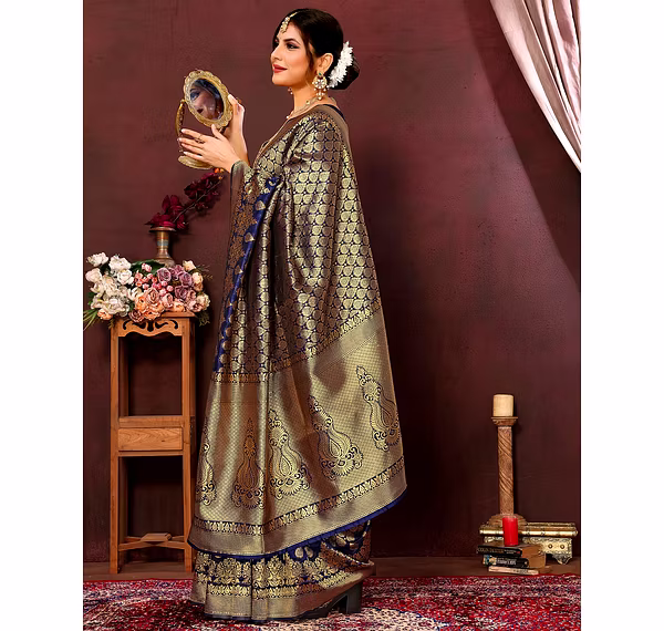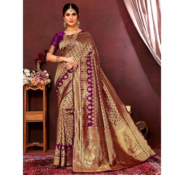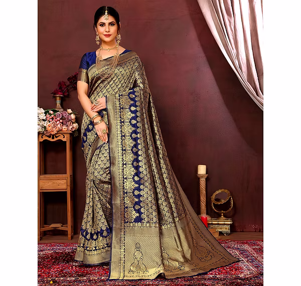 Indulge in the intricate zari motifs and vibrant colors of this Banarasi Kanjivaram Art Silk Saree. It encapsulates the weaving legacies of Banaras and Kanchipuram, exuding a luxurious sheen.