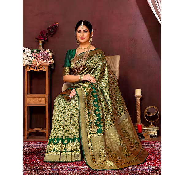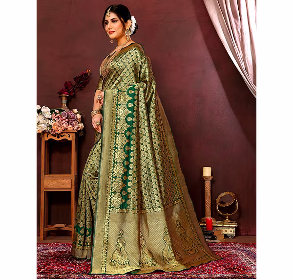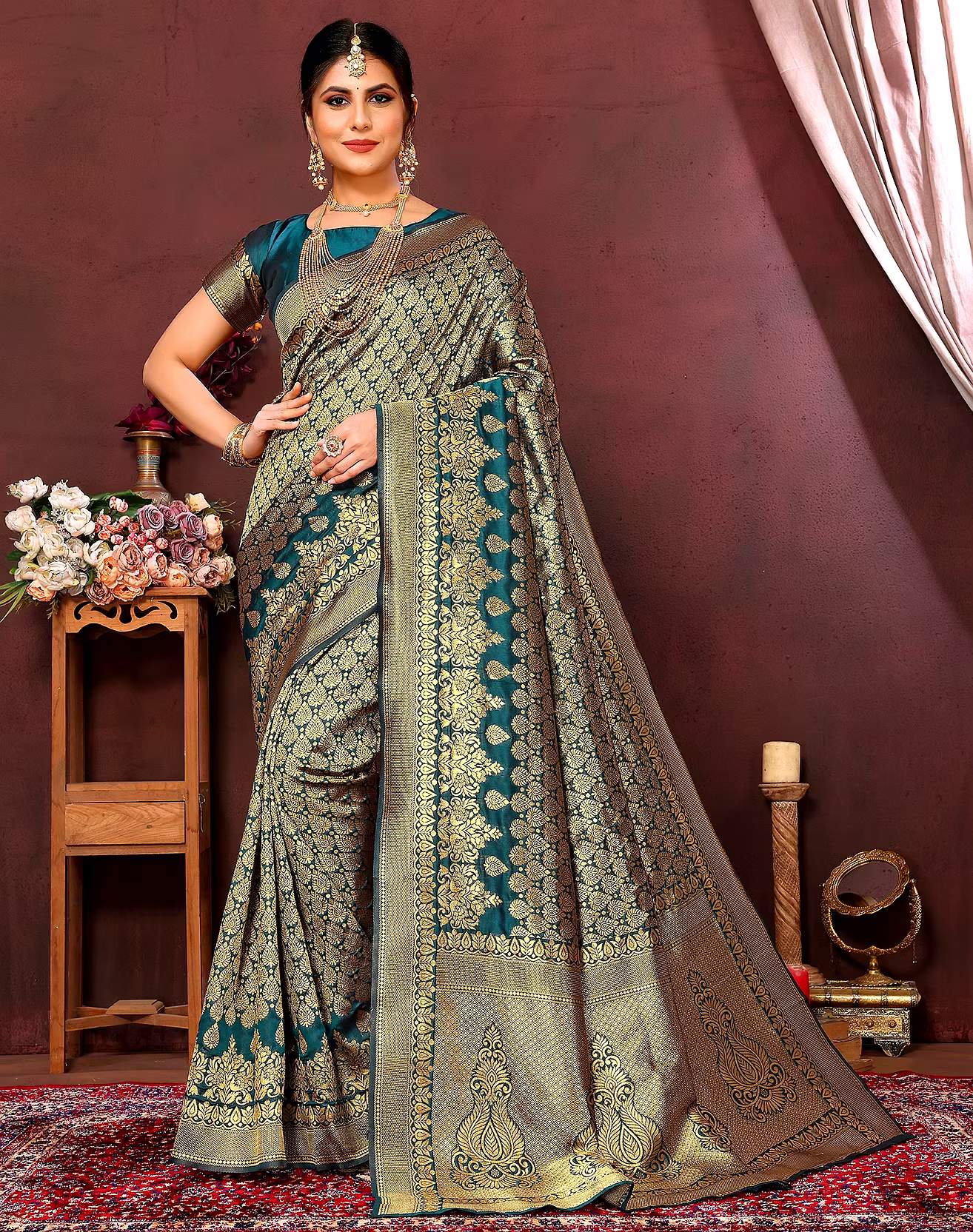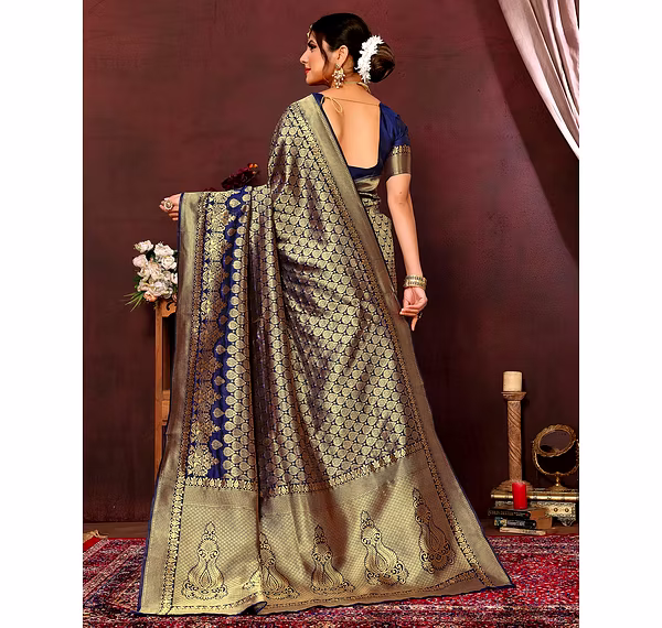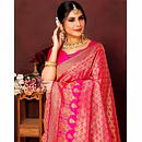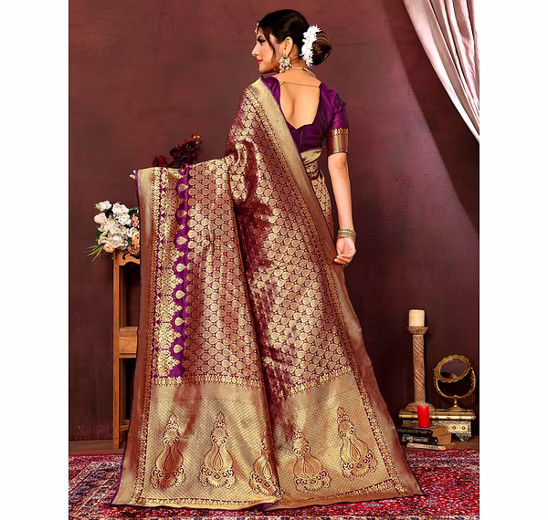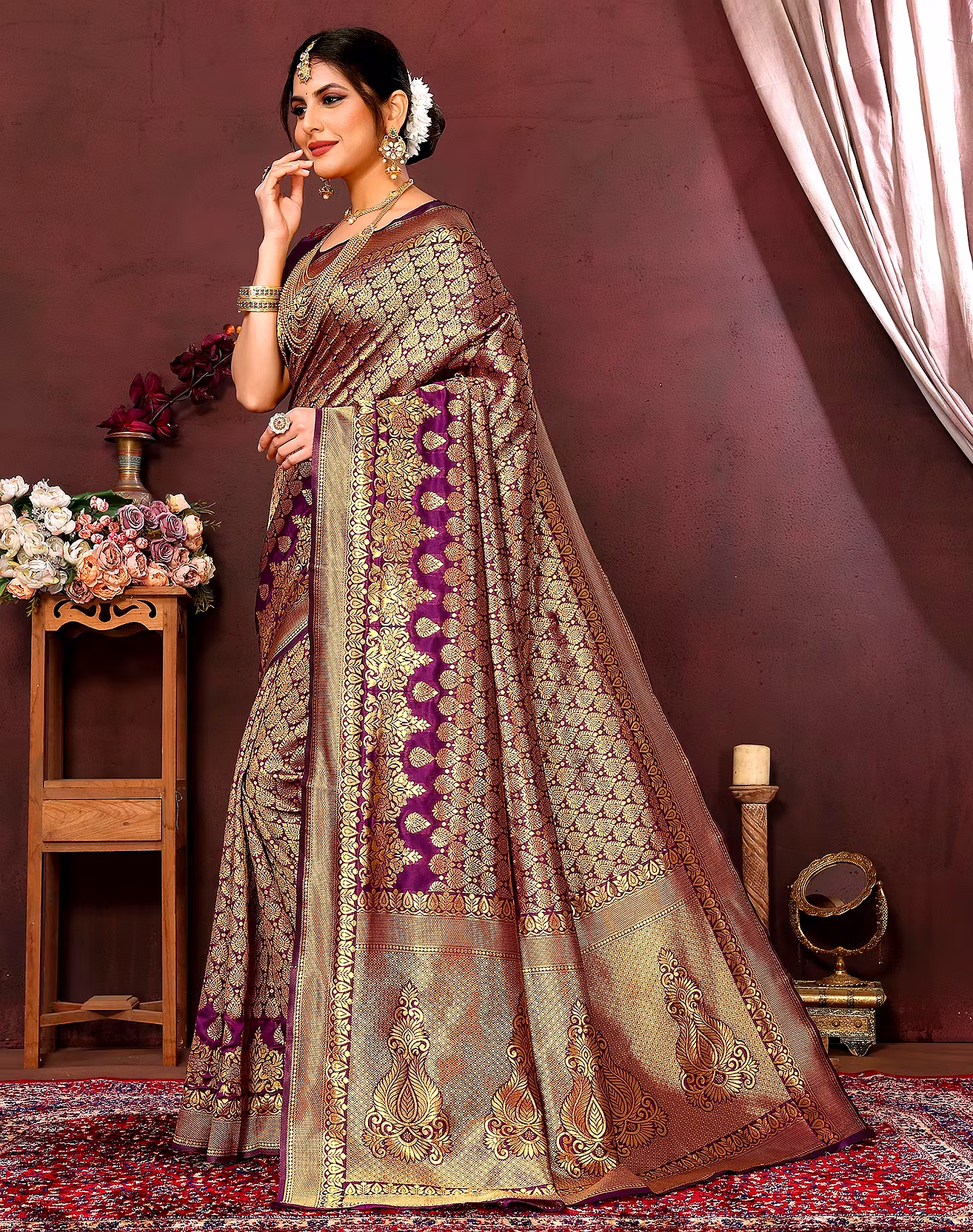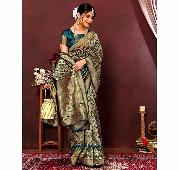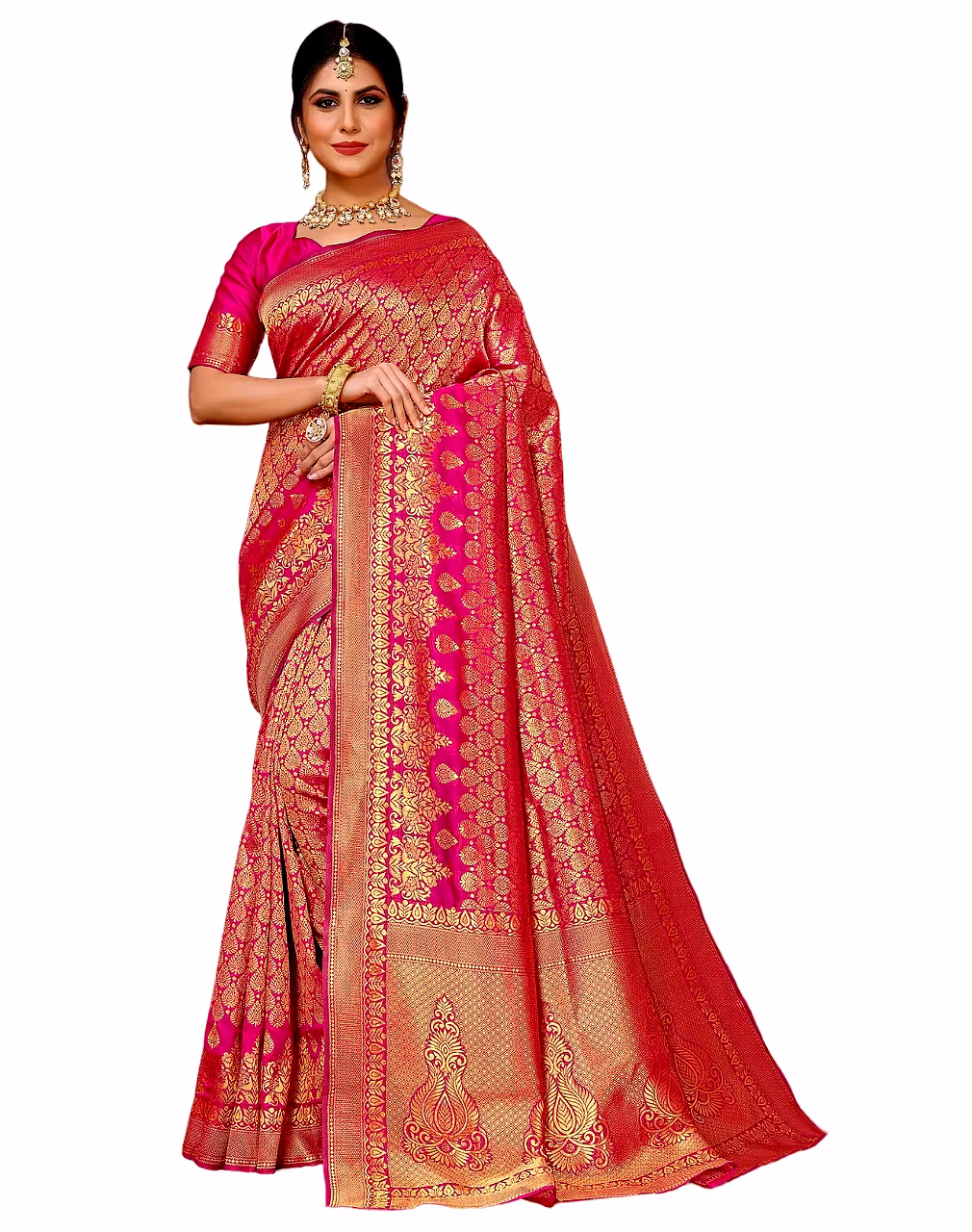 Indulge in the intricate zari motifs and vibrant colors of this Banarasi Kanjivaram Art Silk Saree. It encapsulates the weaving legacies of Banaras and Kanchipuram, exuding a luxurious sheen.