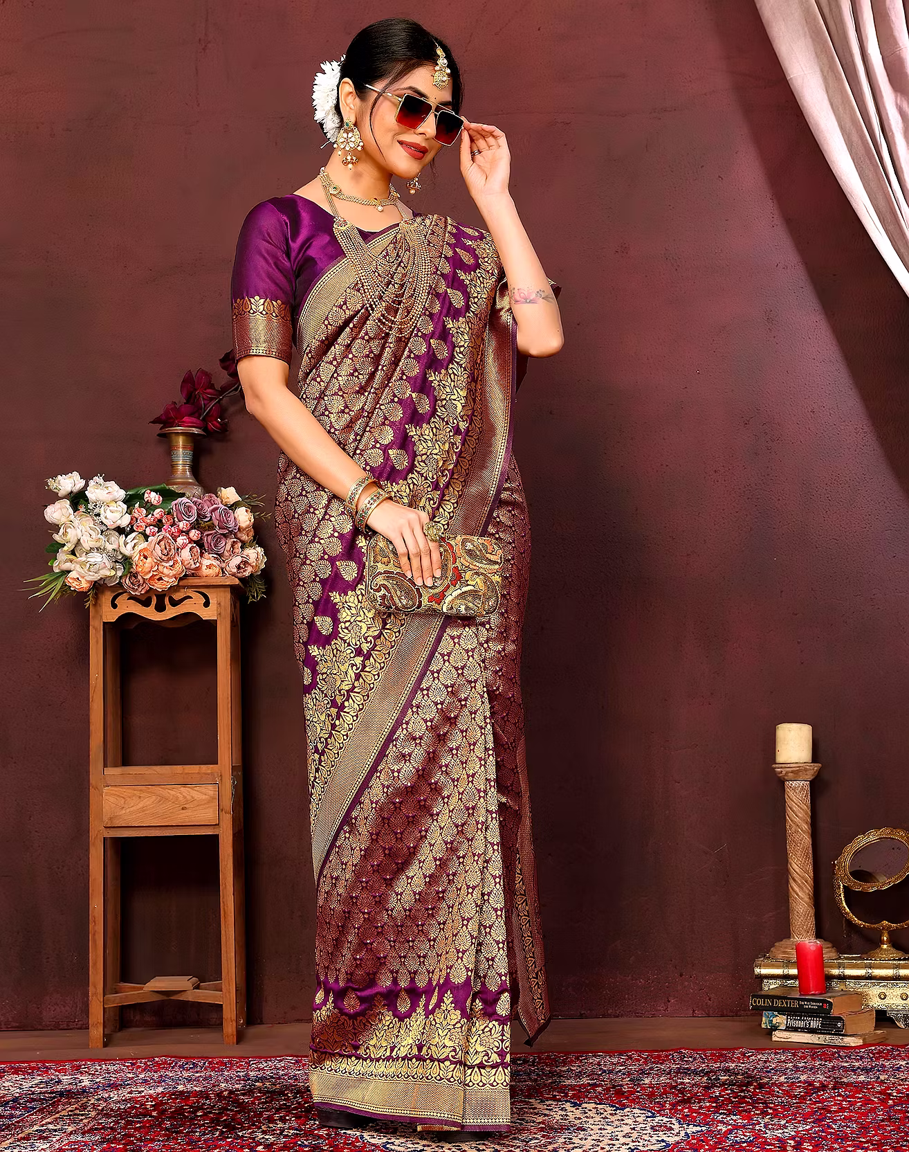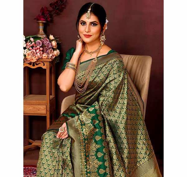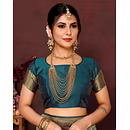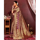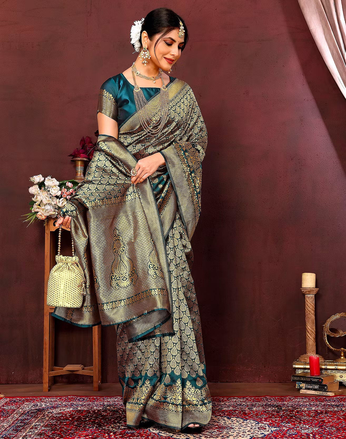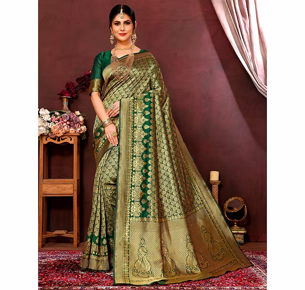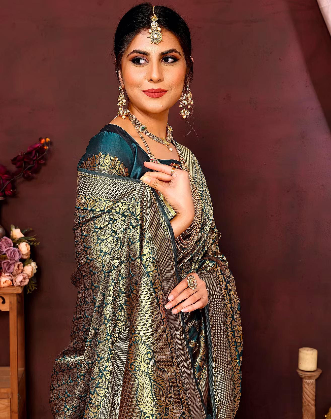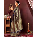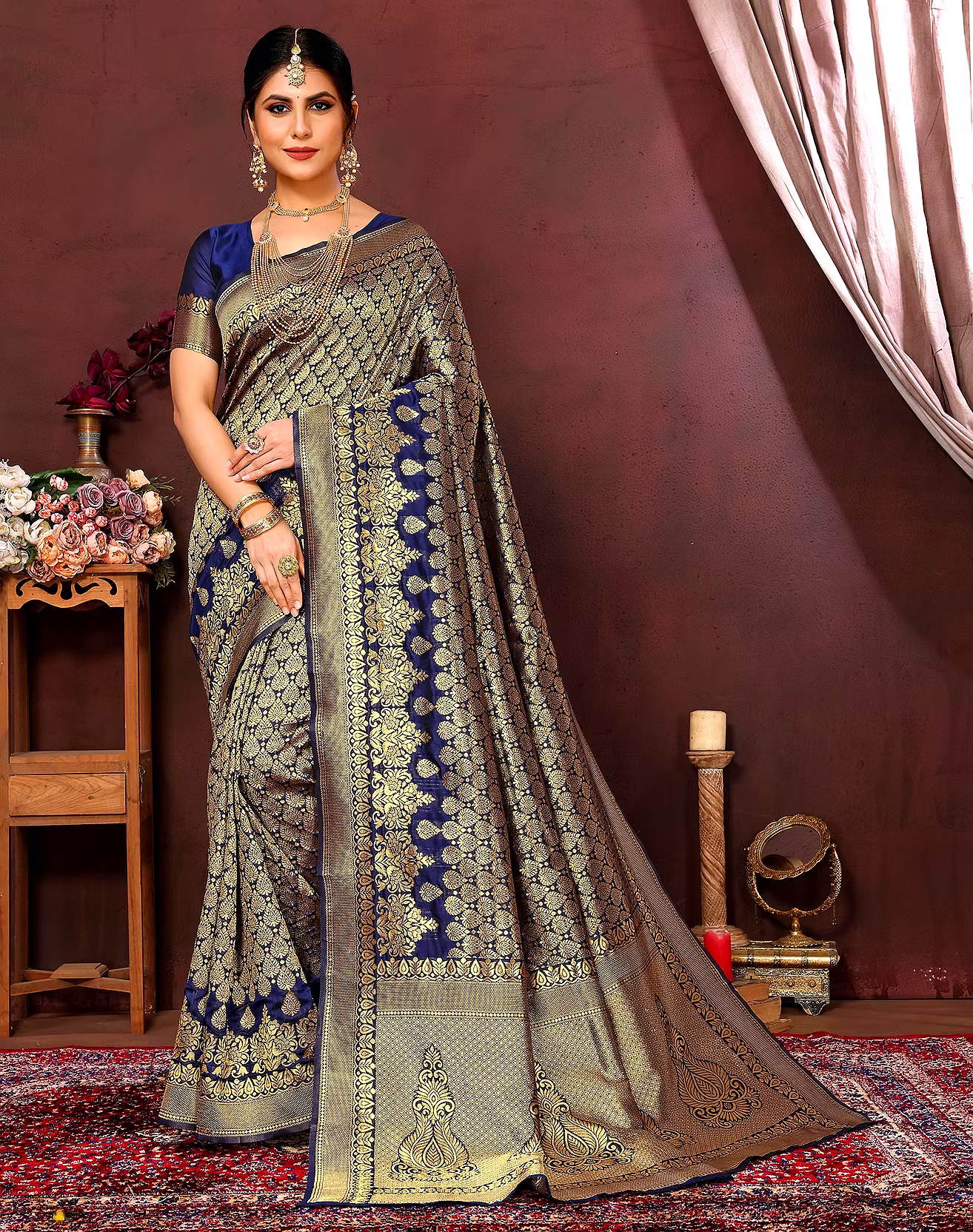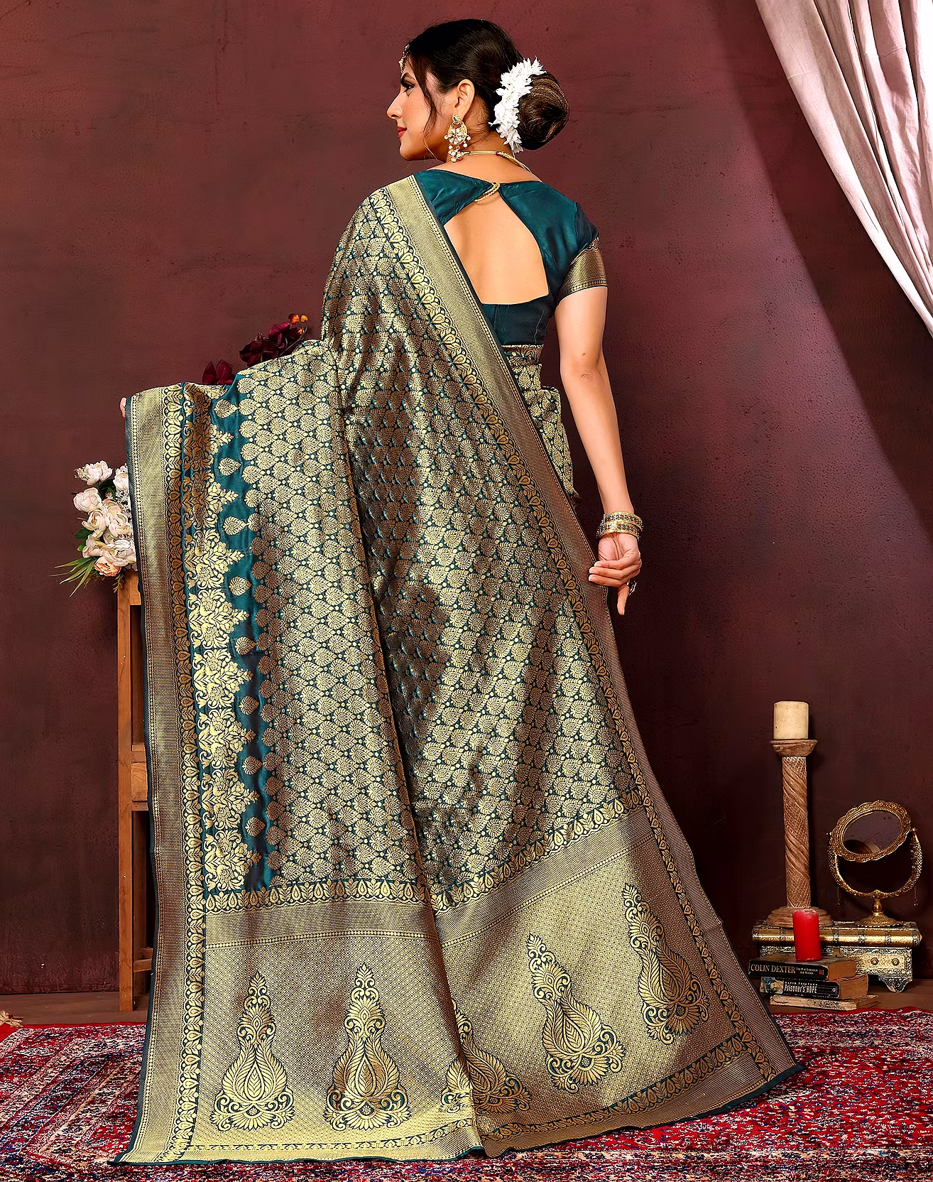 Indulge in the intricate zari motifs and vibrant colors of this Banarasi Kanjivaram Art Silk Saree. It encapsulates the weaving legacies of Banaras and Kanchipuram, exuding a luxurious sheen.