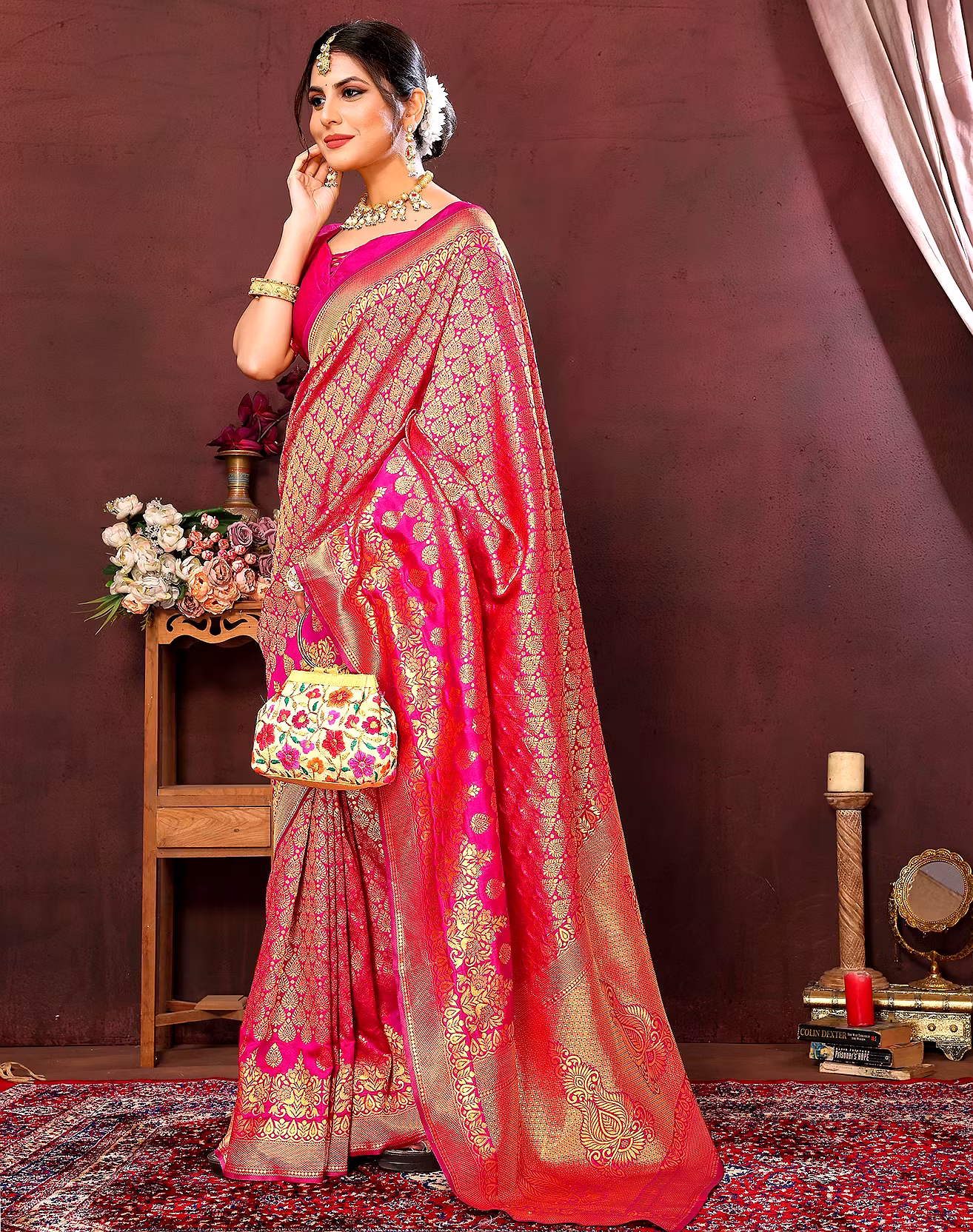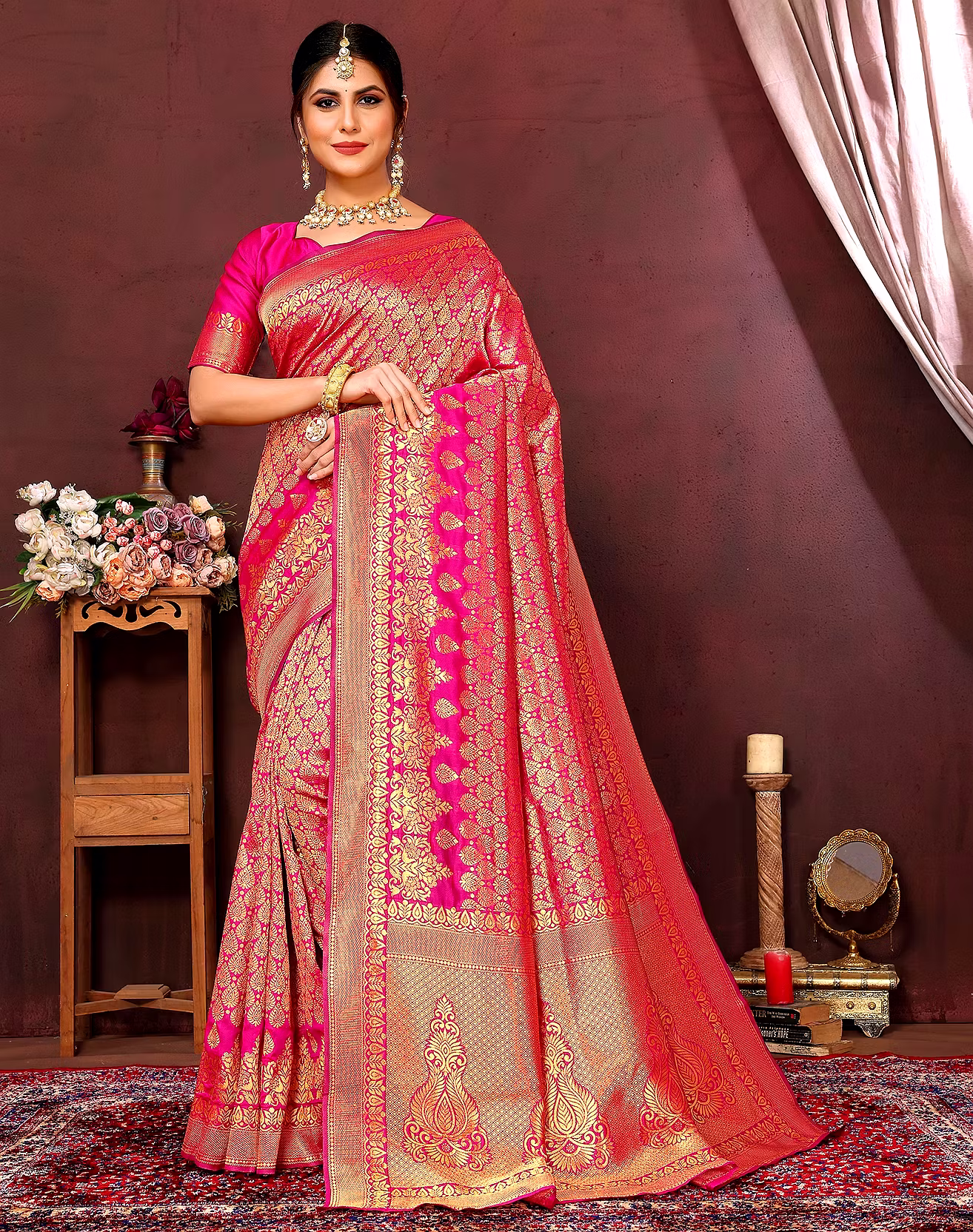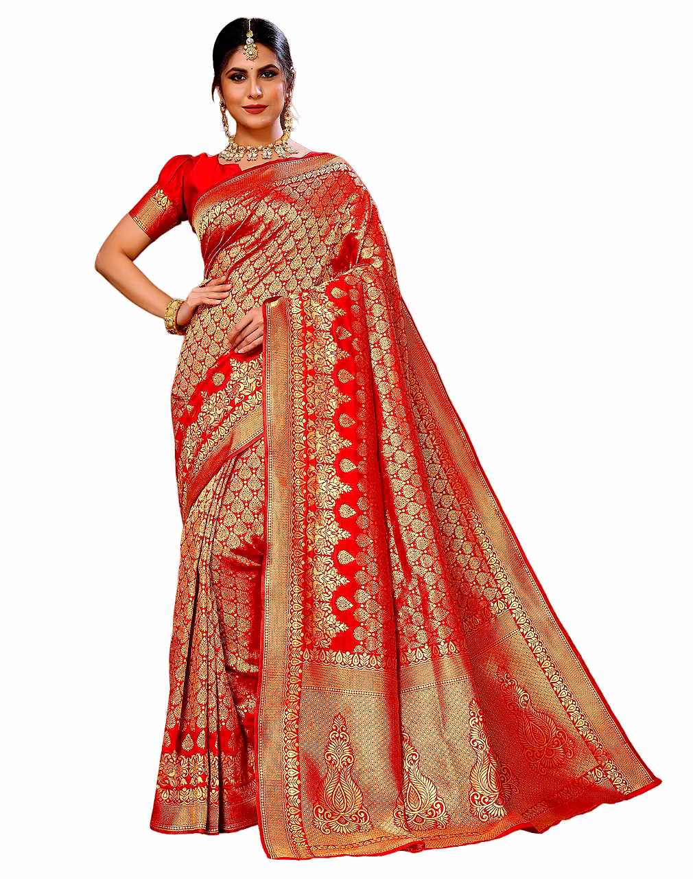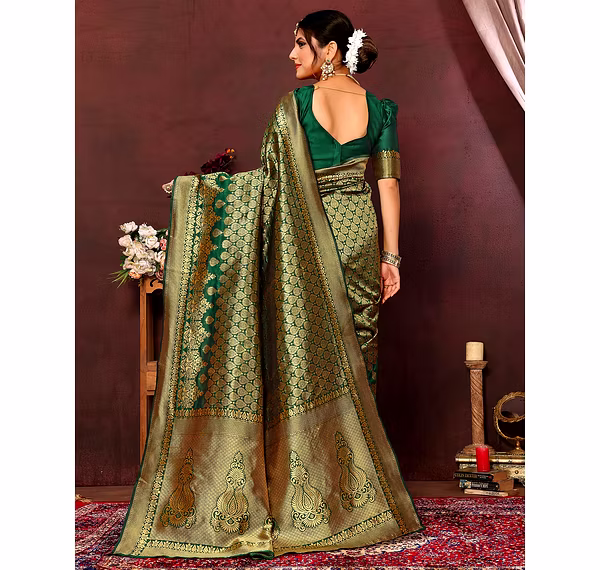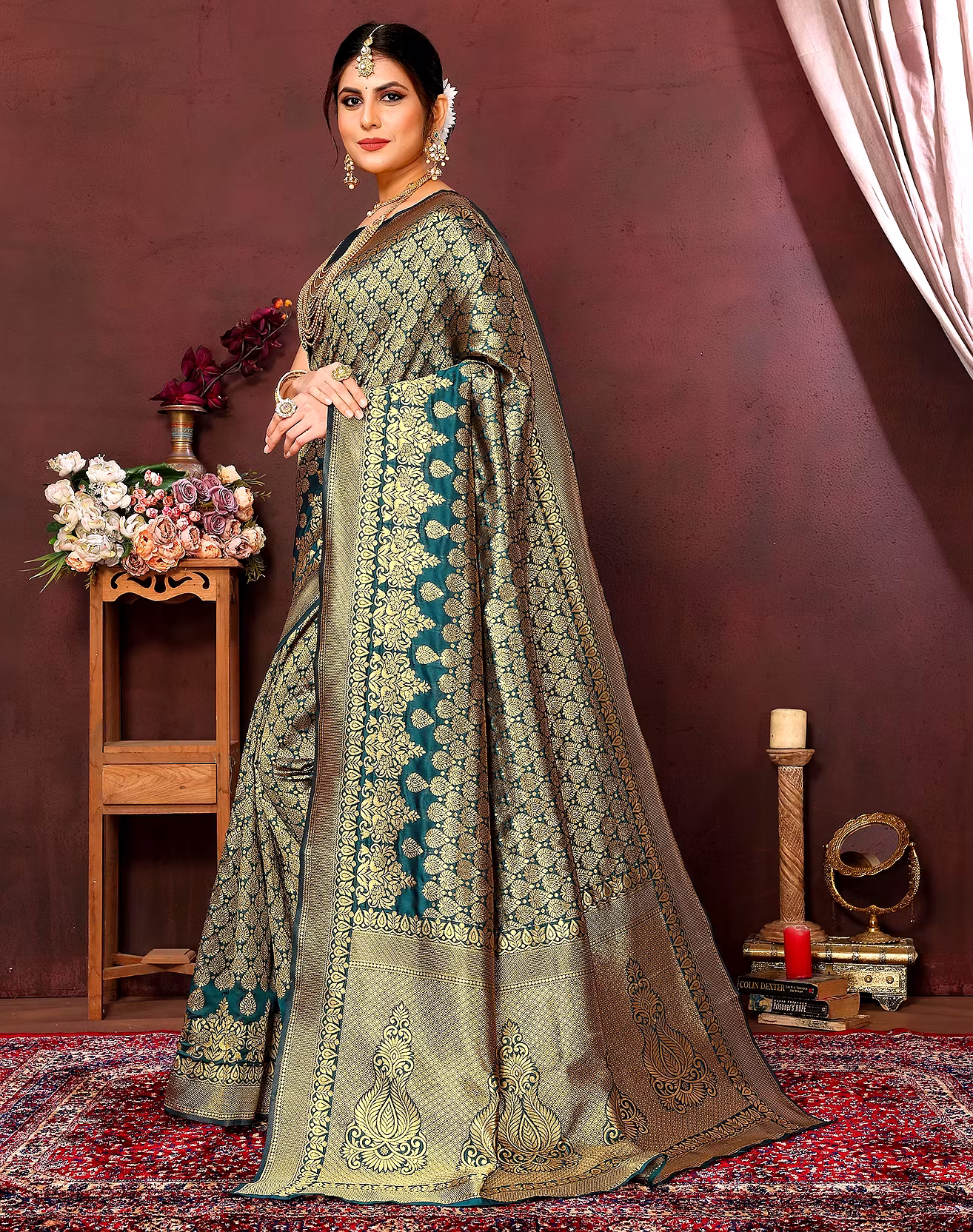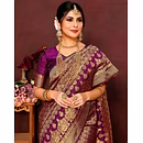 Indulge in the intricate zari motifs and vibrant colors of this Banarasi Kanjivaram Art Silk Saree. It encapsulates the weaving legacies of Banaras and Kanchipuram, exuding a luxurious sheen.