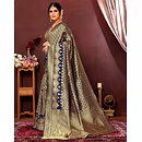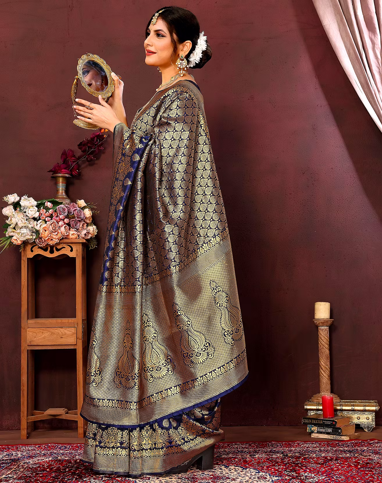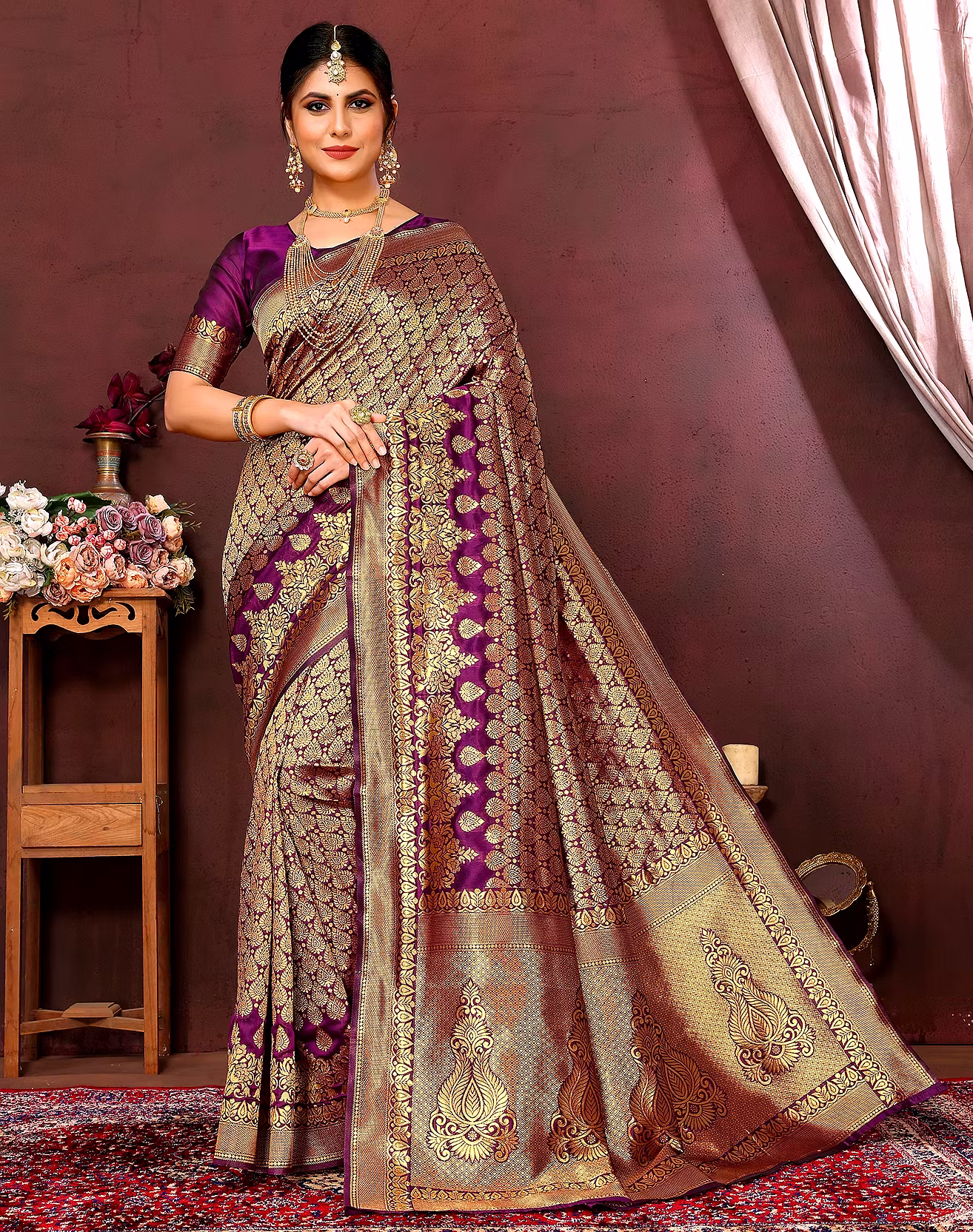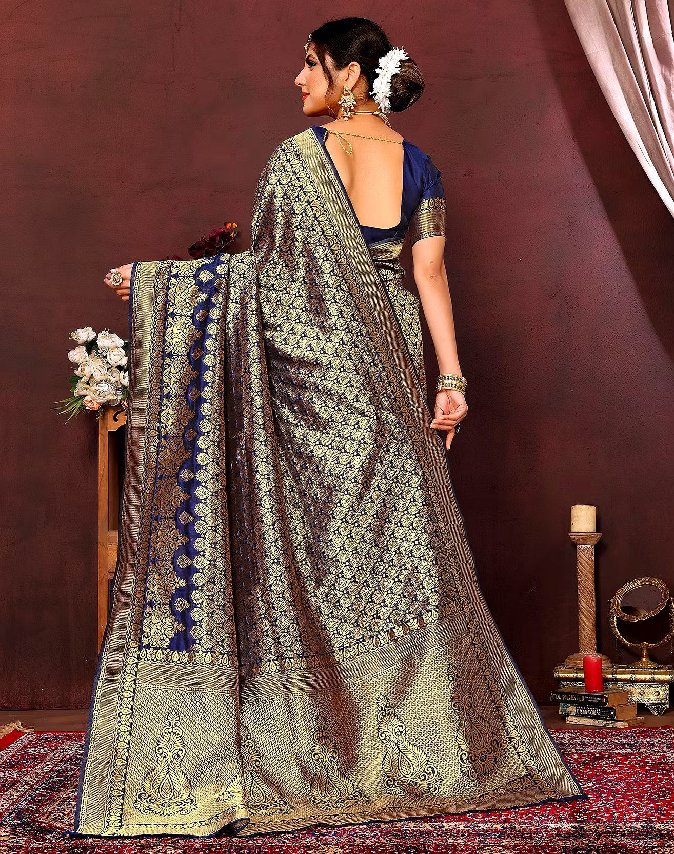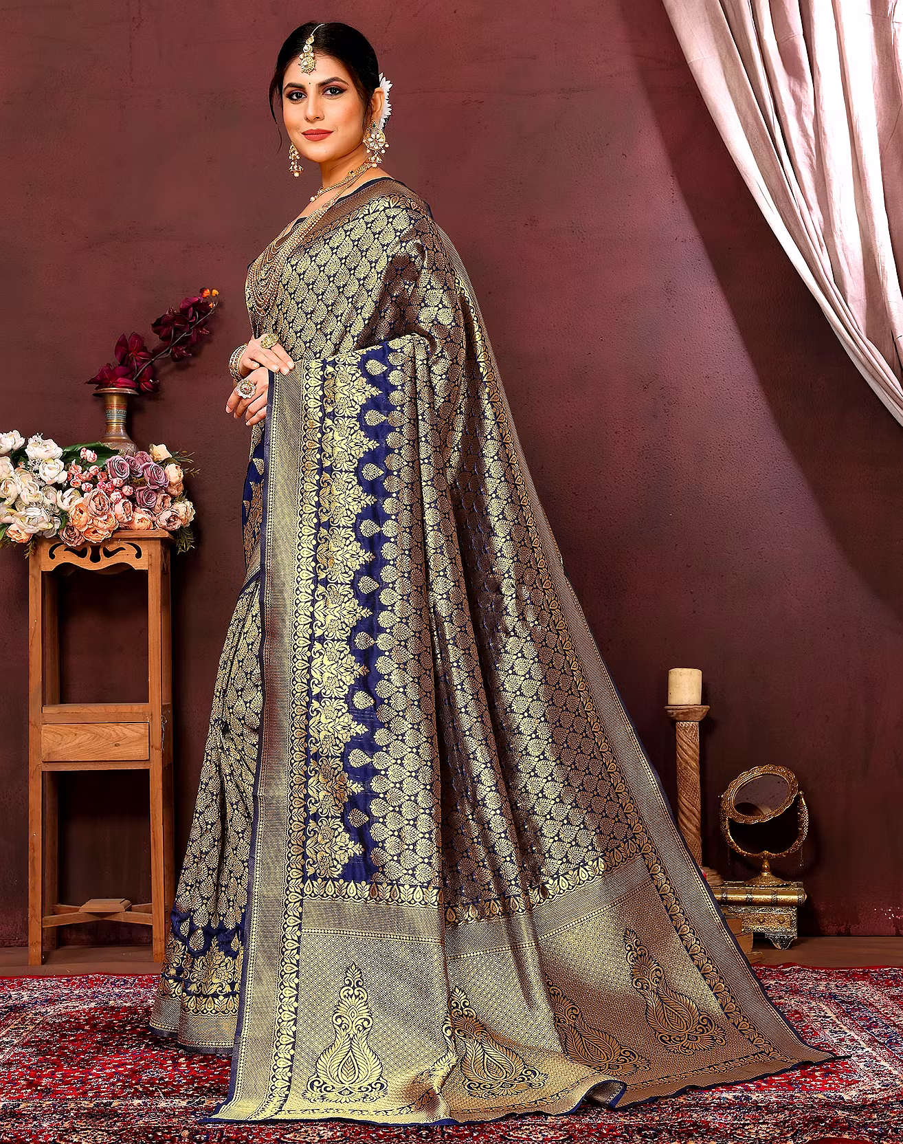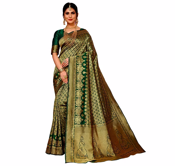 Indulge in the intricate zari motifs and vibrant colors of this Banarasi Kanjivaram Art Silk Saree. It encapsulates the weaving legacies of Banaras and Kanchipuram, exuding a luxurious sheen.