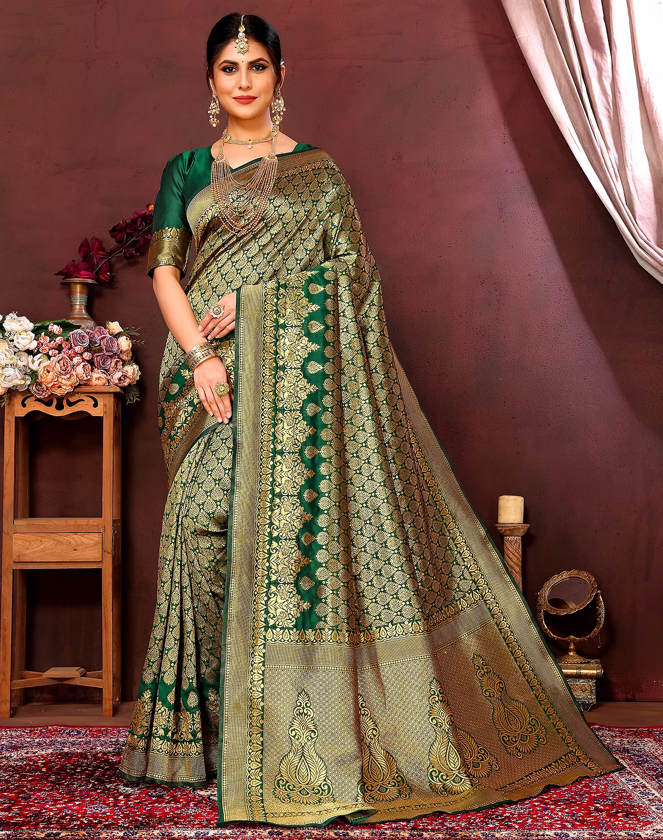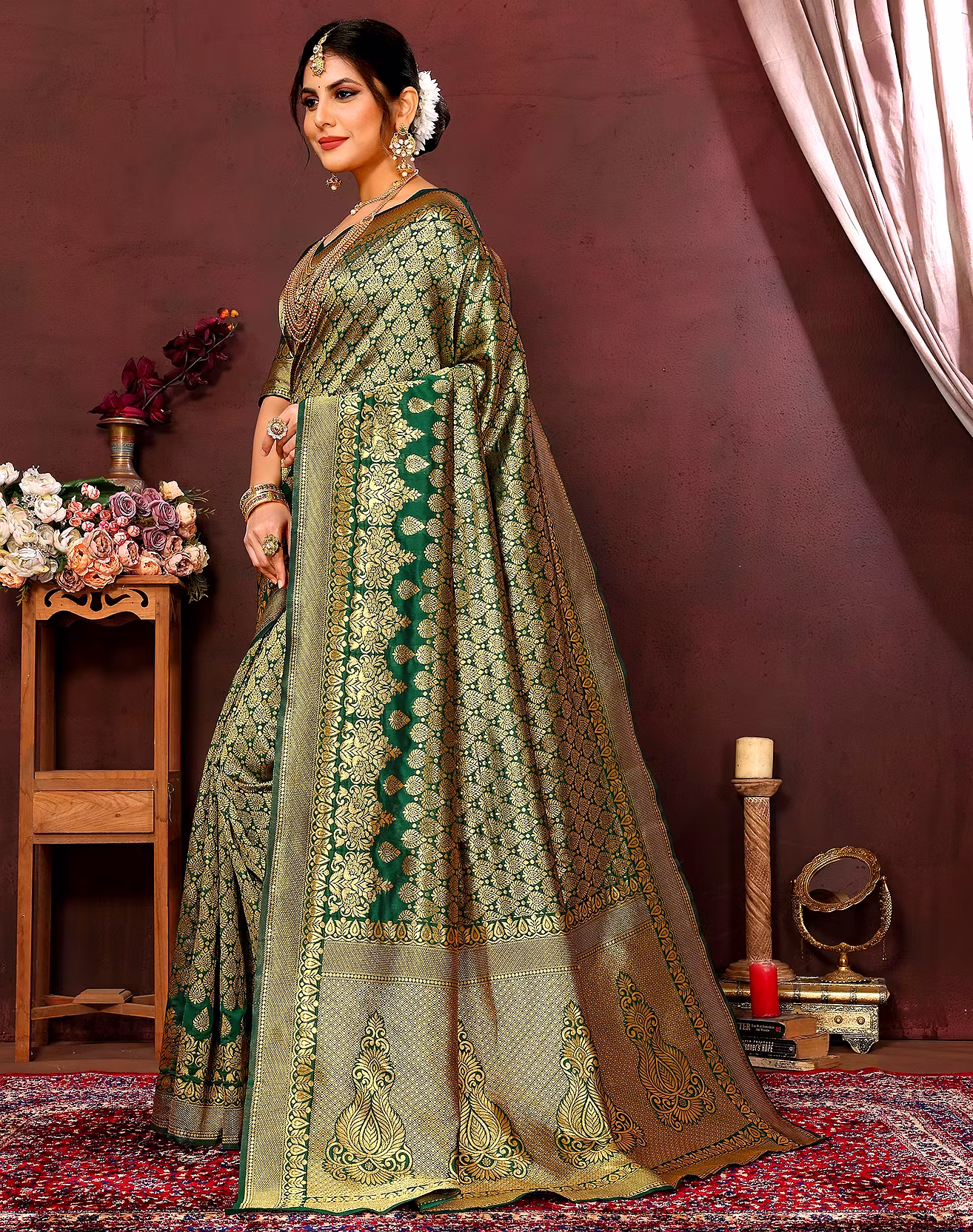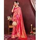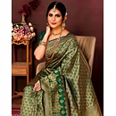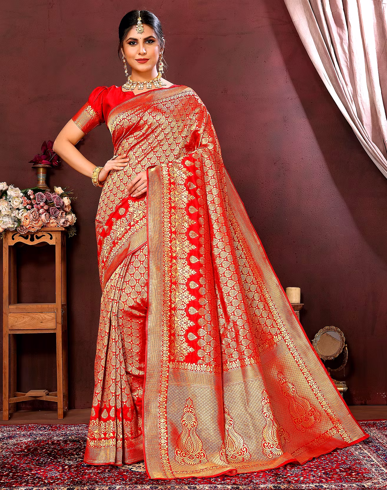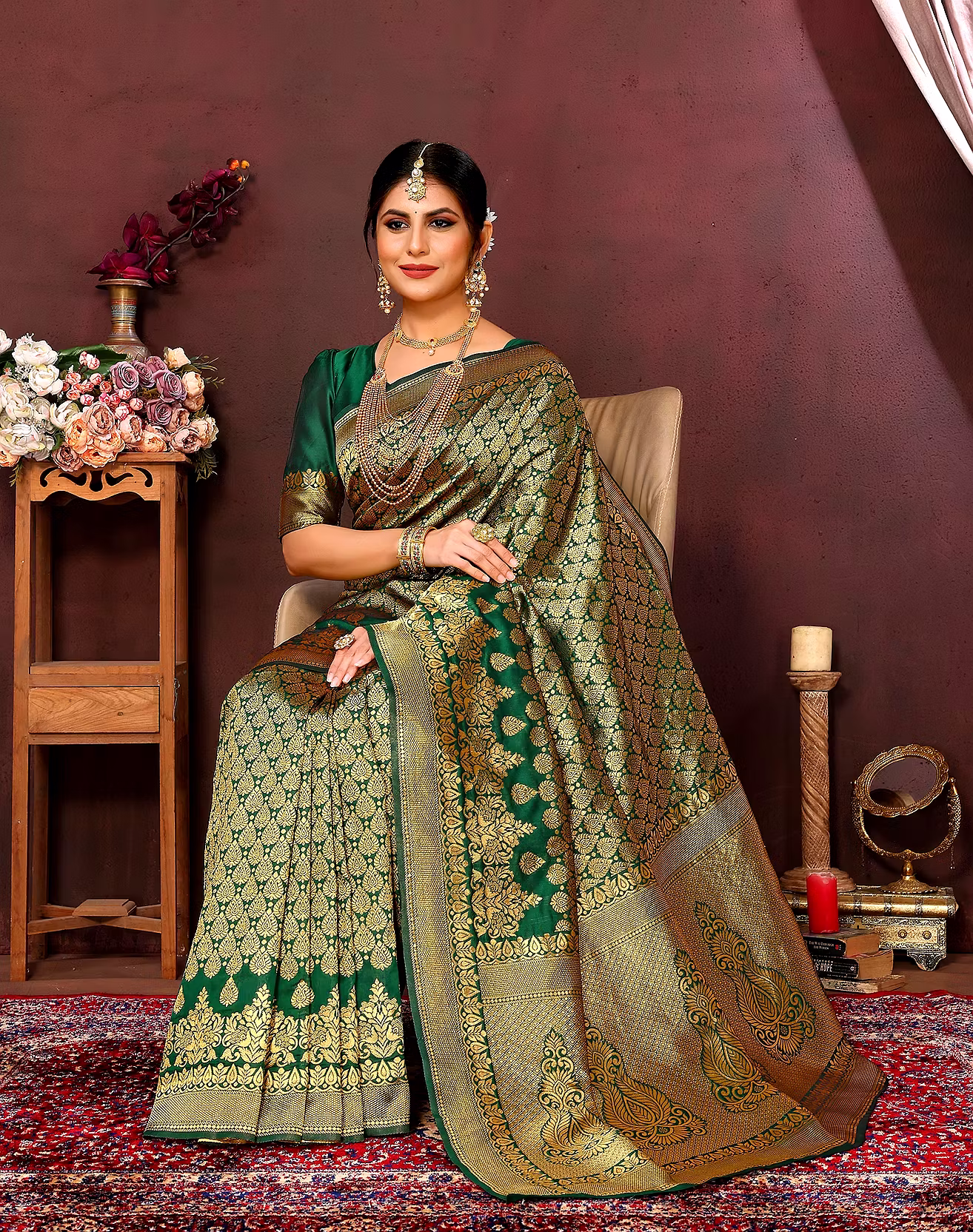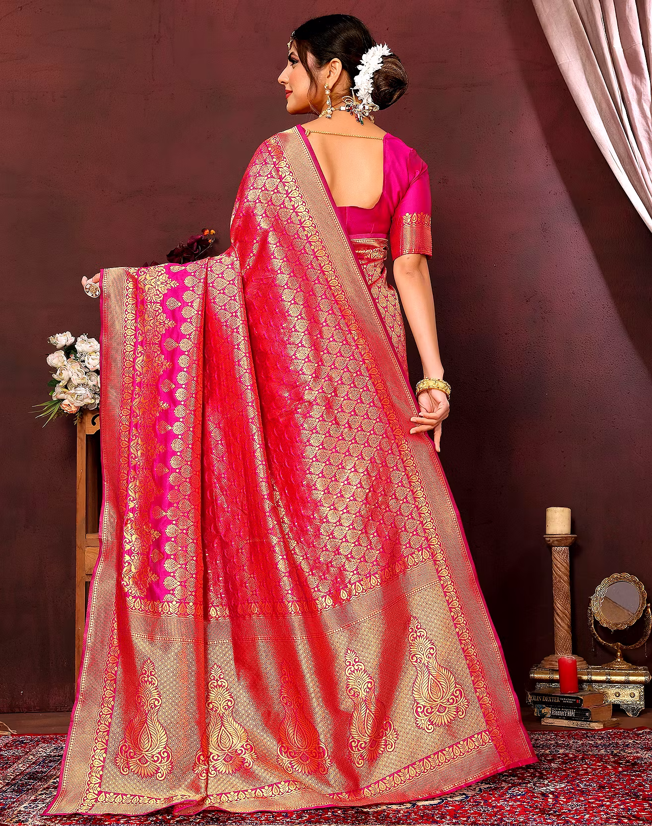 Indulge in the intricate zari motifs and vibrant colors of this Banarasi Kanjivaram Art Silk Saree. It encapsulates the weaving legacies of Banaras and Kanchipuram, exuding a luxurious sheen.