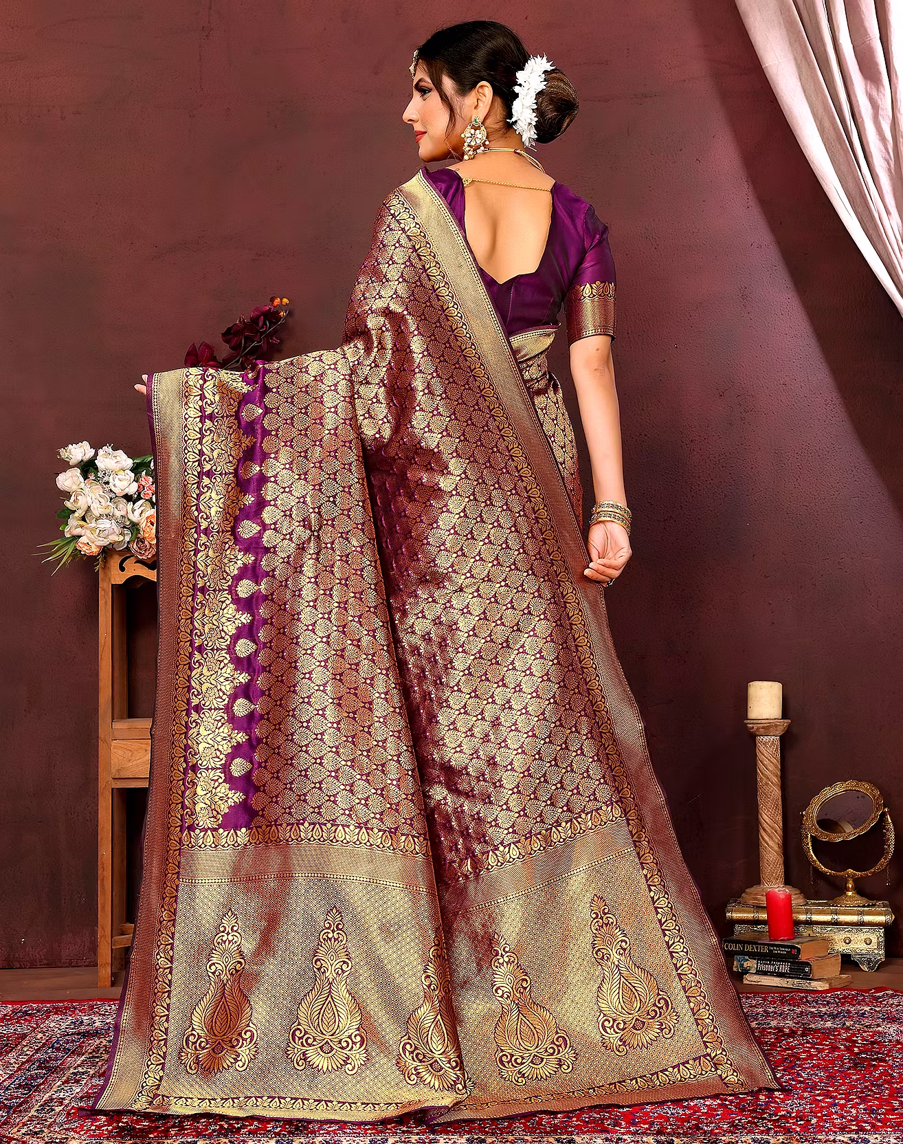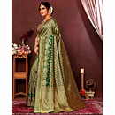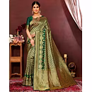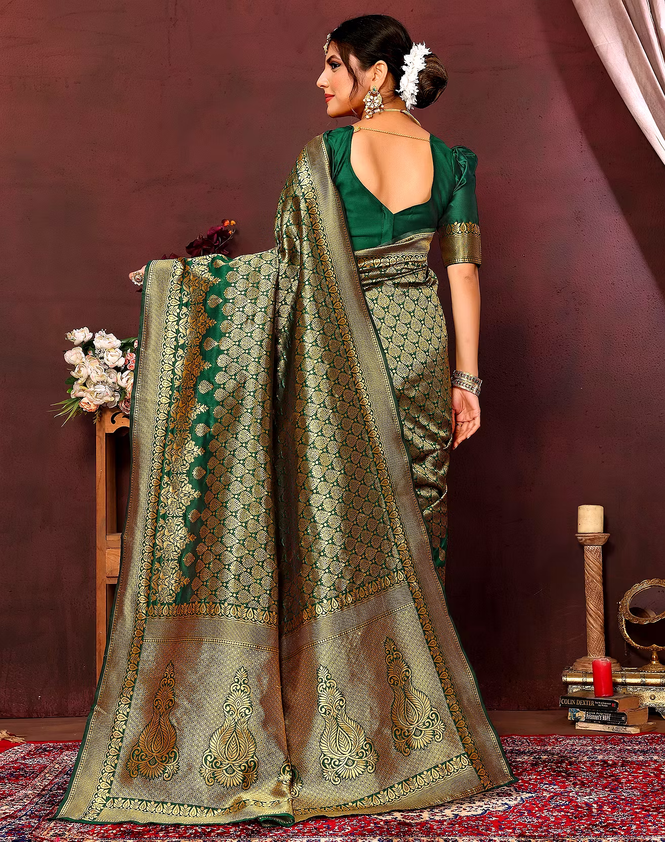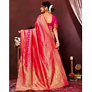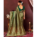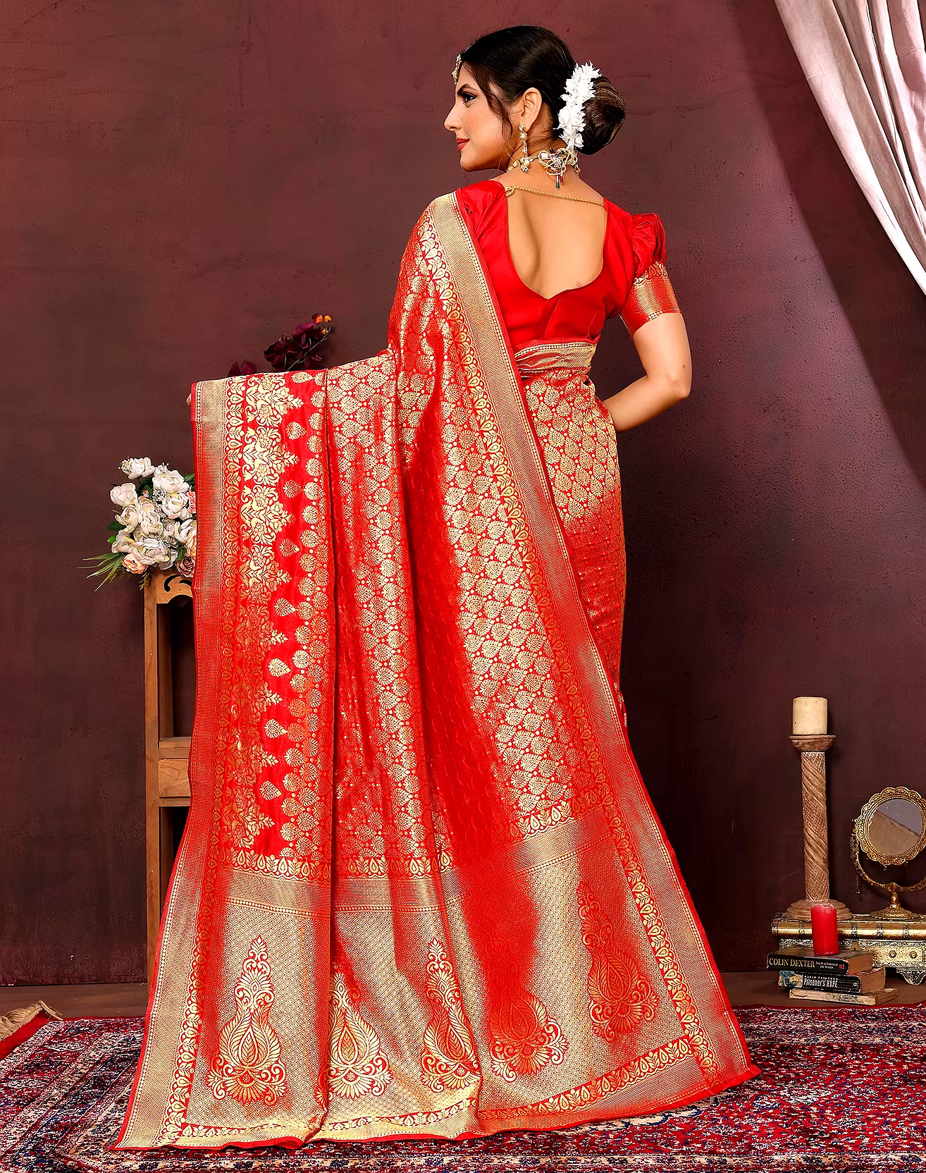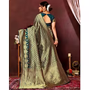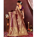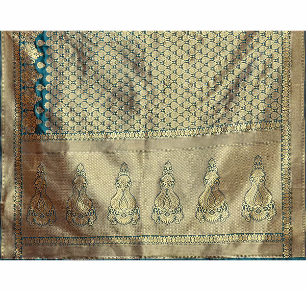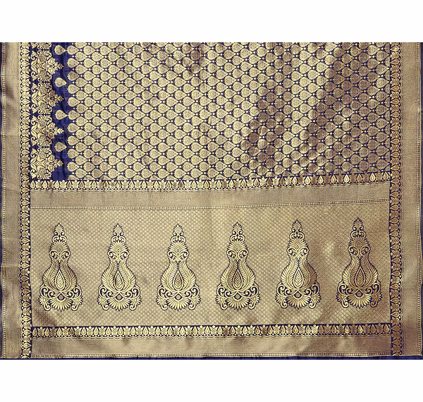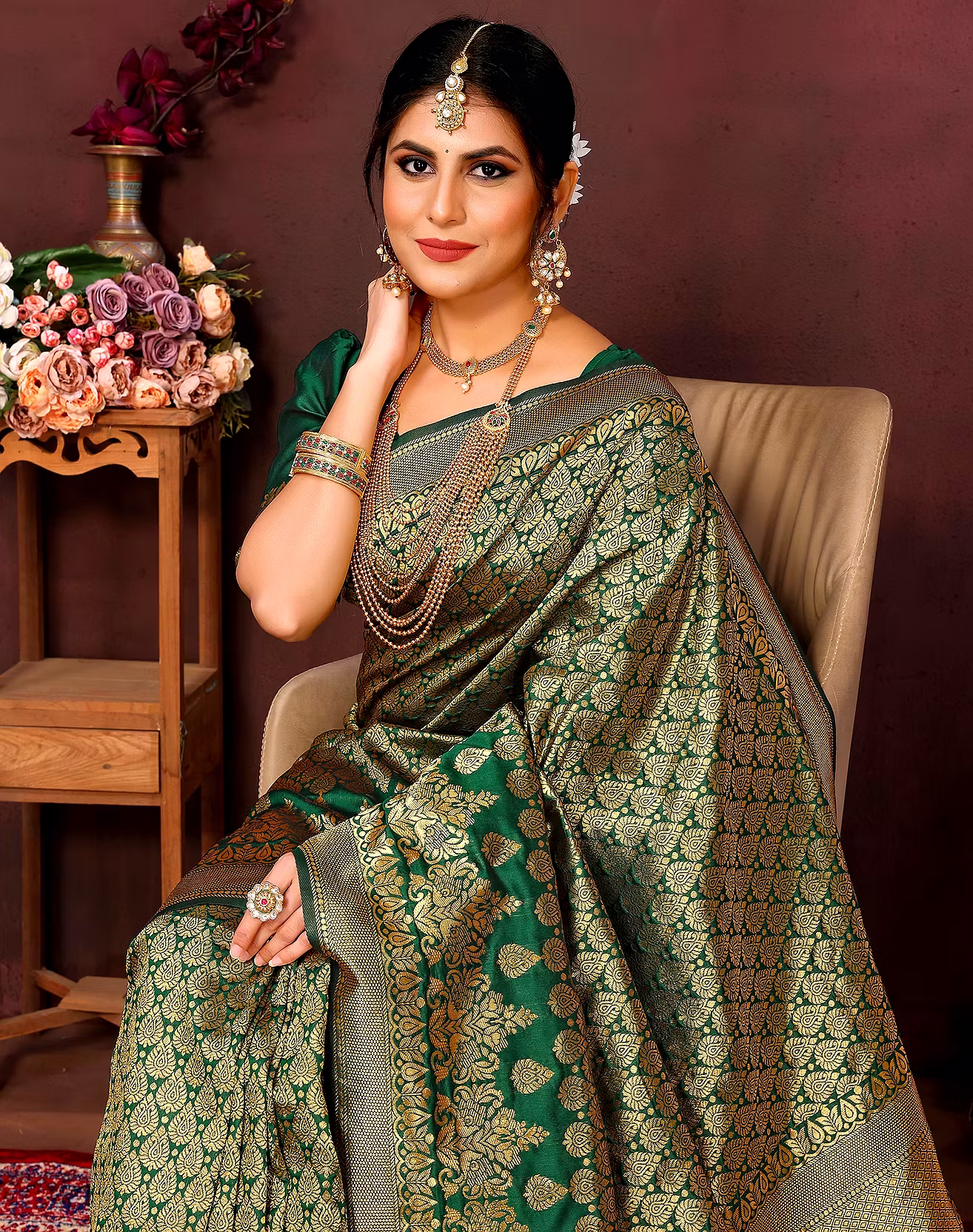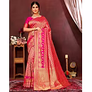Indulge in the intricate zari motifs and vibrant colors of this Banarasi Kanjivaram Art Silk Saree. It encapsulates the weaving legacies of Banaras and Kanchipuram, exuding a luxurious sheen.