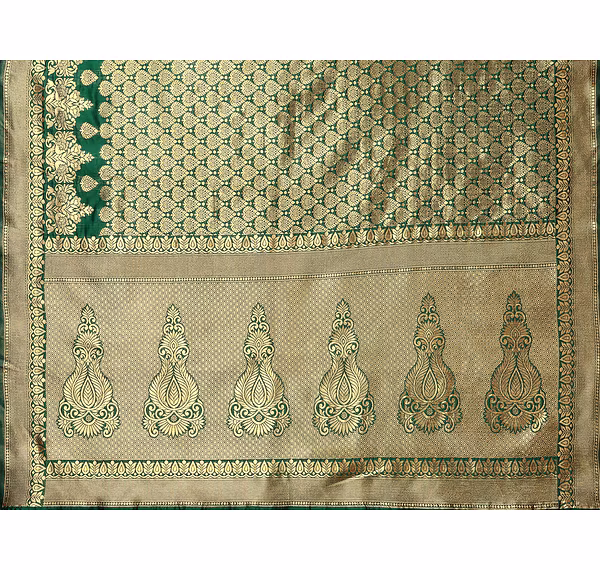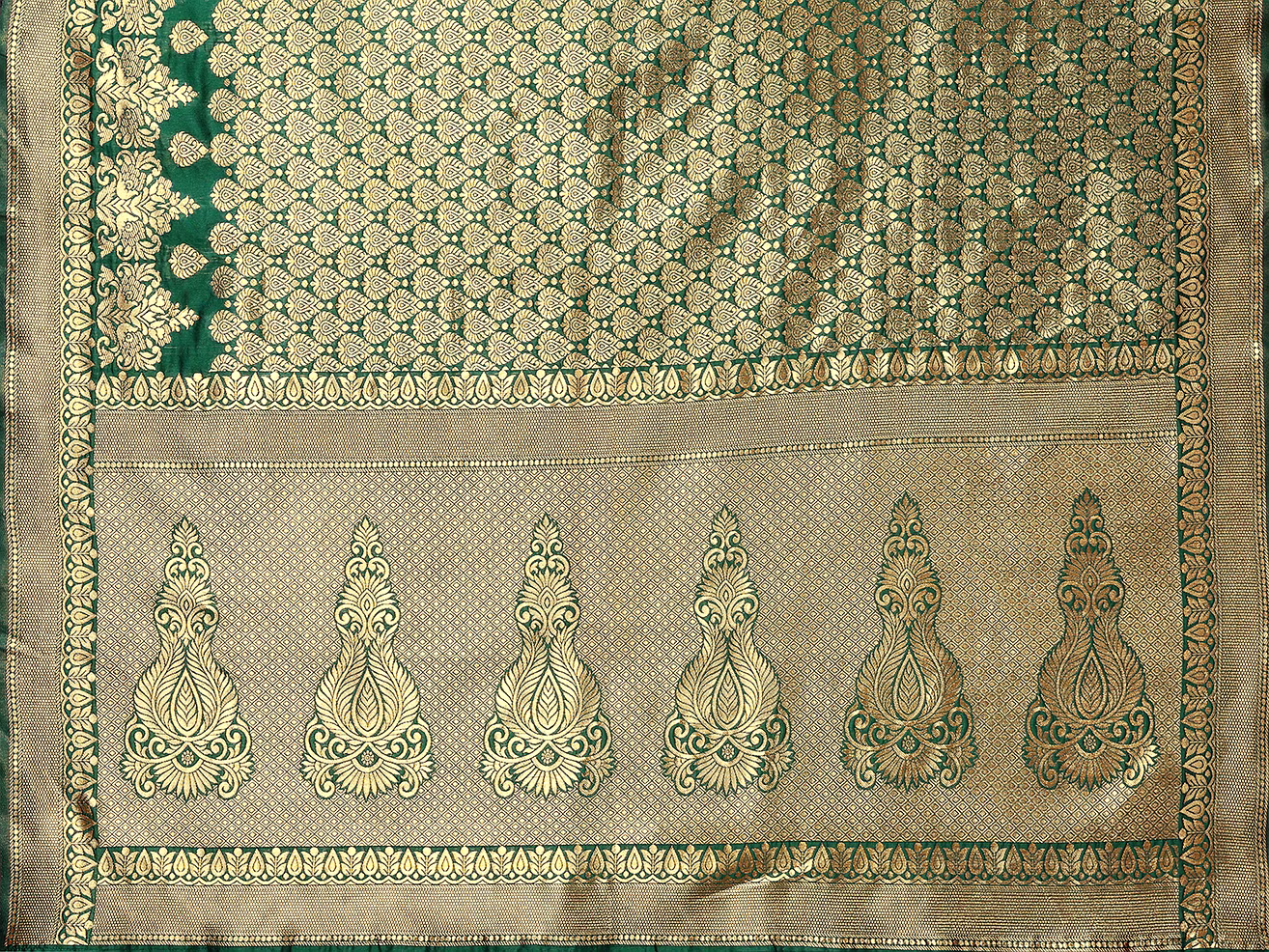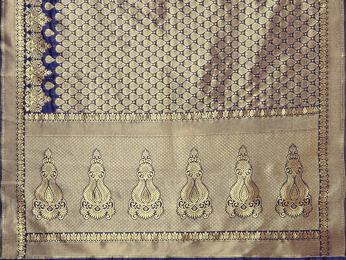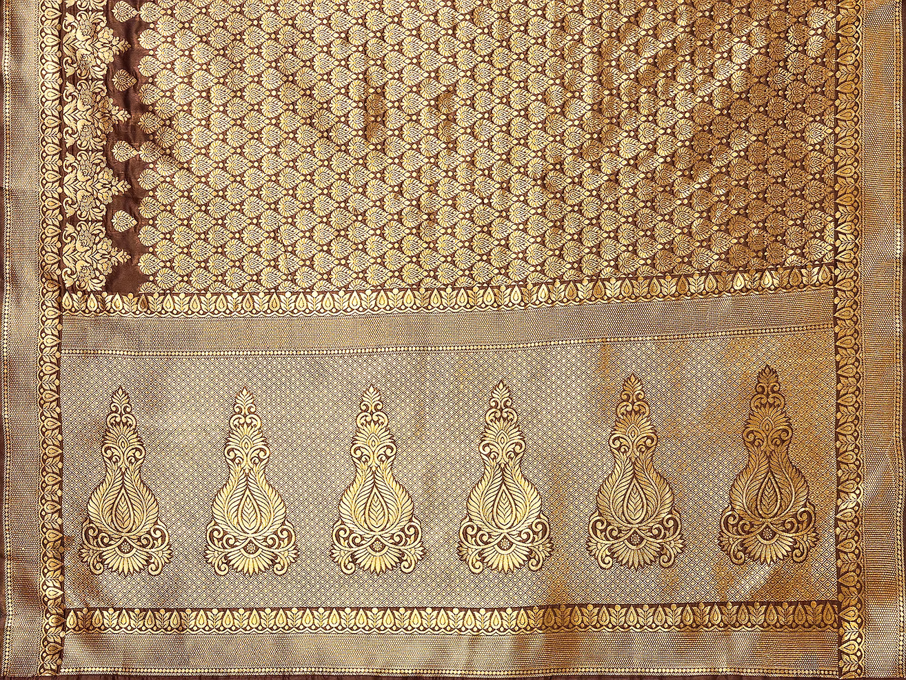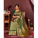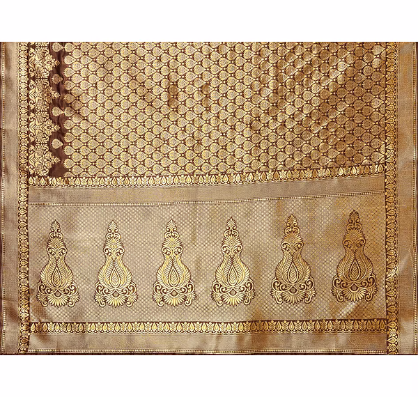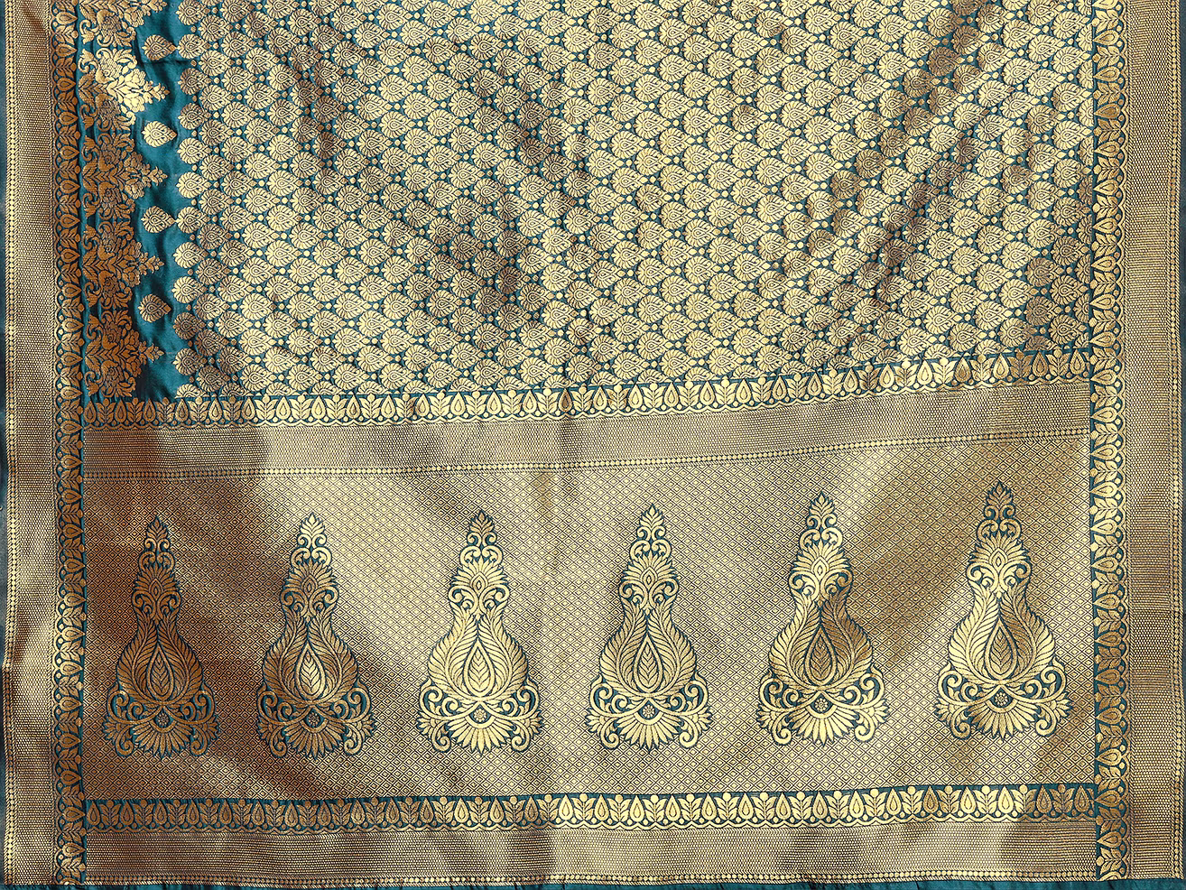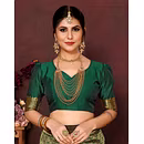 Indulge in the intricate zari motifs and vibrant colors of this Banarasi Kanjivaram Art Silk Saree. It encapsulates the weaving legacies of Banaras and Kanchipuram, exuding a luxurious sheen.