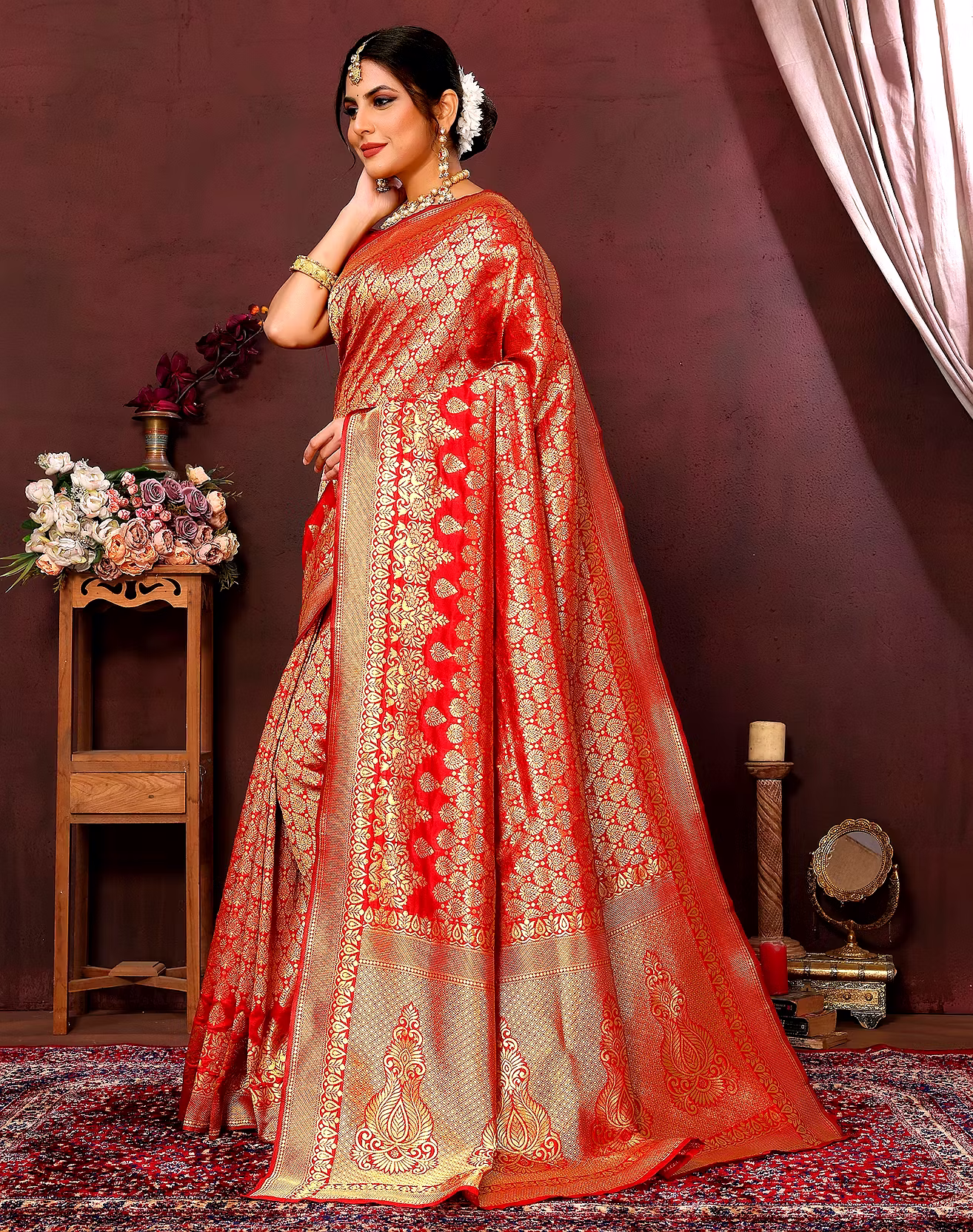 Crafted from premium art silk, this saree combines the grandeur of silk with enhanced durability and easy maintenance. The royal Banarasi-inspired patterns on the pallu and border elevate its charm.