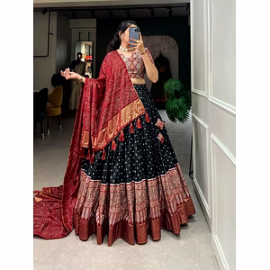 Lehenga(Stitched)Lehenga Fabric : Dola SilkLehenga Work : Bandhani And Ajarakh Print With Foil WorkLehenga Waist : SUPPORTED UP TO 42Lehenga Closer : Drawstring With Heavy Tassels and ZipStitching : Stitched With Canvas and attached with Can CanLength : 42Flair : 3.60 MeterInner : Micro CottonBlouse(Unstitched)Blouse fabric : Dola SilkBlouse Work : Ajarakh Print With foil workBlouse Length : 0.80 MeterDupattaDupatta Fabric : Dola SilkDupatta Work : Bandhani Print with Gotta Patti Lace Border also comes with tasselsDupatta Length : 2.5 MeterPackage Contain : Lehenga, Blouse, Dupatta, Drawstring with Zip, TasselsWeight : 1.250 KG Designed for international appeal, this top delivers both elegance and export-ready quality.