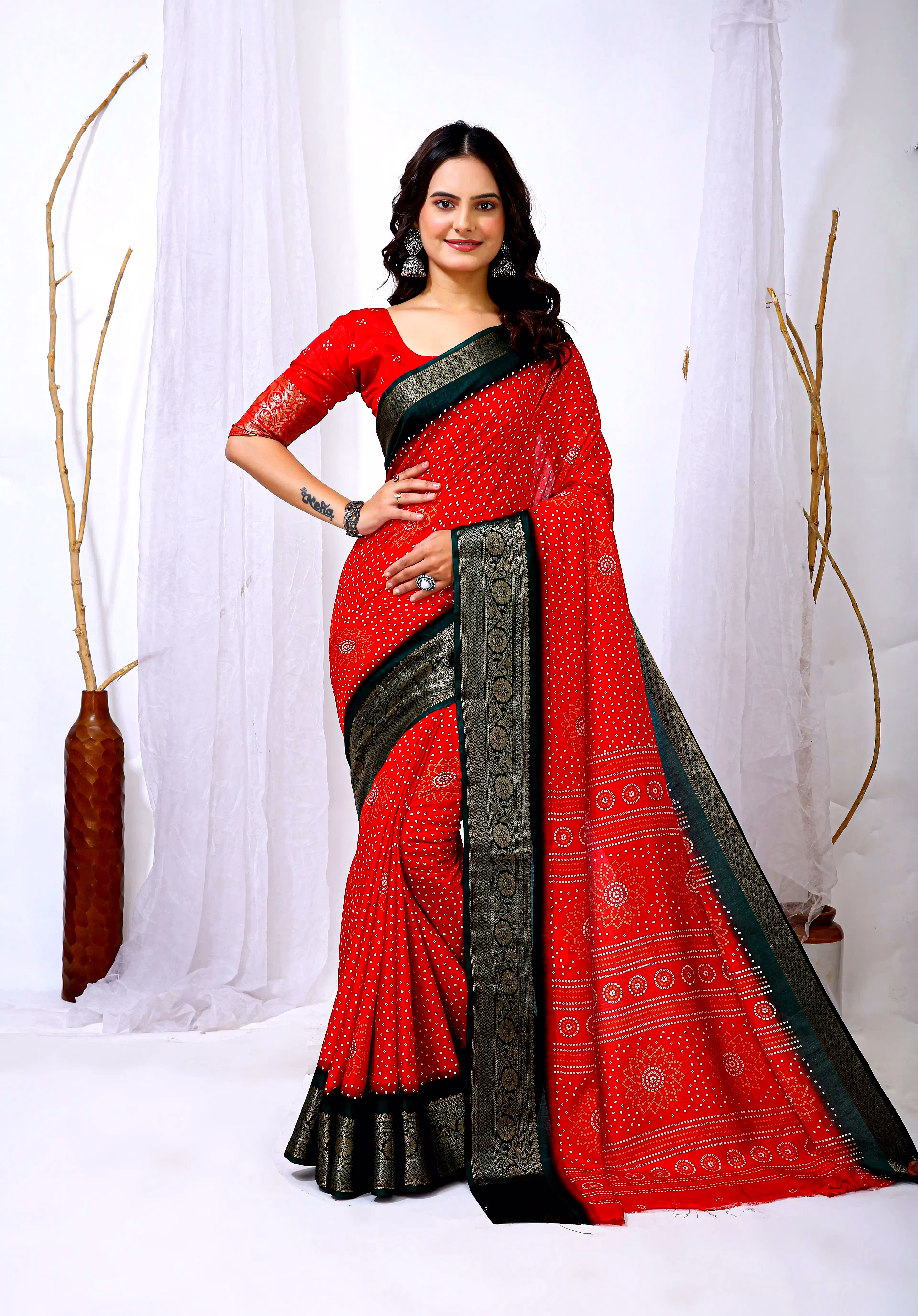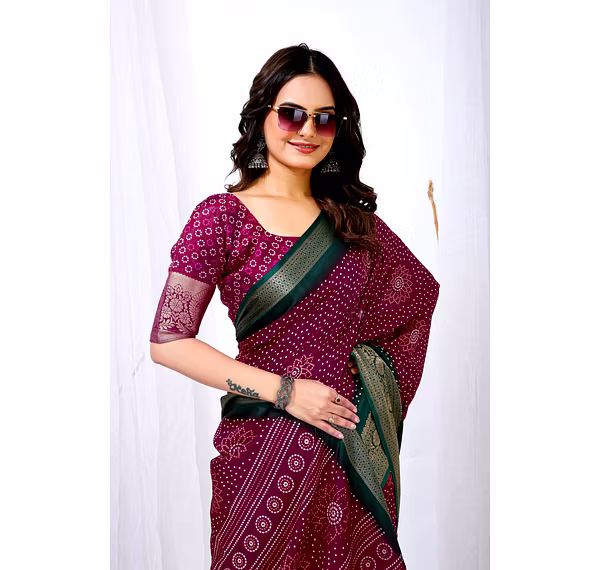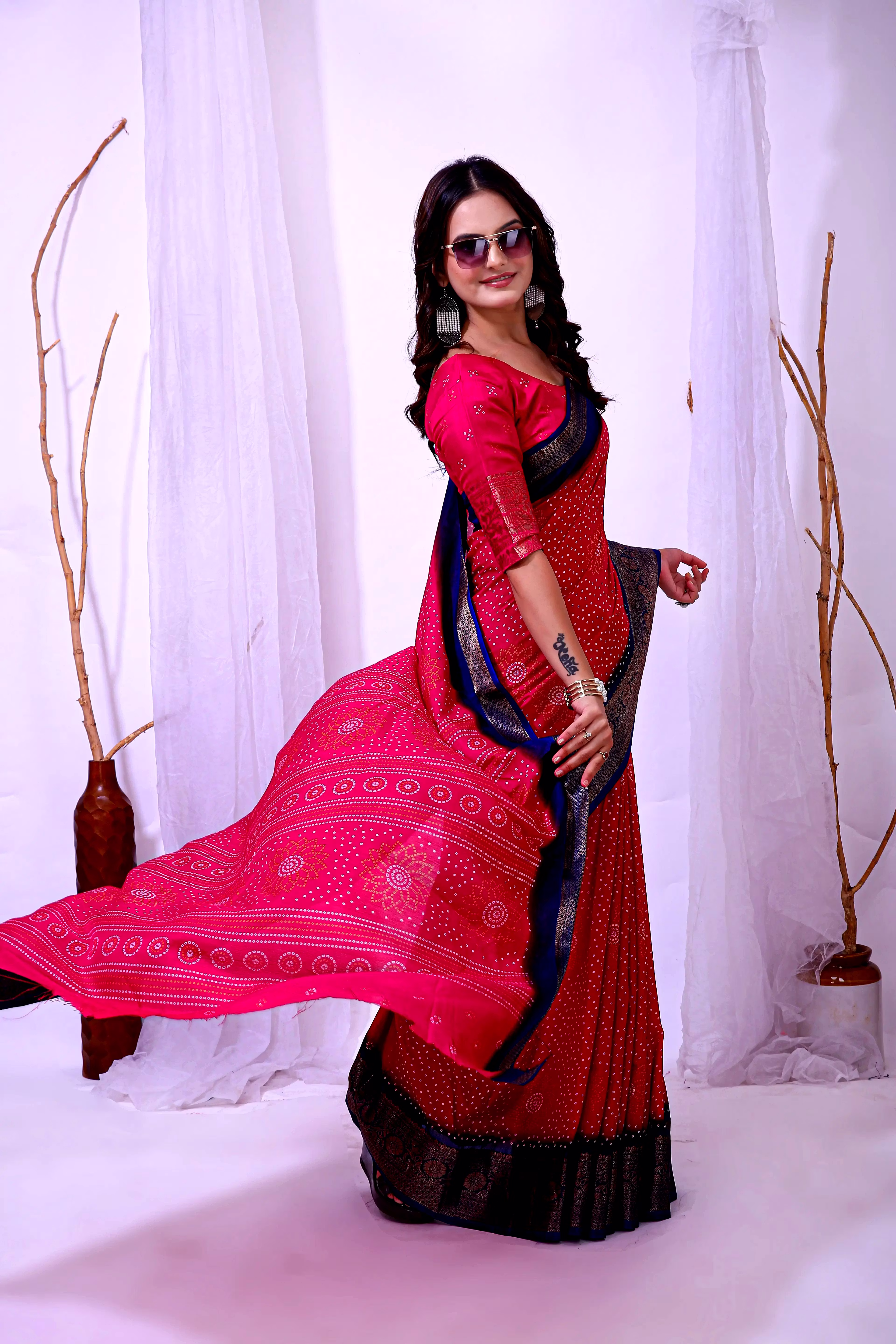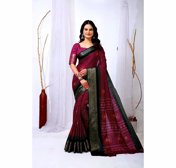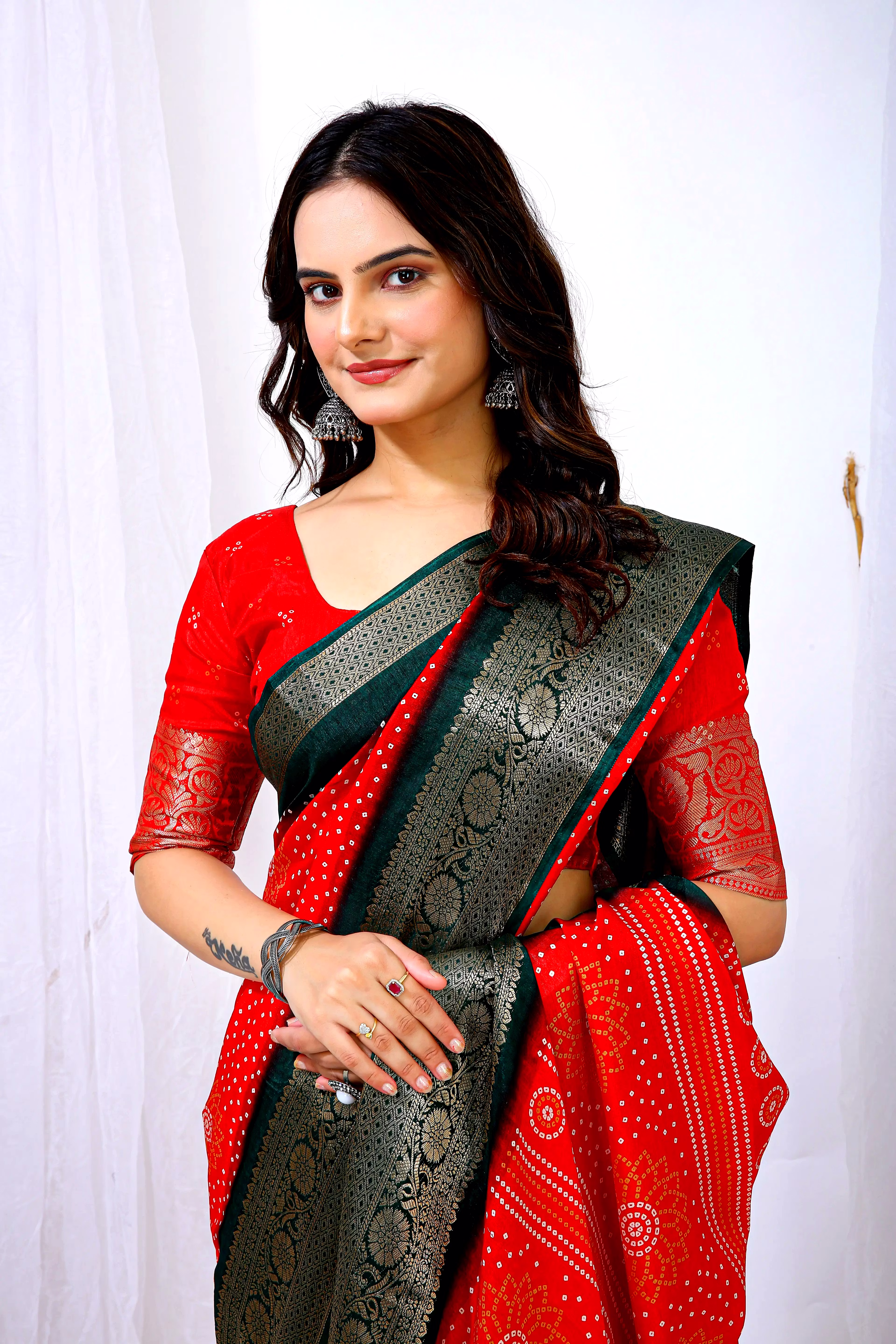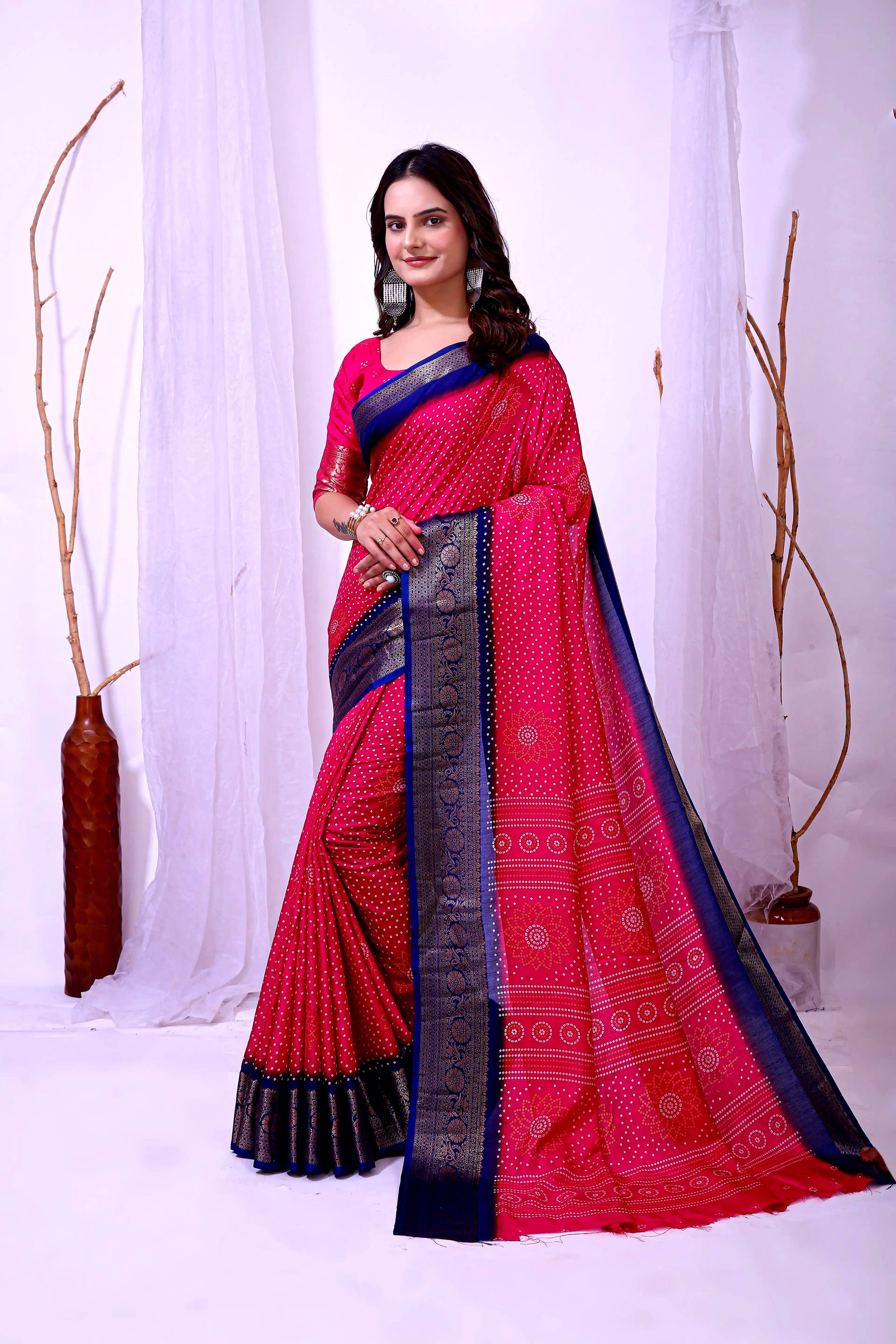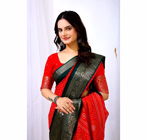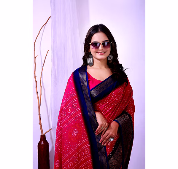 The classic beauty of the Bandhani is framed by a gorgeous Zari border saree, adding a layer of sophisticated sparkle that elevates the entire look. The traditional golden weaving provides the perfect contrast to the bright, festive prints, ensuring this silk saree with Zari border stands out in any crowd. Whether you're attending a wedding, a religious ceremony, or a grand festival, this Bandhani print saree gives you an aura of elegance and cultural richness that is truly captivating.