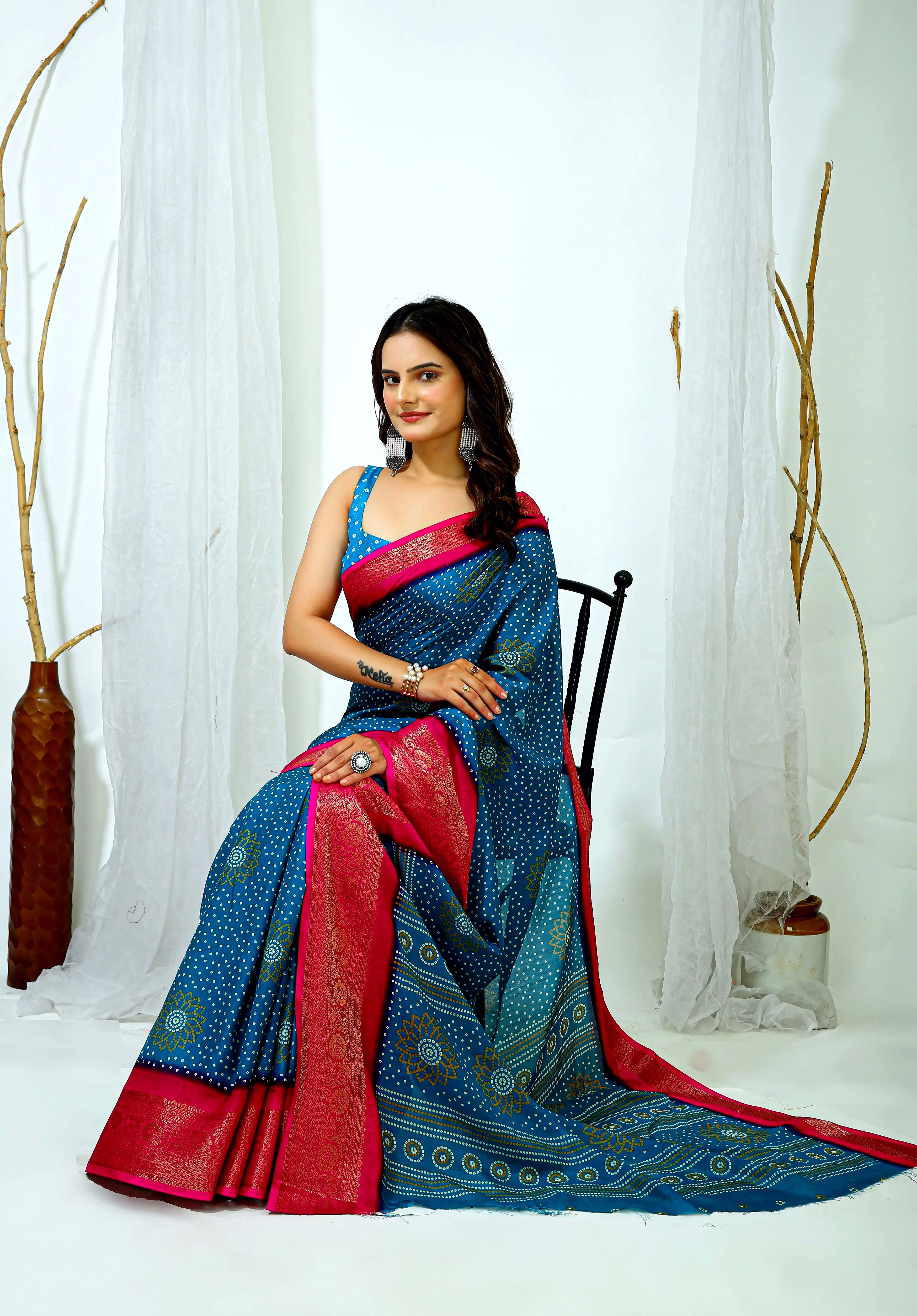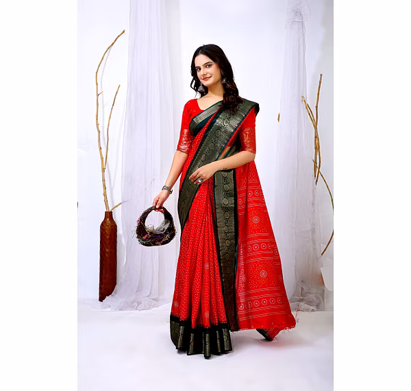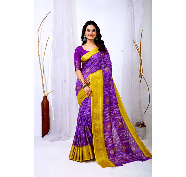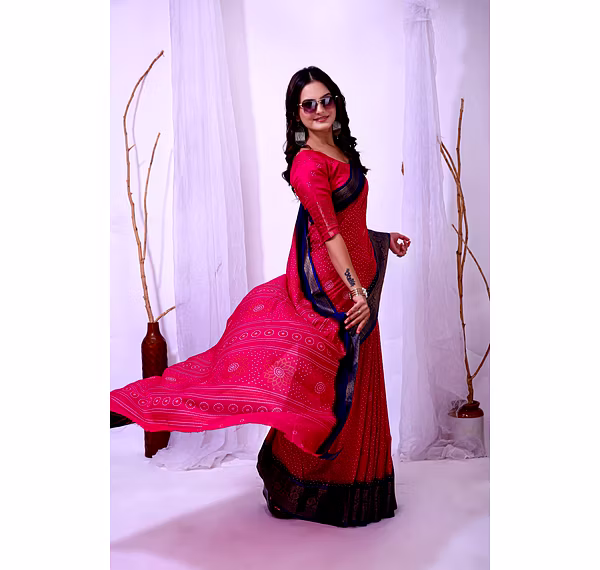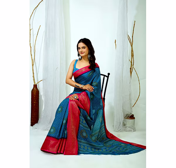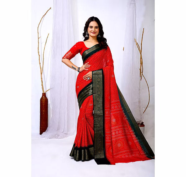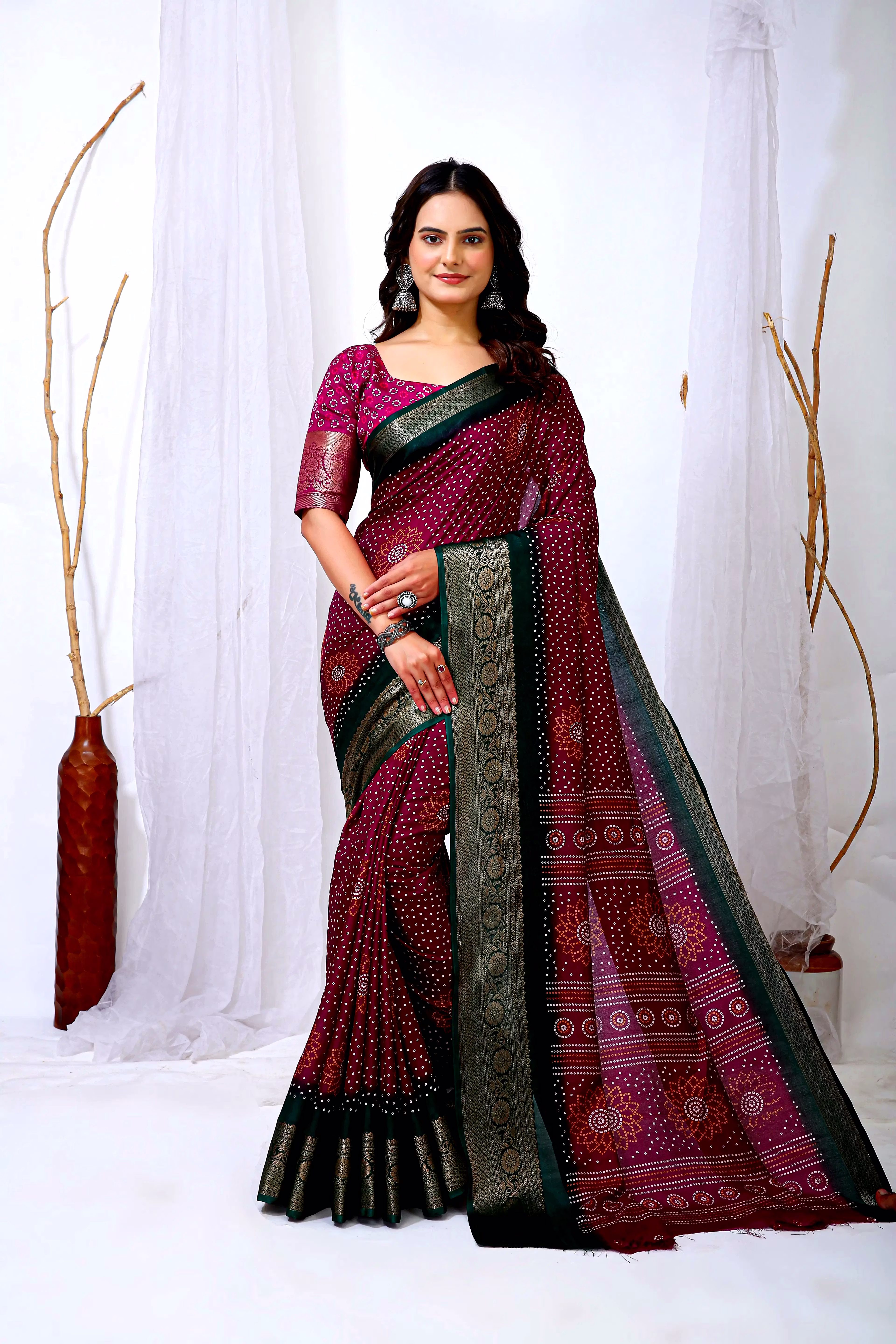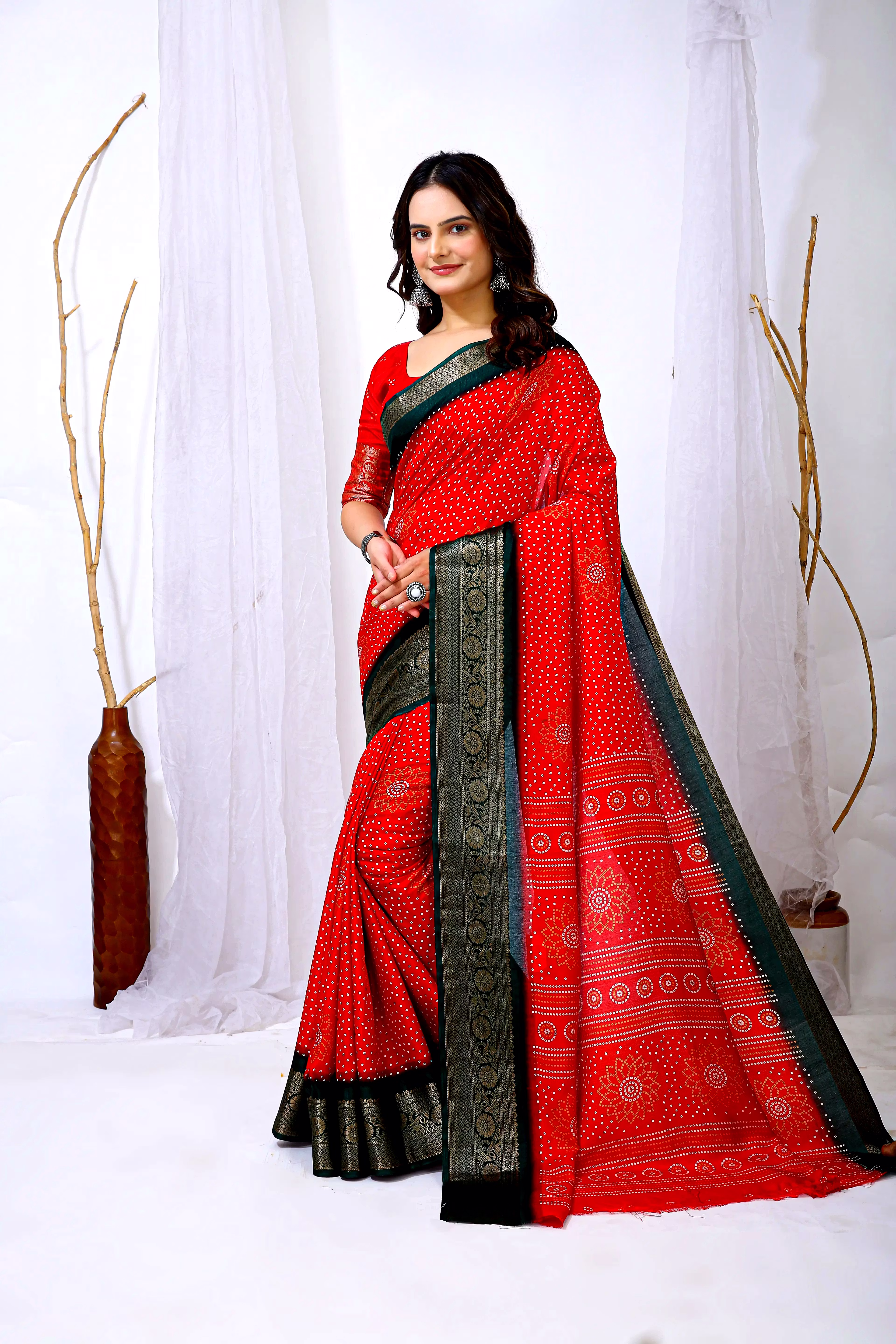 The classic beauty of the Bandhani is framed by a gorgeous Zari border saree, adding a layer of sophisticated sparkle that elevates the entire look. The traditional golden weaving provides the perfect contrast to the bright, festive prints, ensuring this silk saree with Zari border stands out in any crowd. Whether you're attending a wedding, a religious ceremony, or a grand festival, this Bandhani print saree gives you an aura of elegance and cultural richness that is truly captivating.