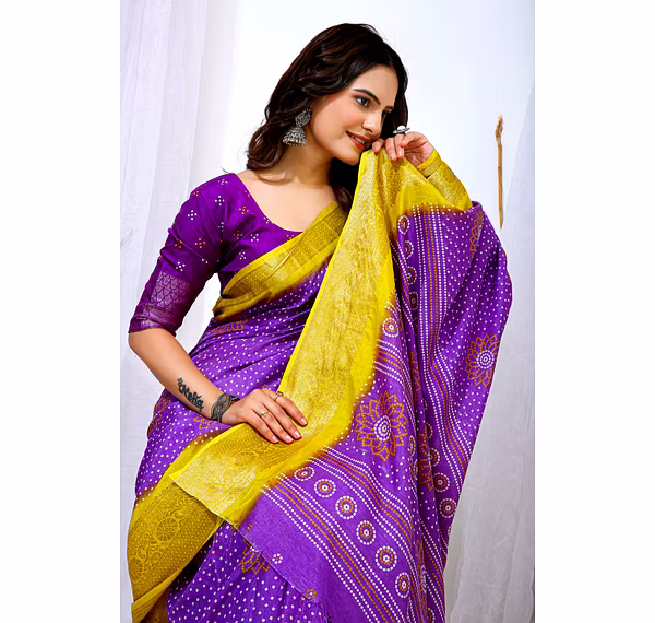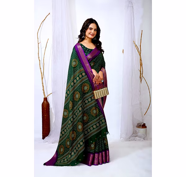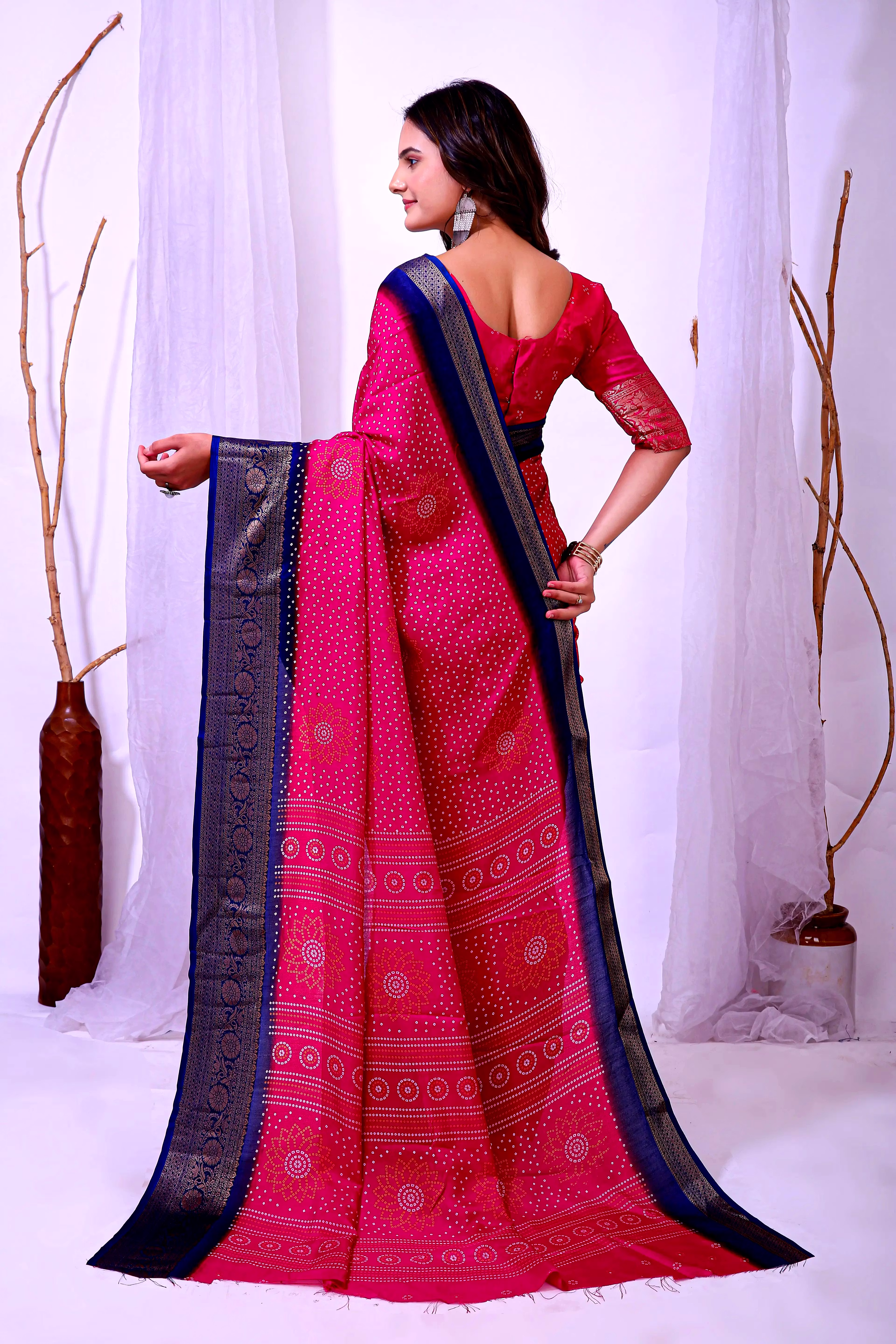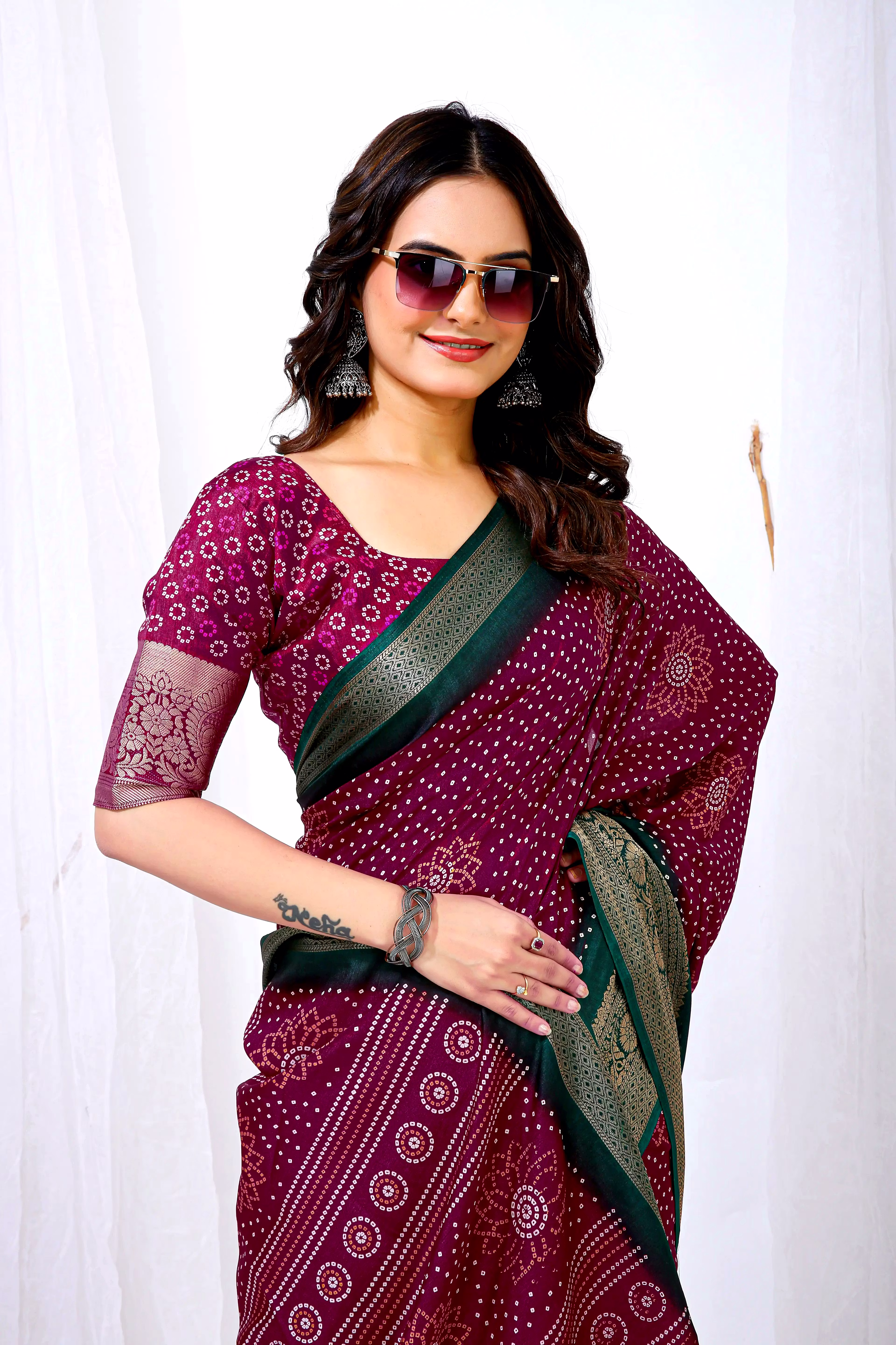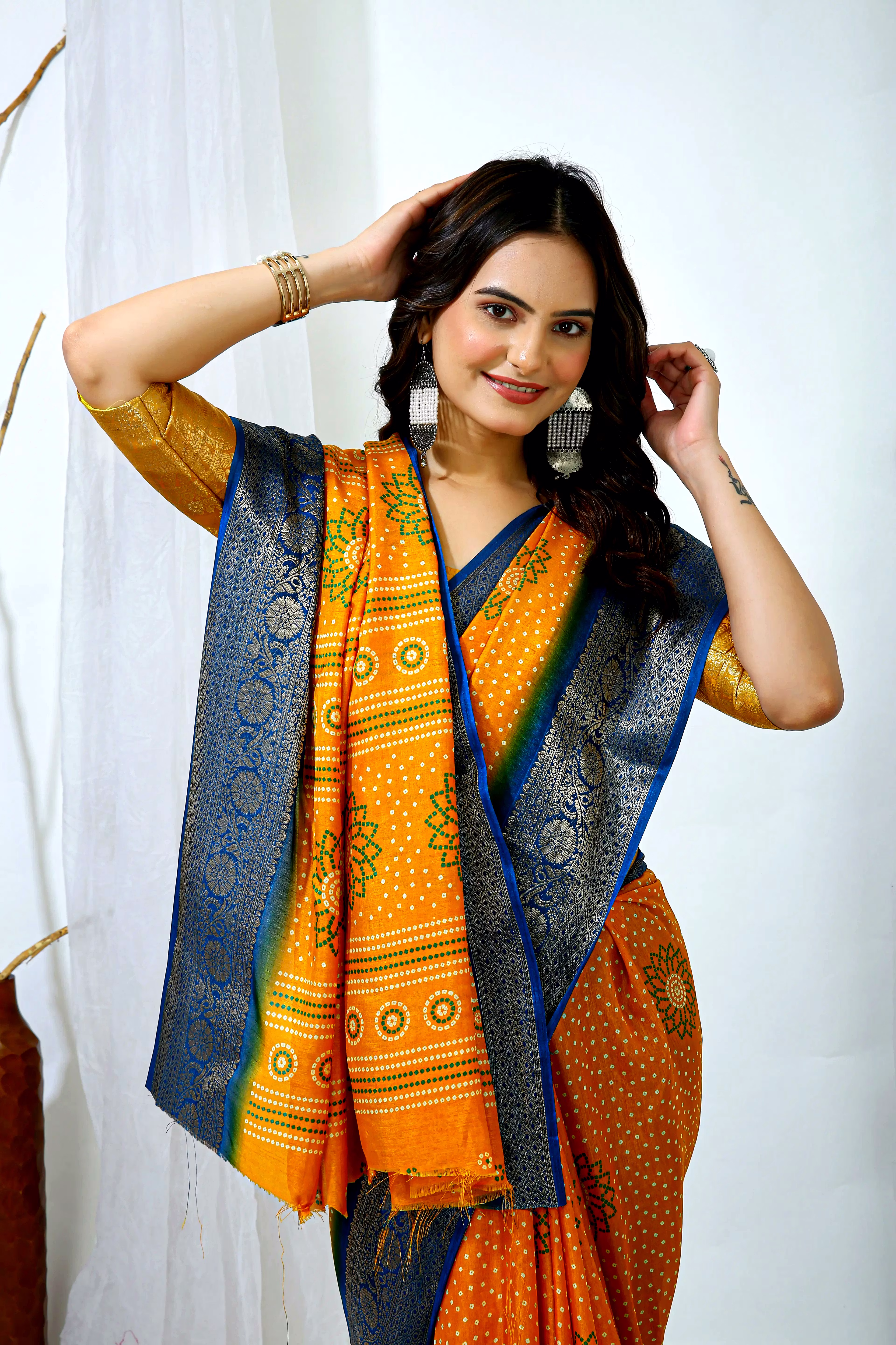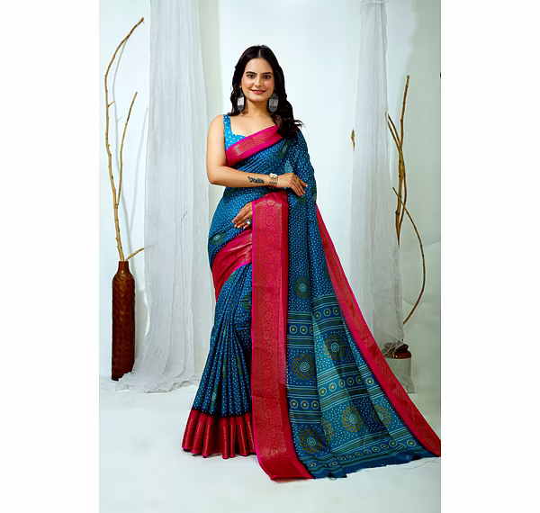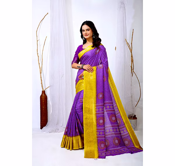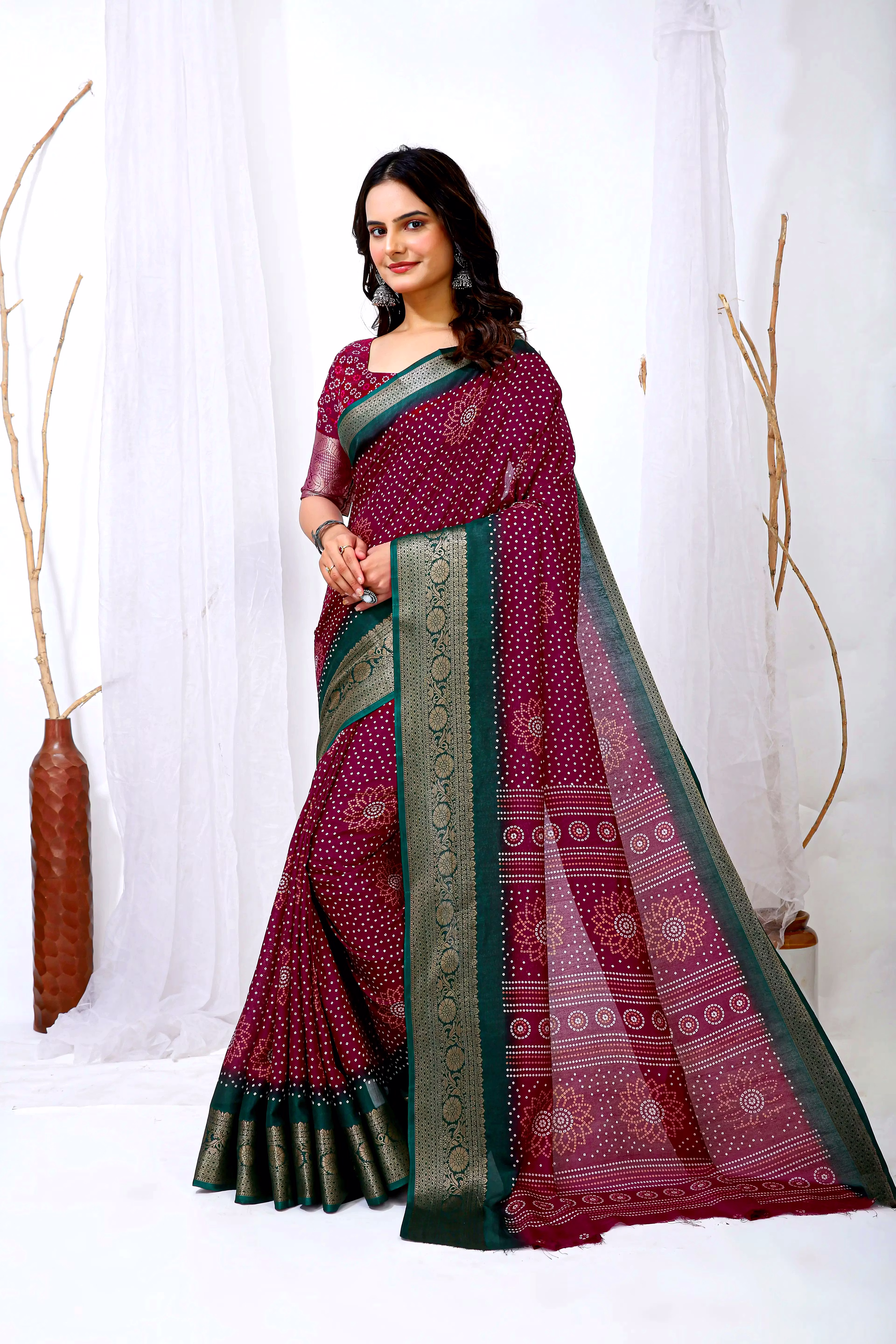 The classic beauty of the Bandhani is framed by a gorgeous Zari border saree, adding a layer of sophisticated sparkle that elevates the entire look. The traditional golden weaving provides the perfect contrast to the bright, festive prints, ensuring this silk saree with Zari border stands out in any crowd. Whether you're attending a wedding, a religious ceremony, or a grand festival, this Bandhani print saree gives you an aura of elegance and cultural richness that is truly captivating.