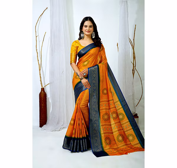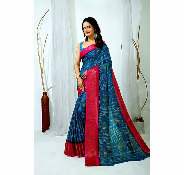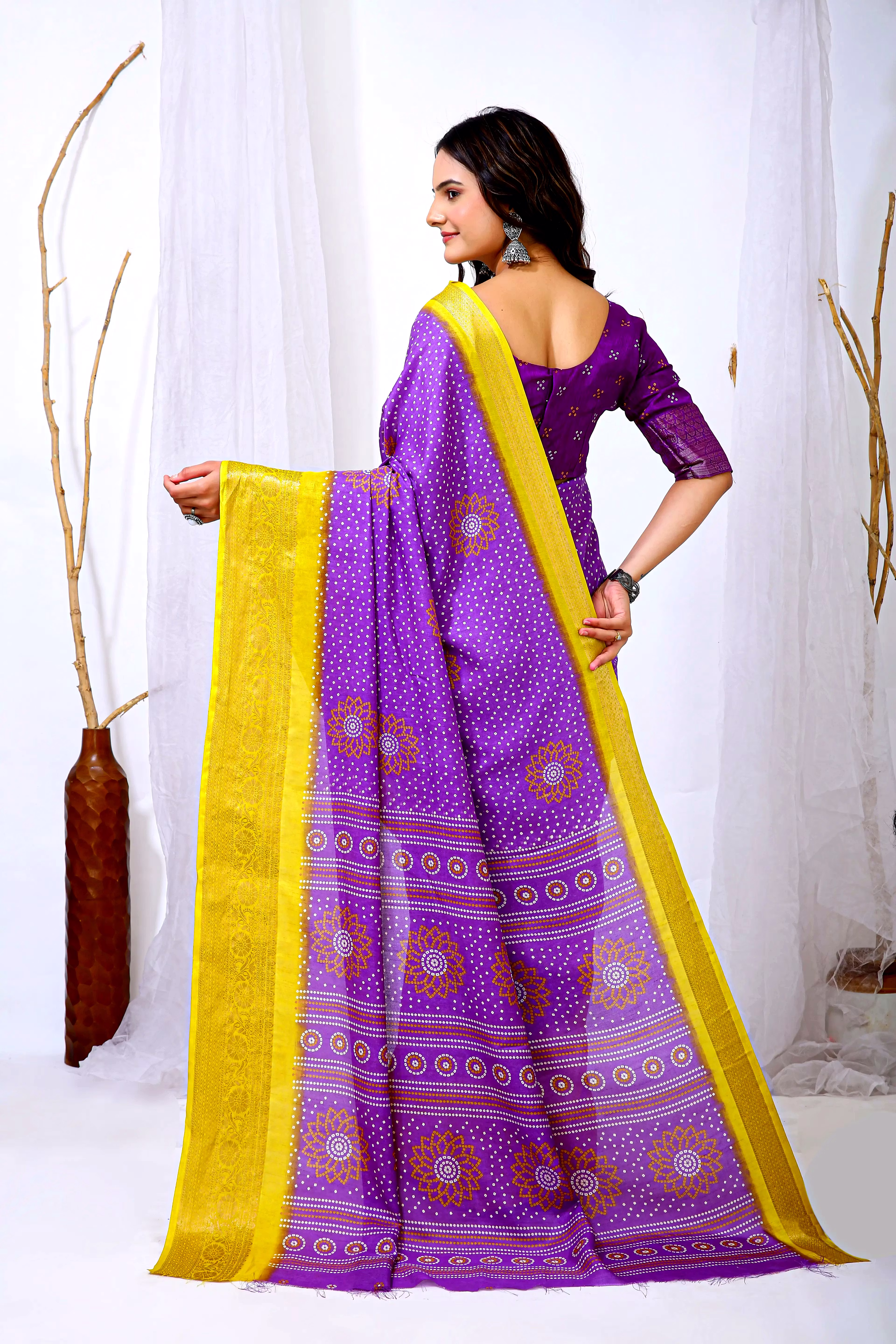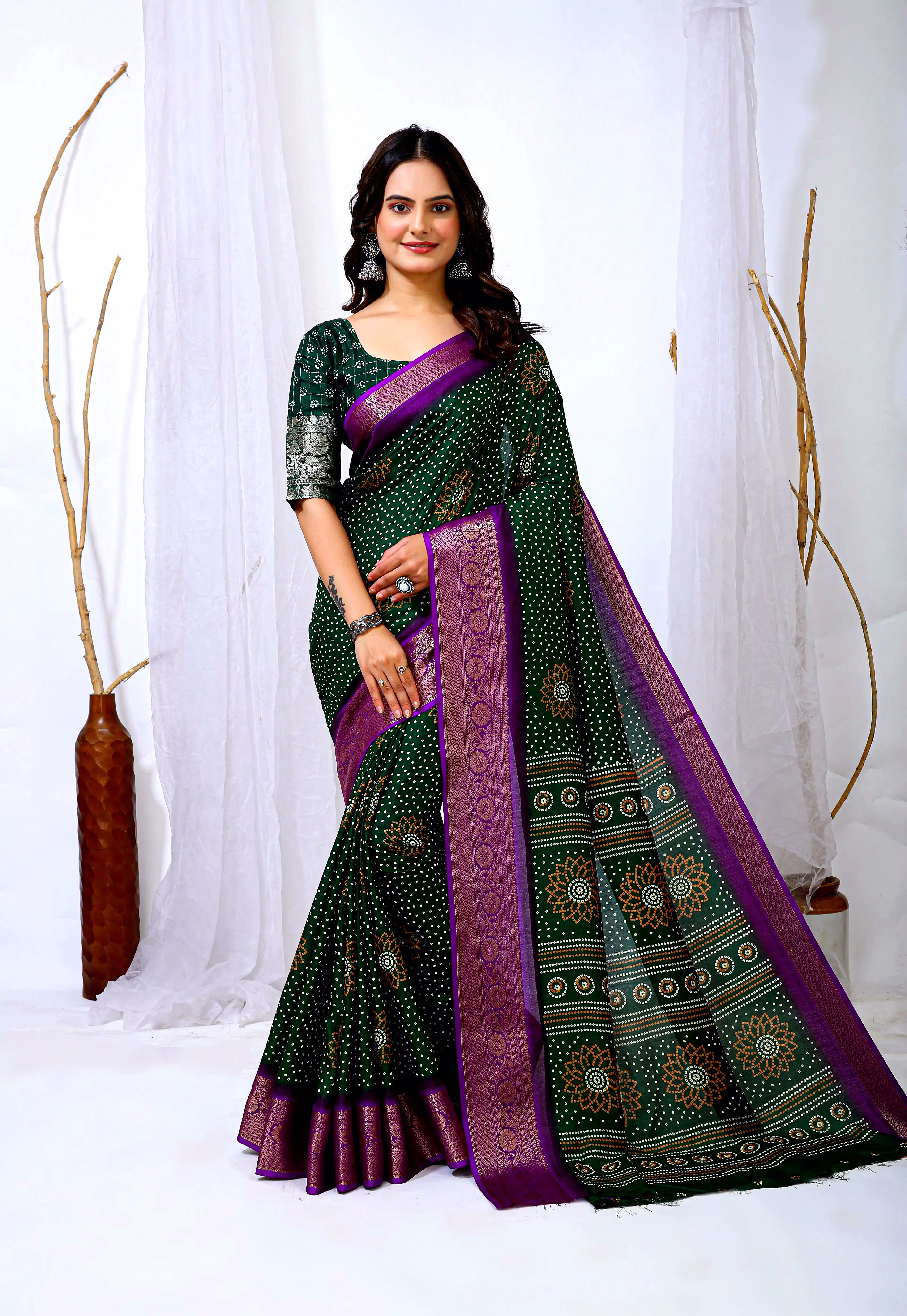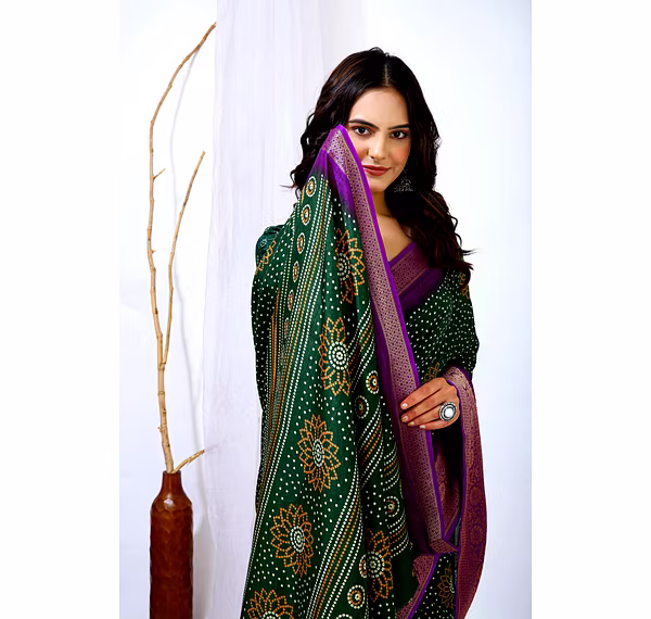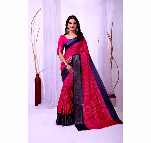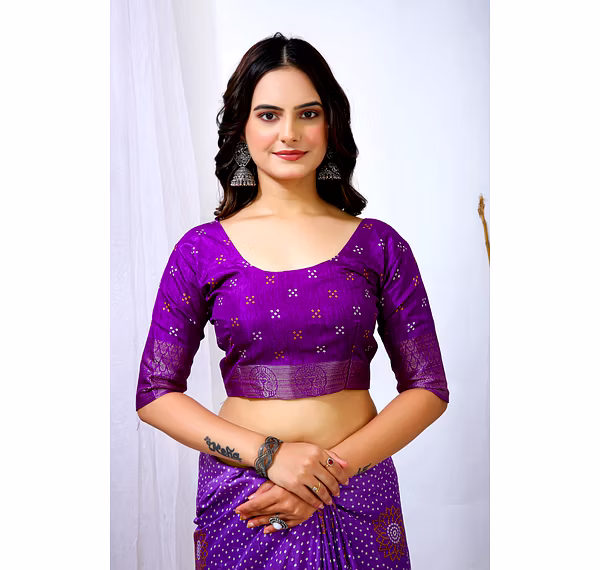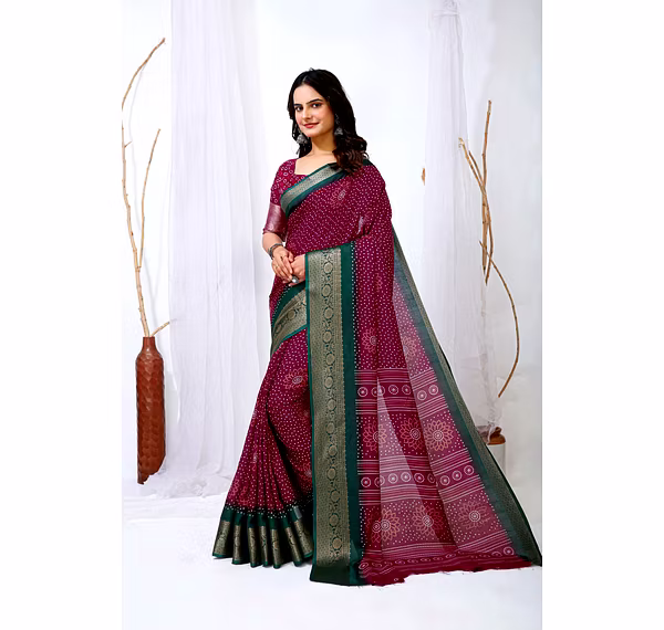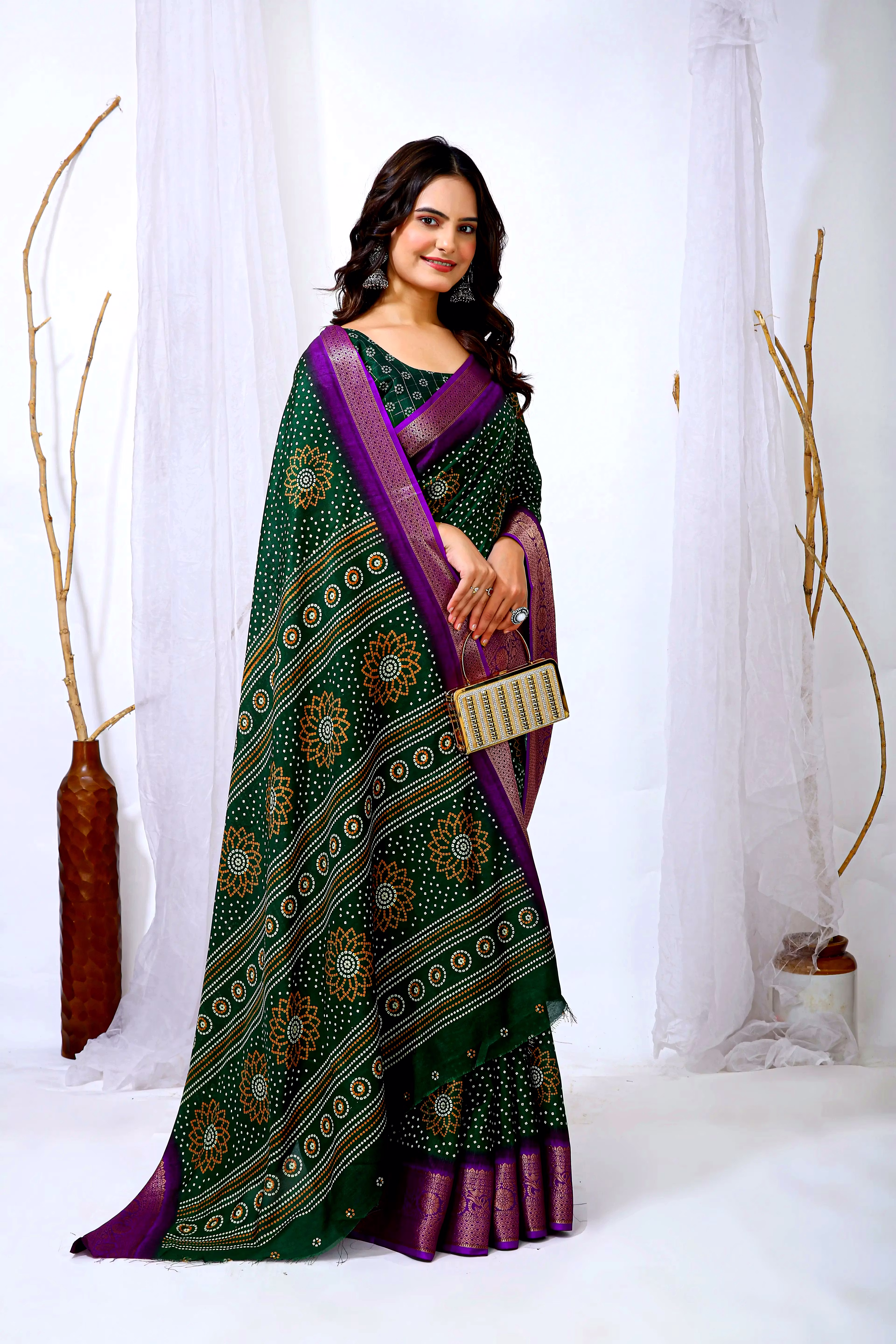 The classic beauty of the Bandhani is framed by a gorgeous Zari border saree, adding a layer of sophisticated sparkle that elevates the entire look. The traditional golden weaving provides the perfect contrast to the bright, festive prints, ensuring this silk saree with Zari border stands out in any crowd. Whether you're attending a wedding, a religious ceremony, or a grand festival, this Bandhani print saree gives you an aura of elegance and cultural richness that is truly captivating.
