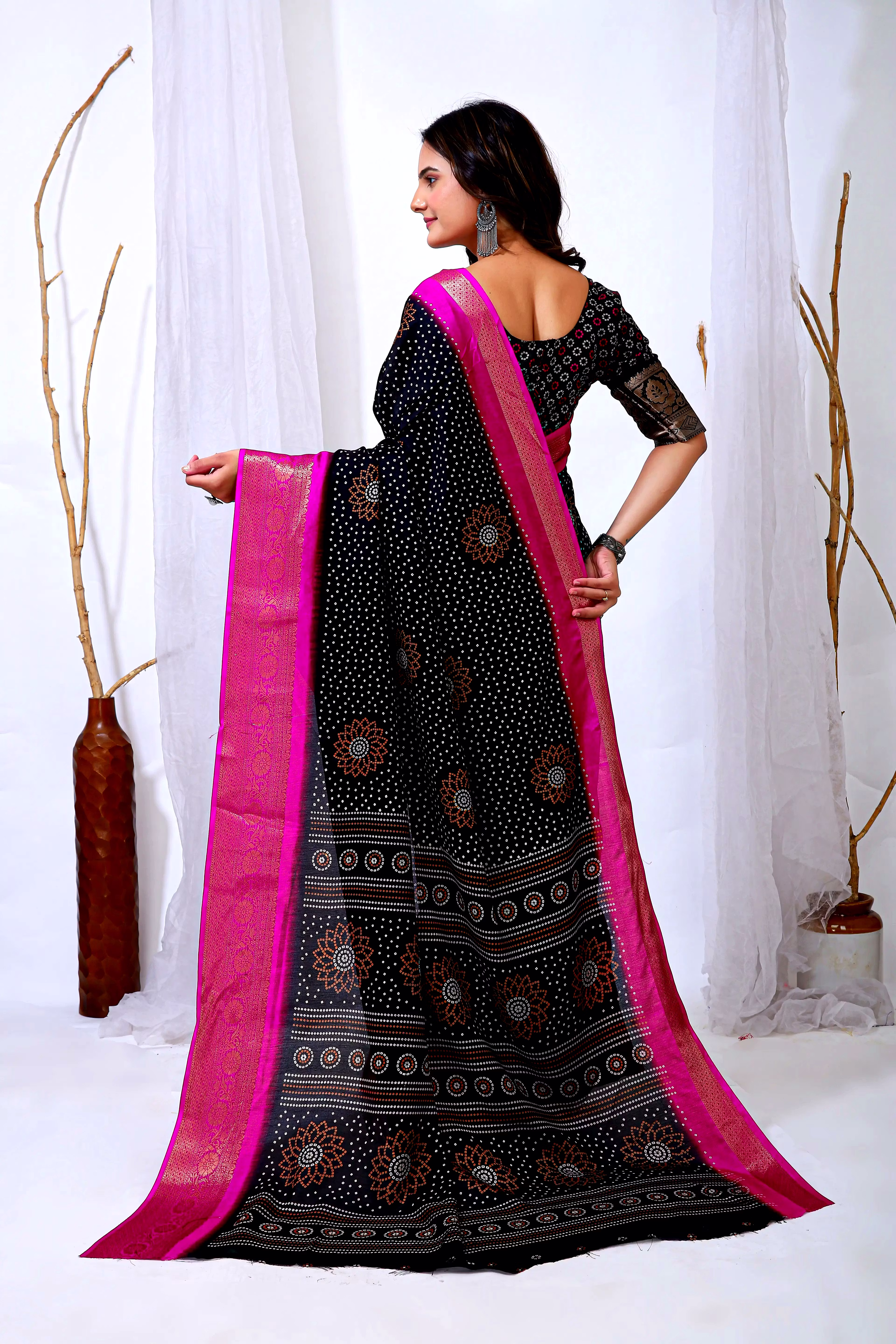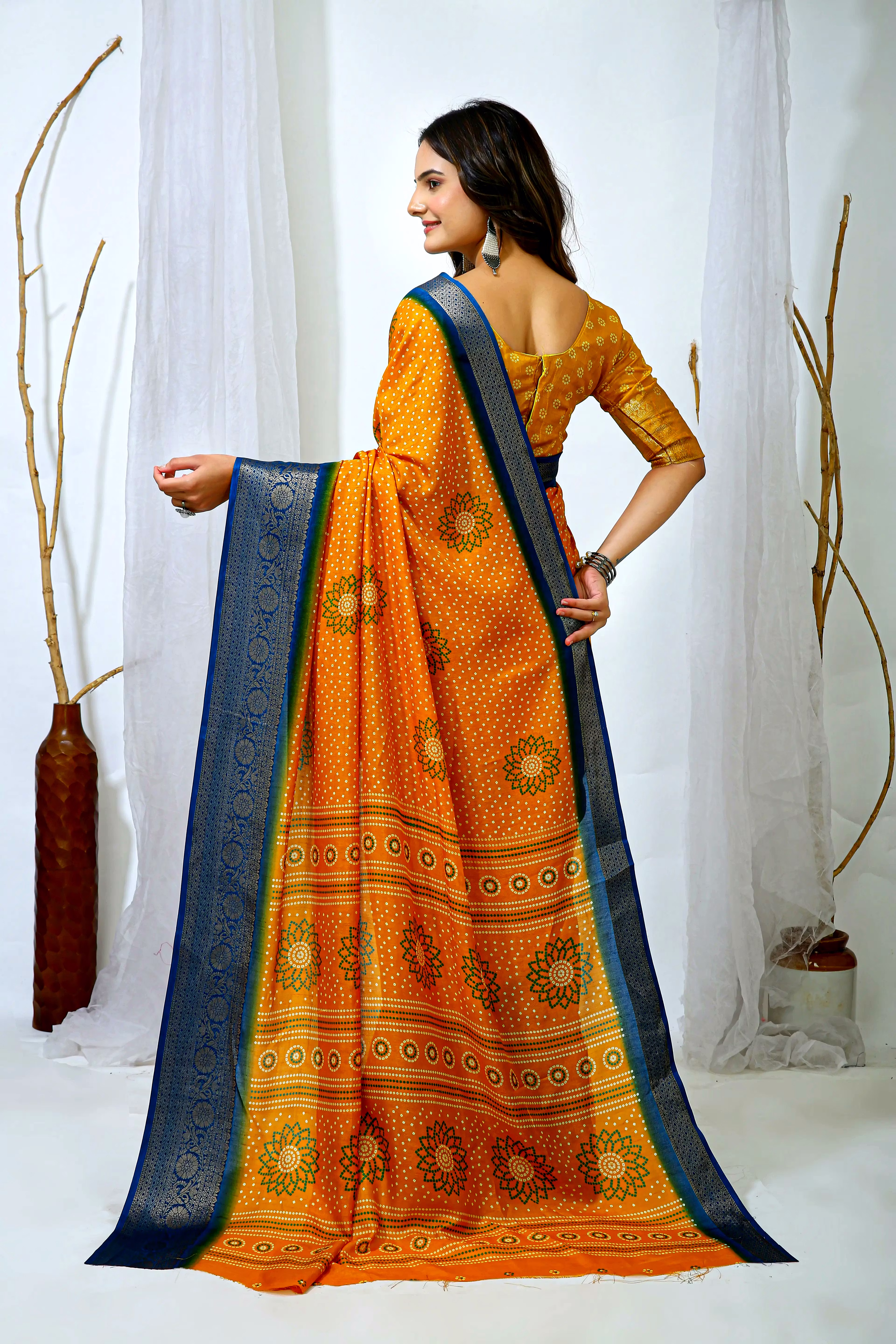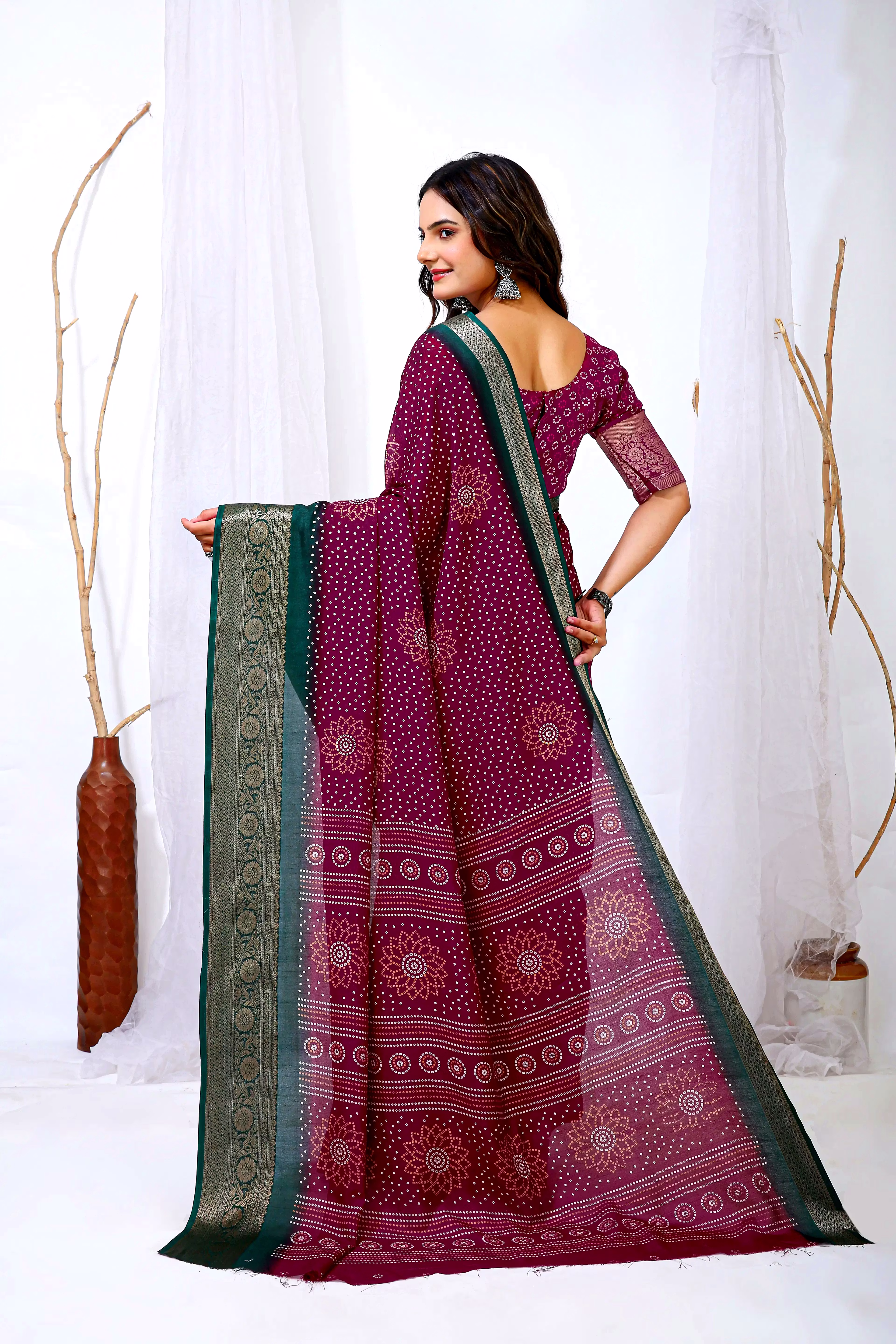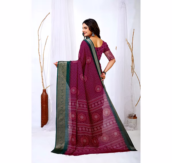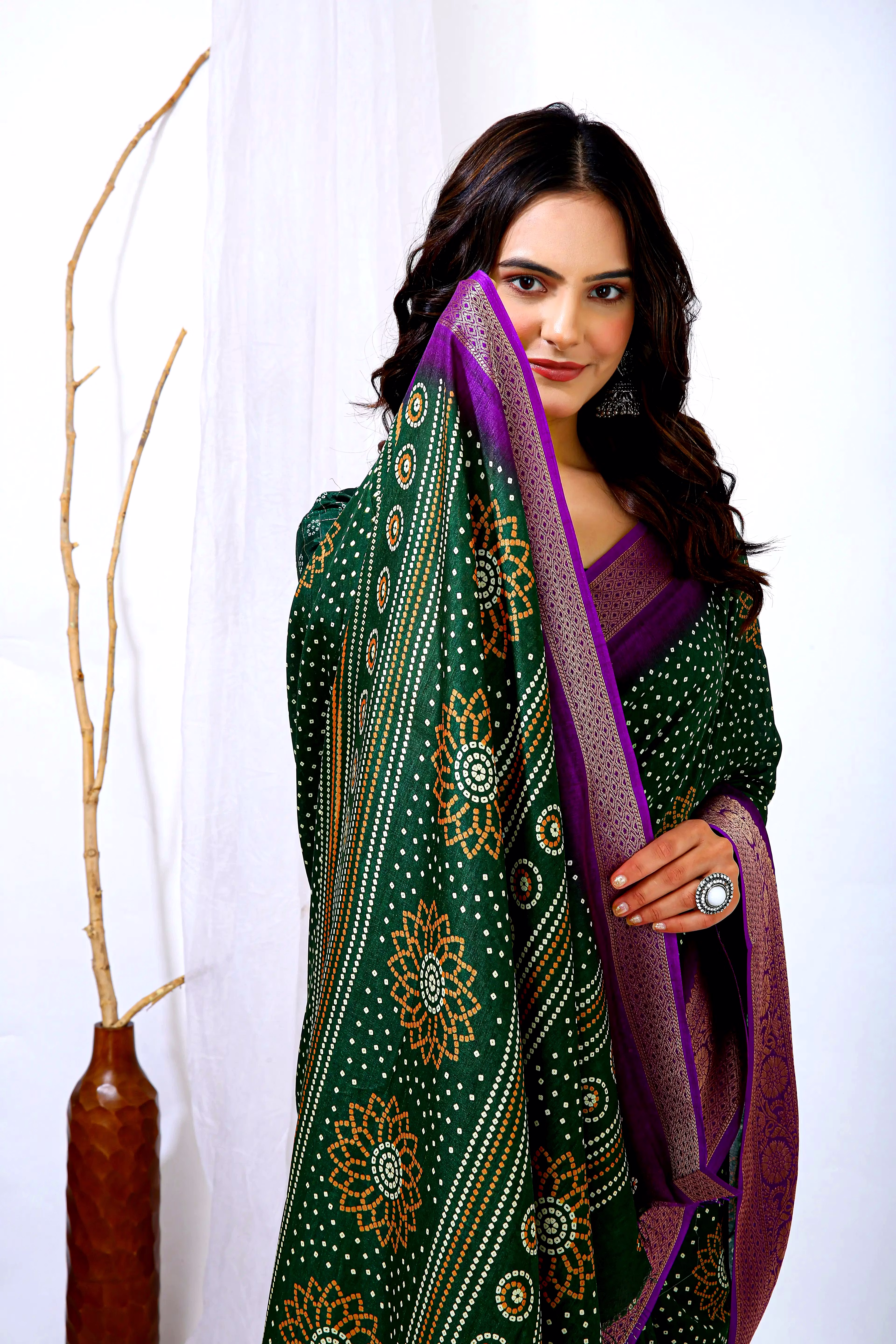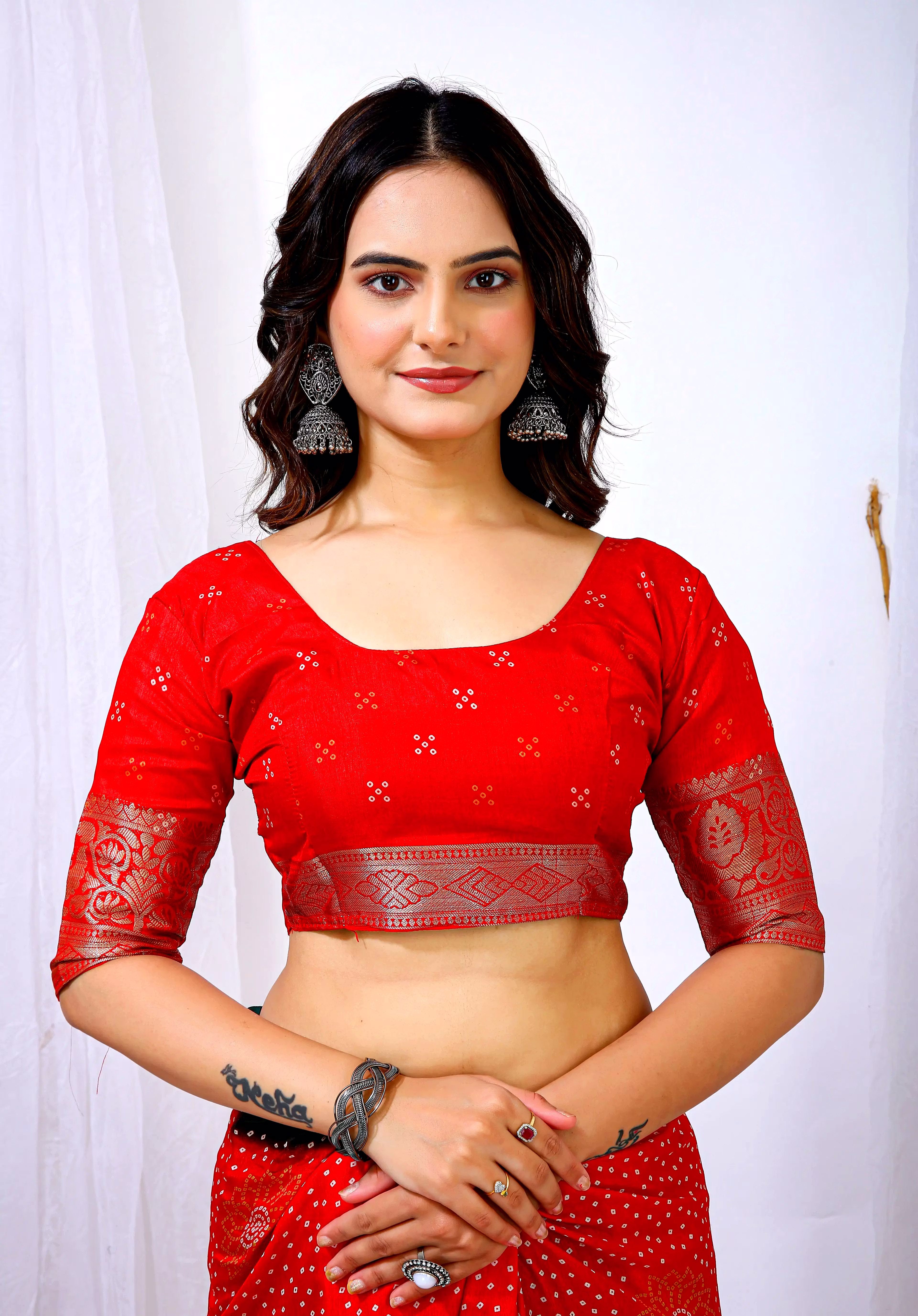 The classic beauty of the Bandhani is framed by a gorgeous Zari border saree, adding a layer of sophisticated sparkle that elevates the entire look. The traditional golden weaving provides the perfect contrast to the bright, festive prints, ensuring this silk saree with Zari border stands out in any crowd. Whether you're attending a wedding, a religious ceremony, or a grand festival, this Bandhani print saree gives you an aura of elegance and cultural richness that is truly captivating.