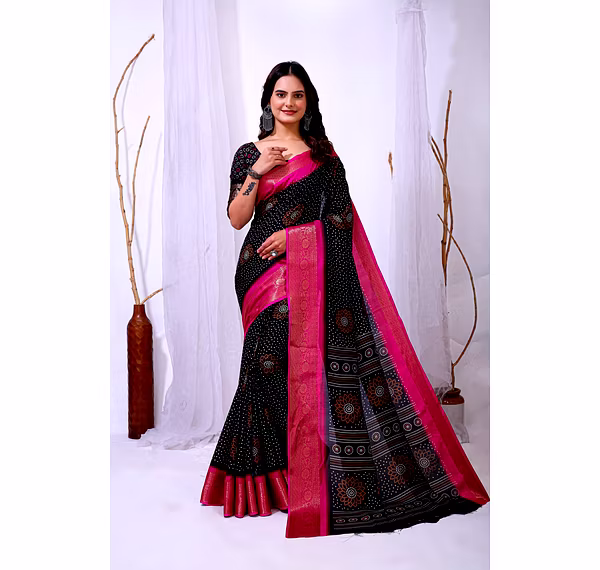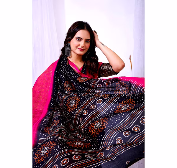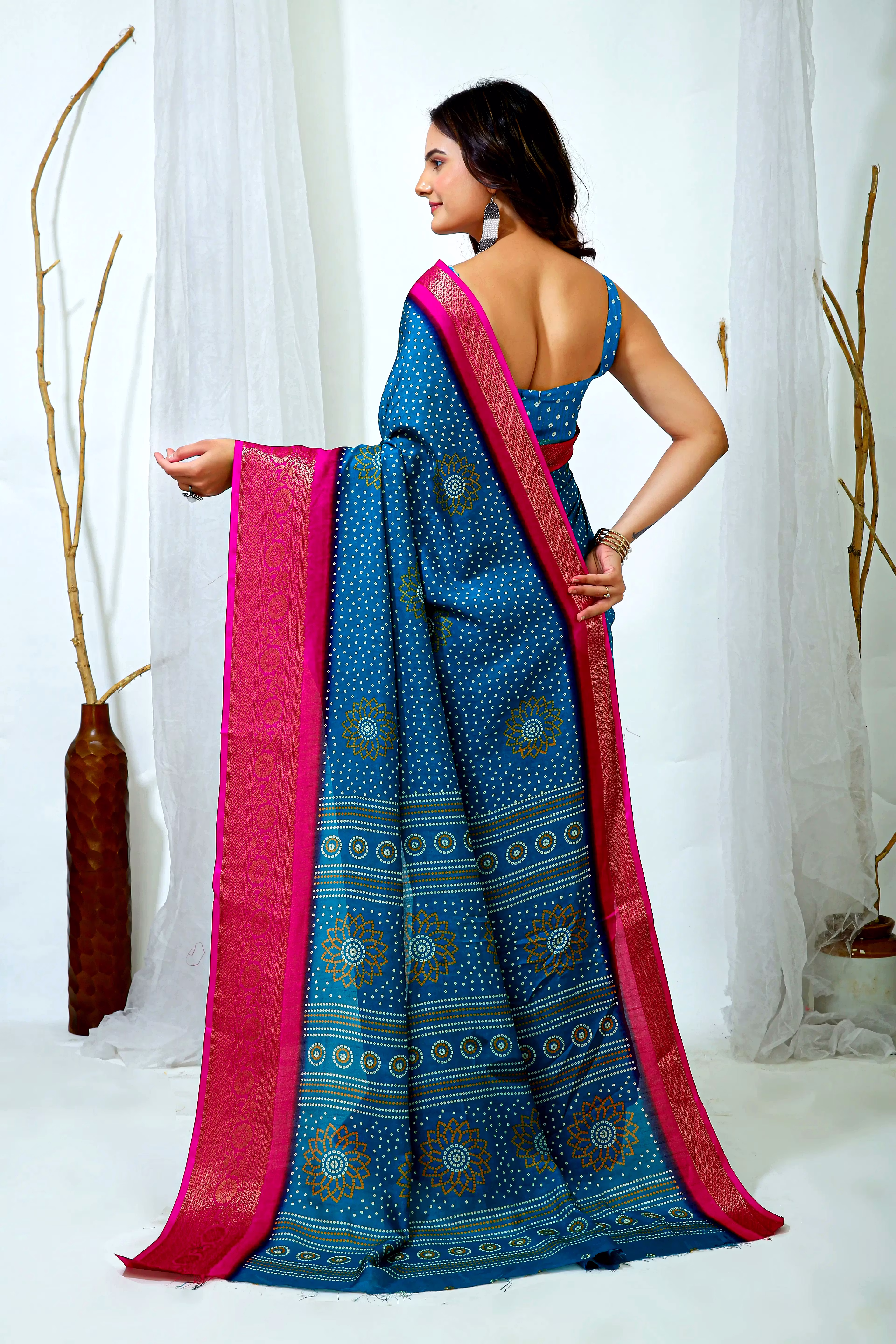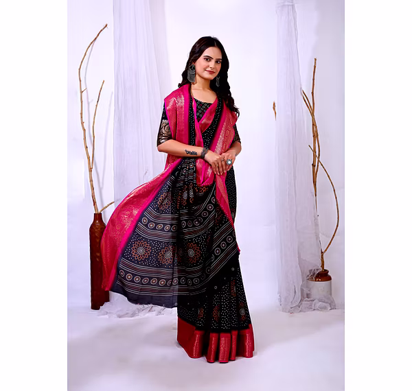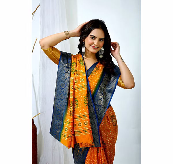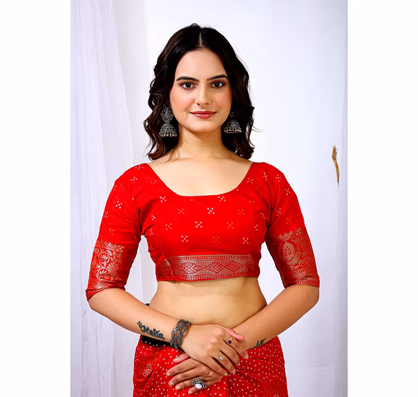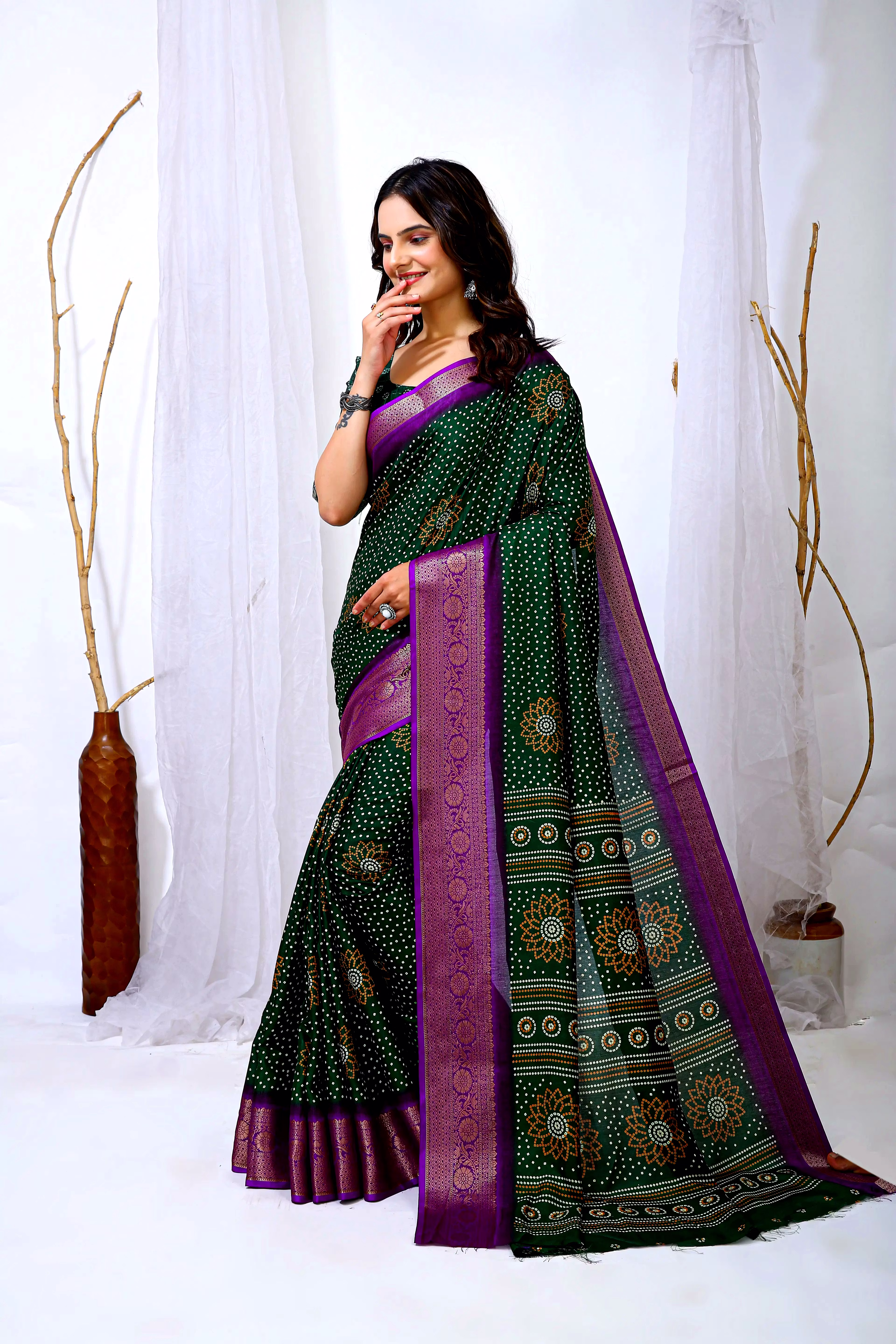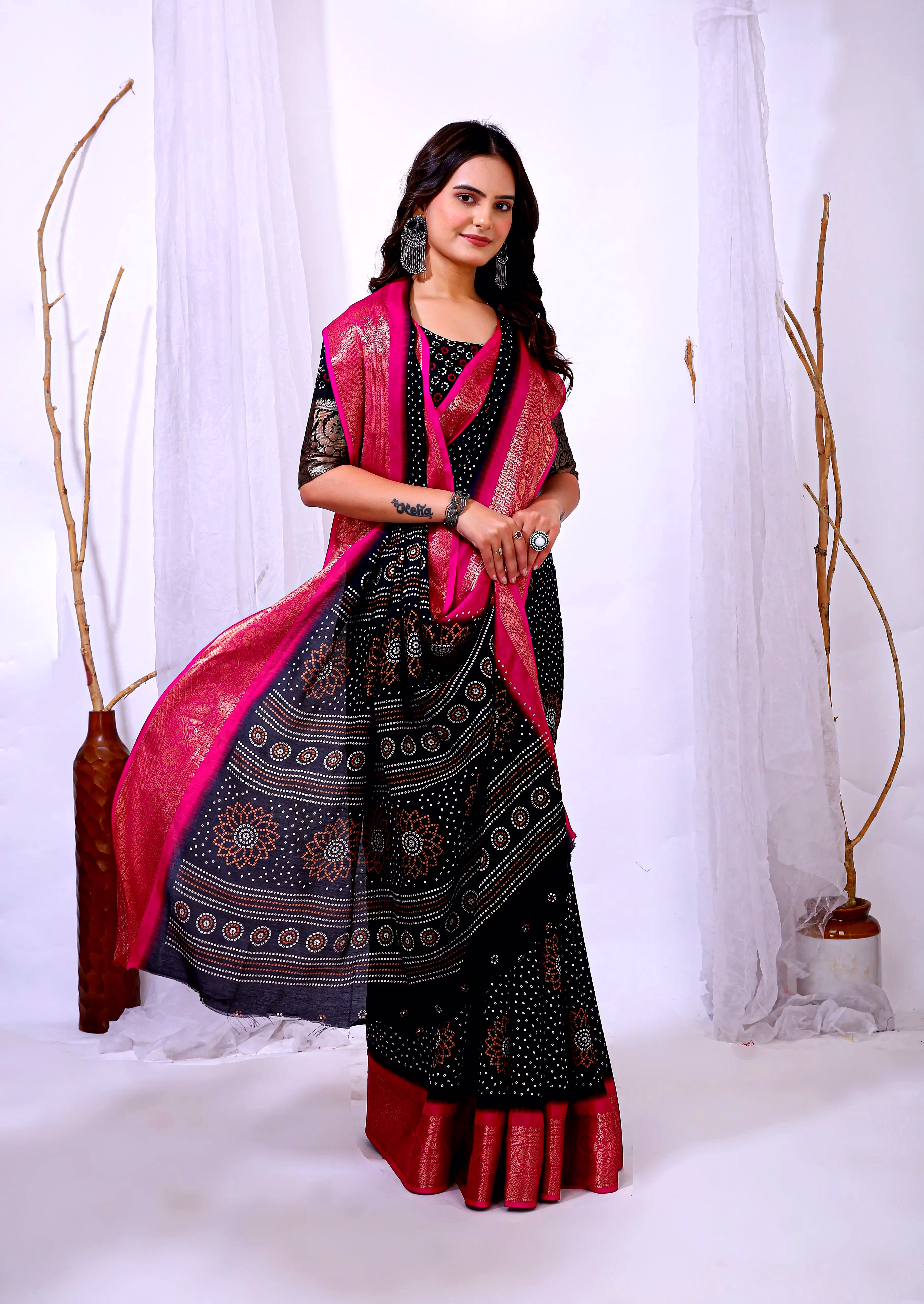 The classic beauty of the Bandhani is framed by a gorgeous Zari border saree, adding a layer of sophisticated sparkle that elevates the entire look. The traditional golden weaving provides the perfect contrast to the bright, festive prints, ensuring this silk saree with Zari border stands out in any crowd. Whether you're attending a wedding, a religious ceremony, or a grand festival, this Bandhani print saree gives you an aura of elegance and cultural richness that is truly captivating.