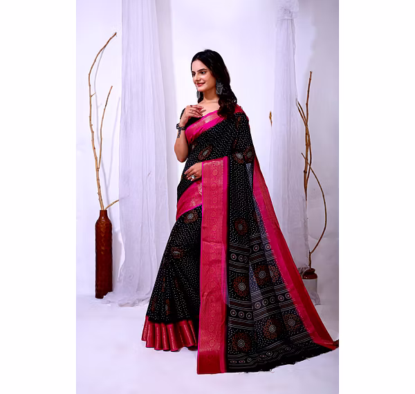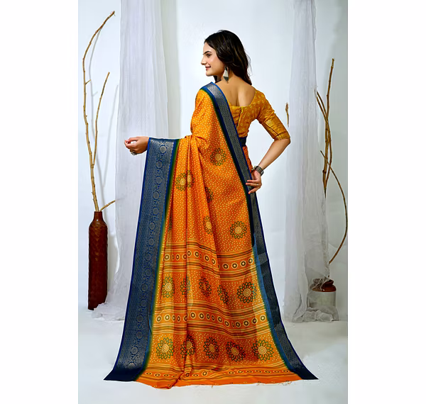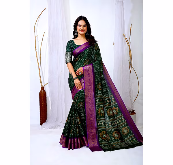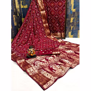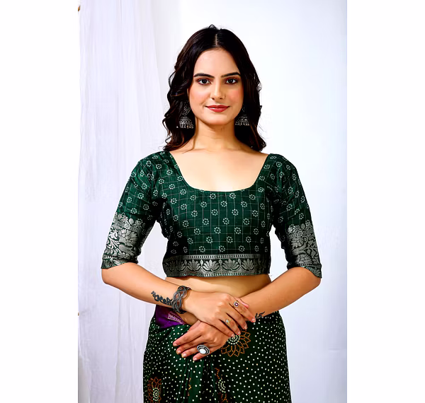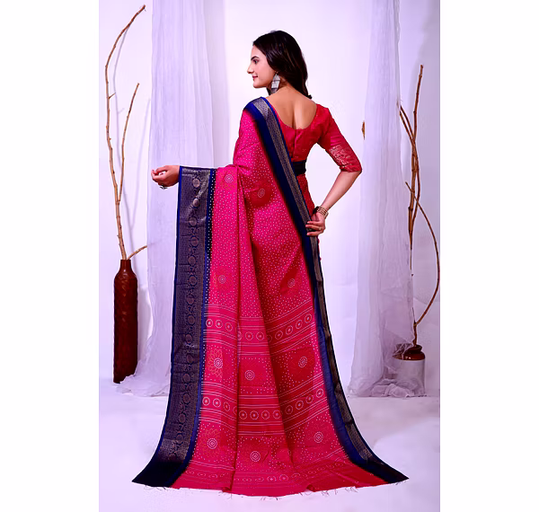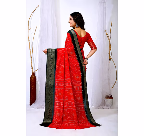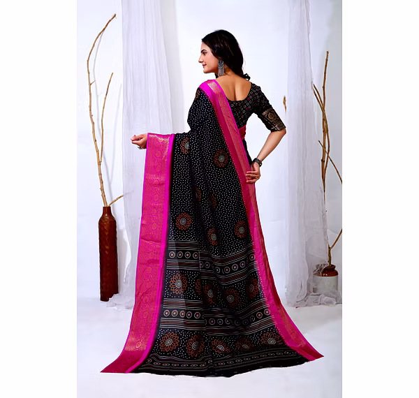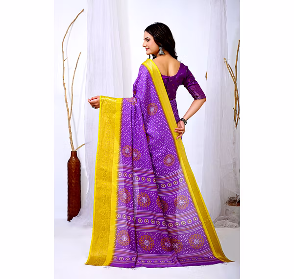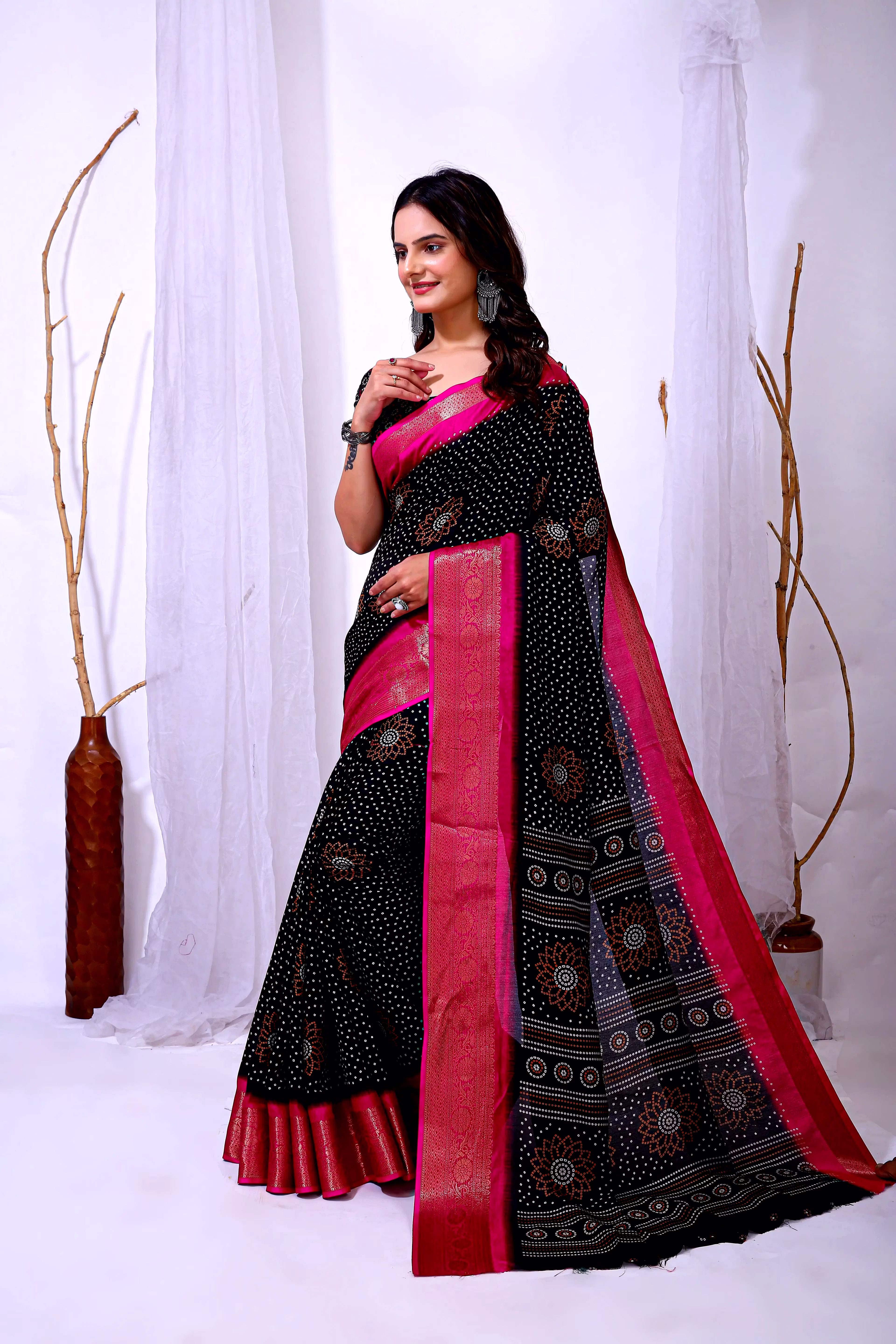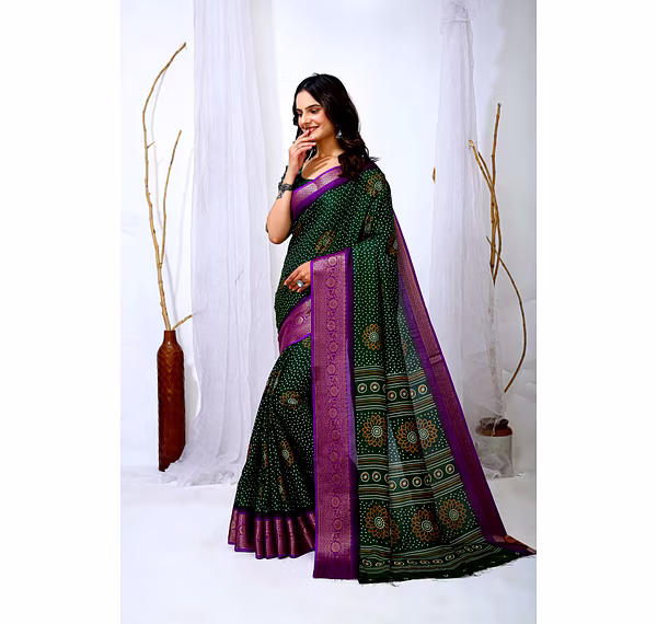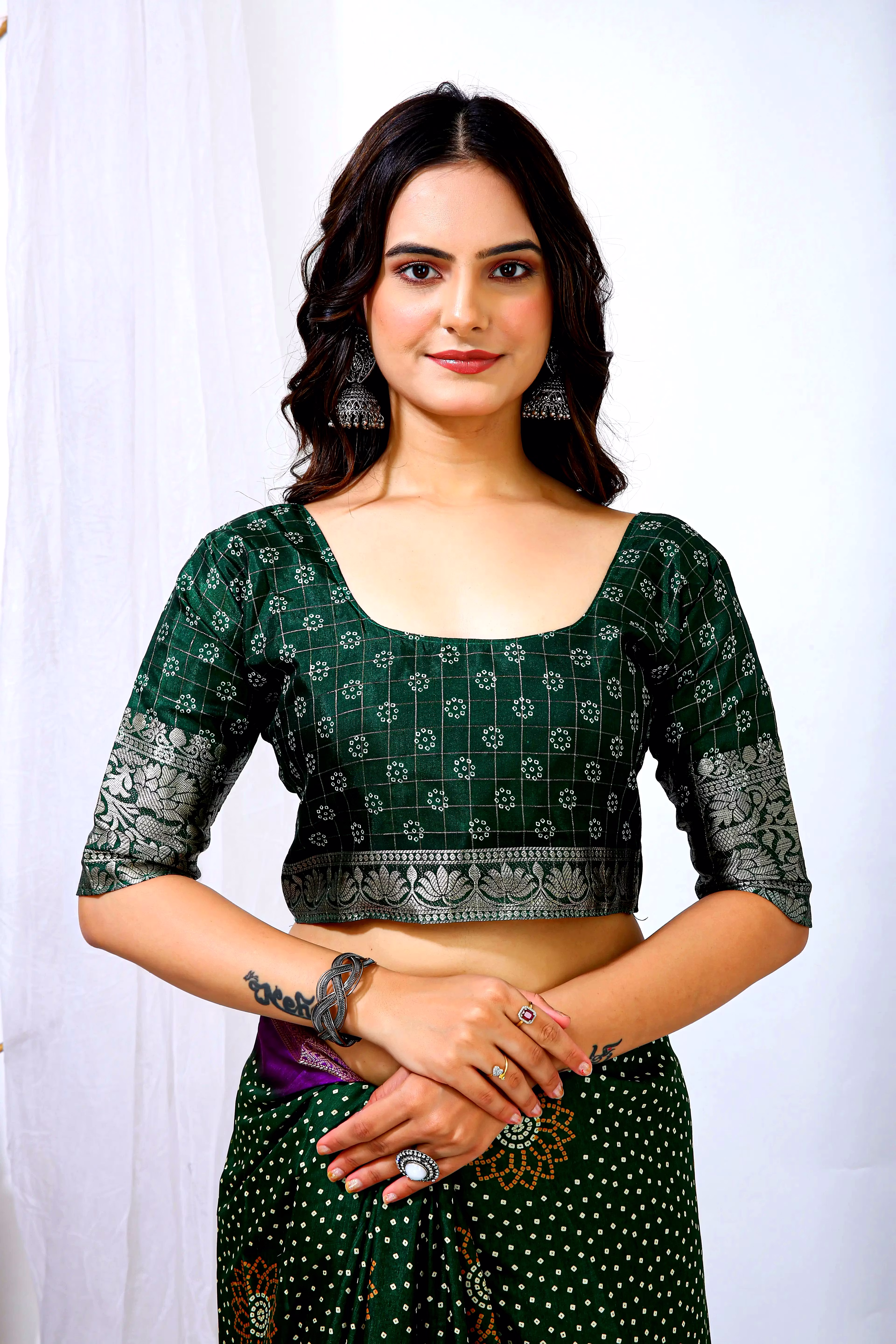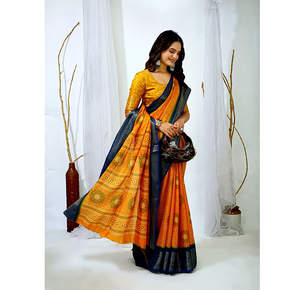 The classic beauty of the Bandhani is framed by a gorgeous Zari border saree, adding a layer of sophisticated sparkle that elevates the entire look. The traditional golden weaving provides the perfect contrast to the bright, festive prints, ensuring this silk saree with Zari border stands out in any crowd. Whether you're attending a wedding, a religious ceremony, or a grand festival, this Bandhani print saree gives you an aura of elegance and cultural richness that is truly captivating.