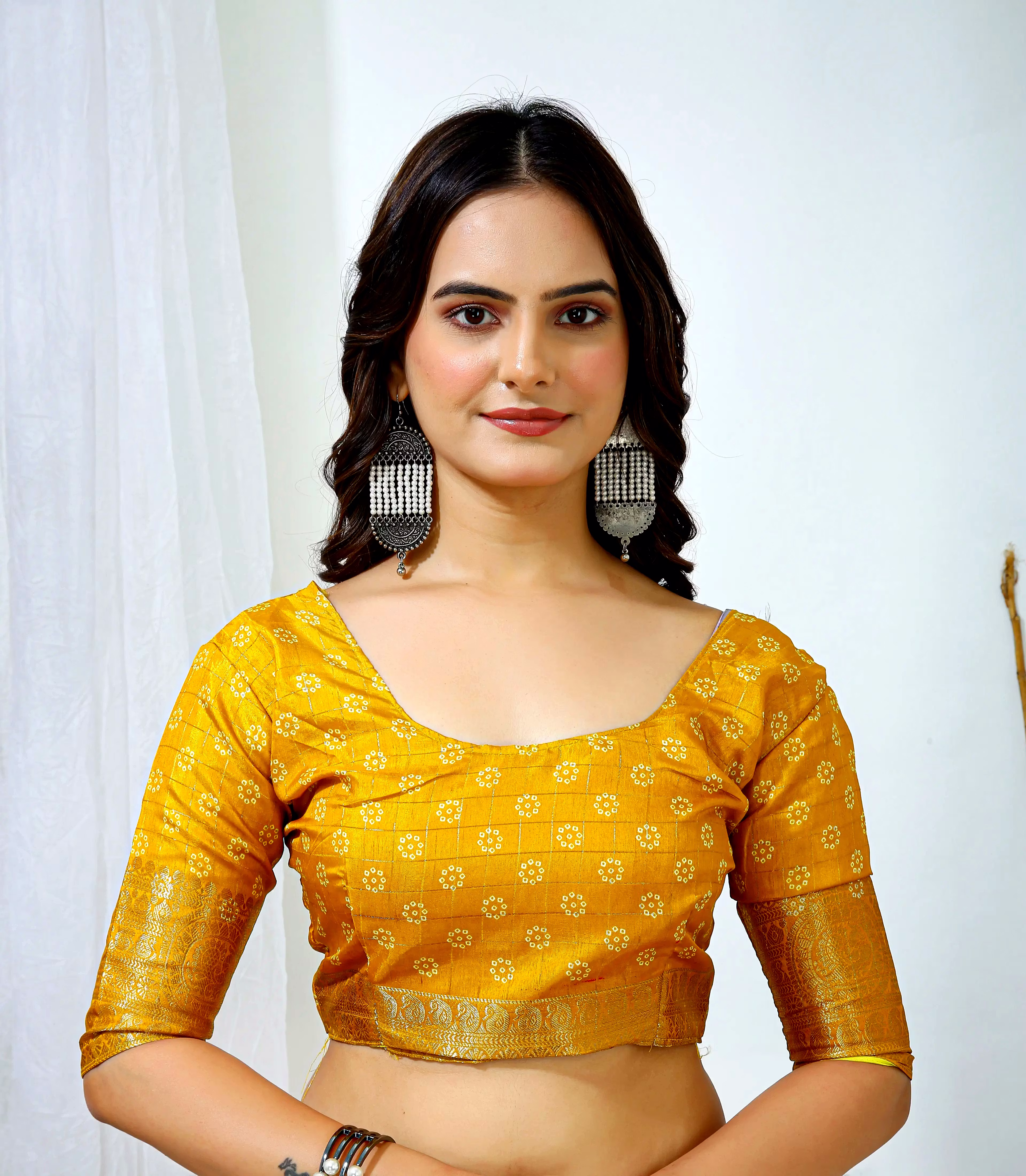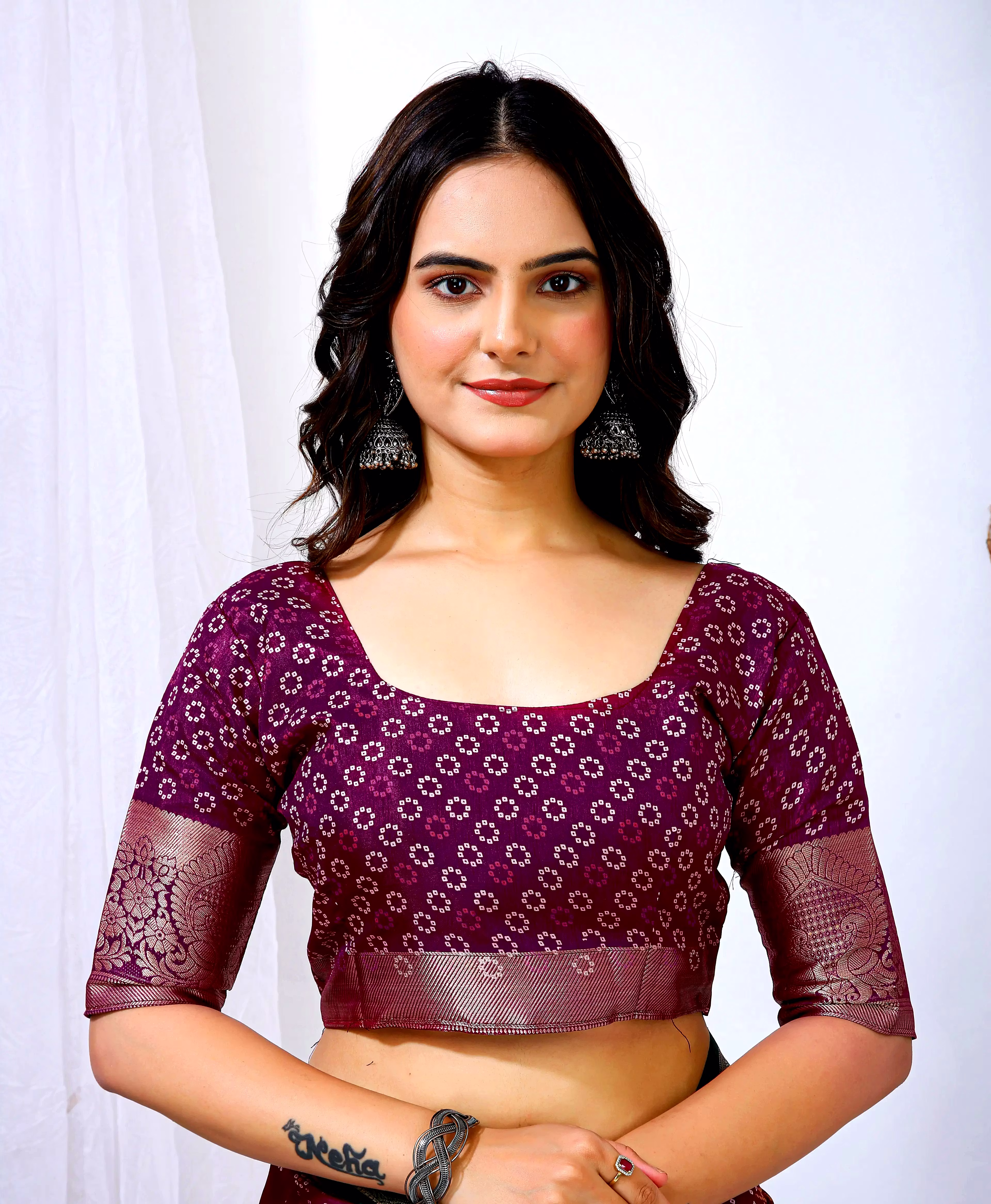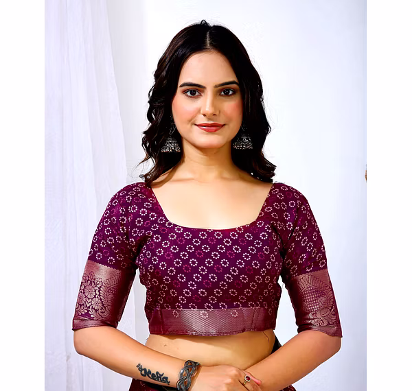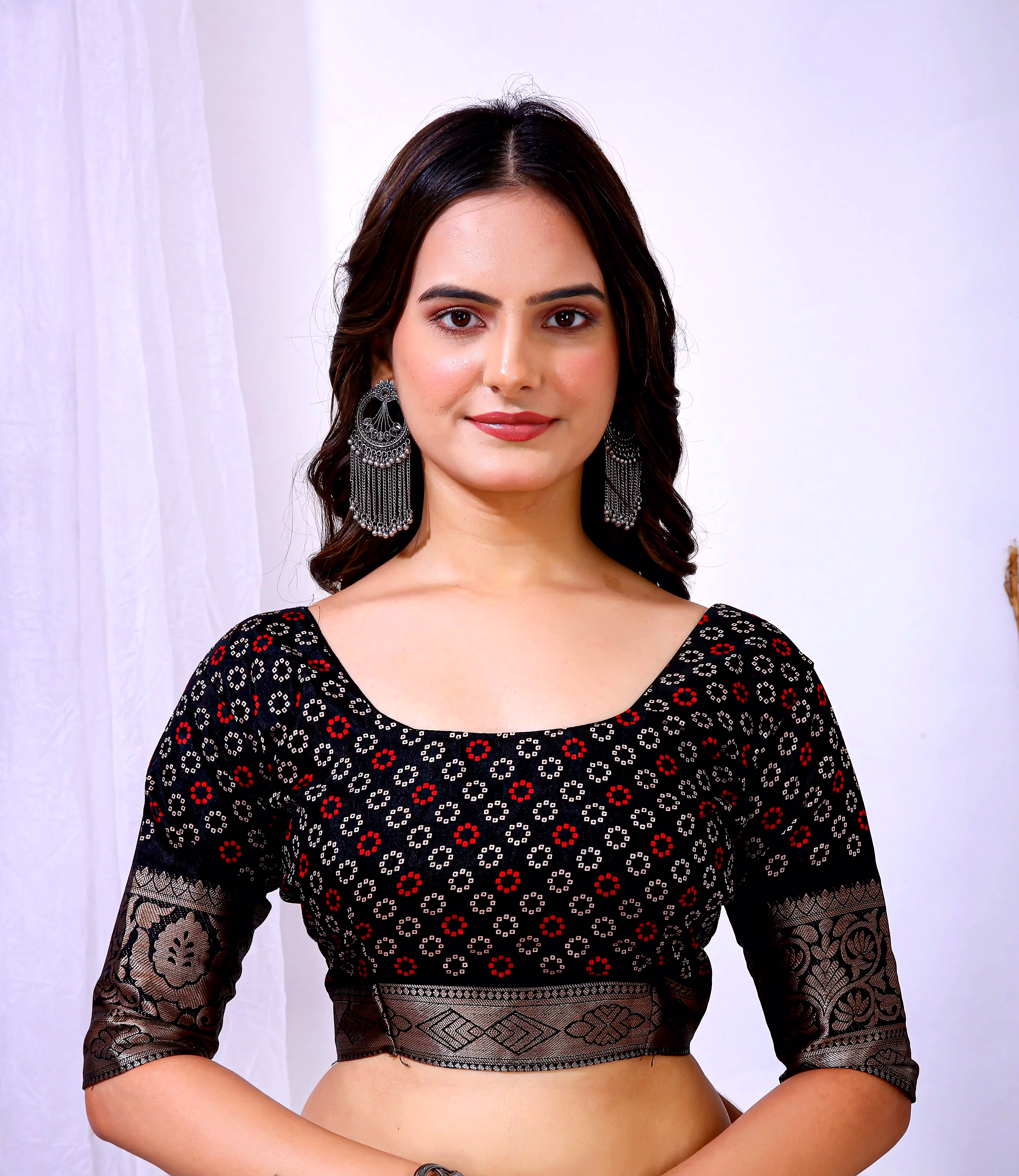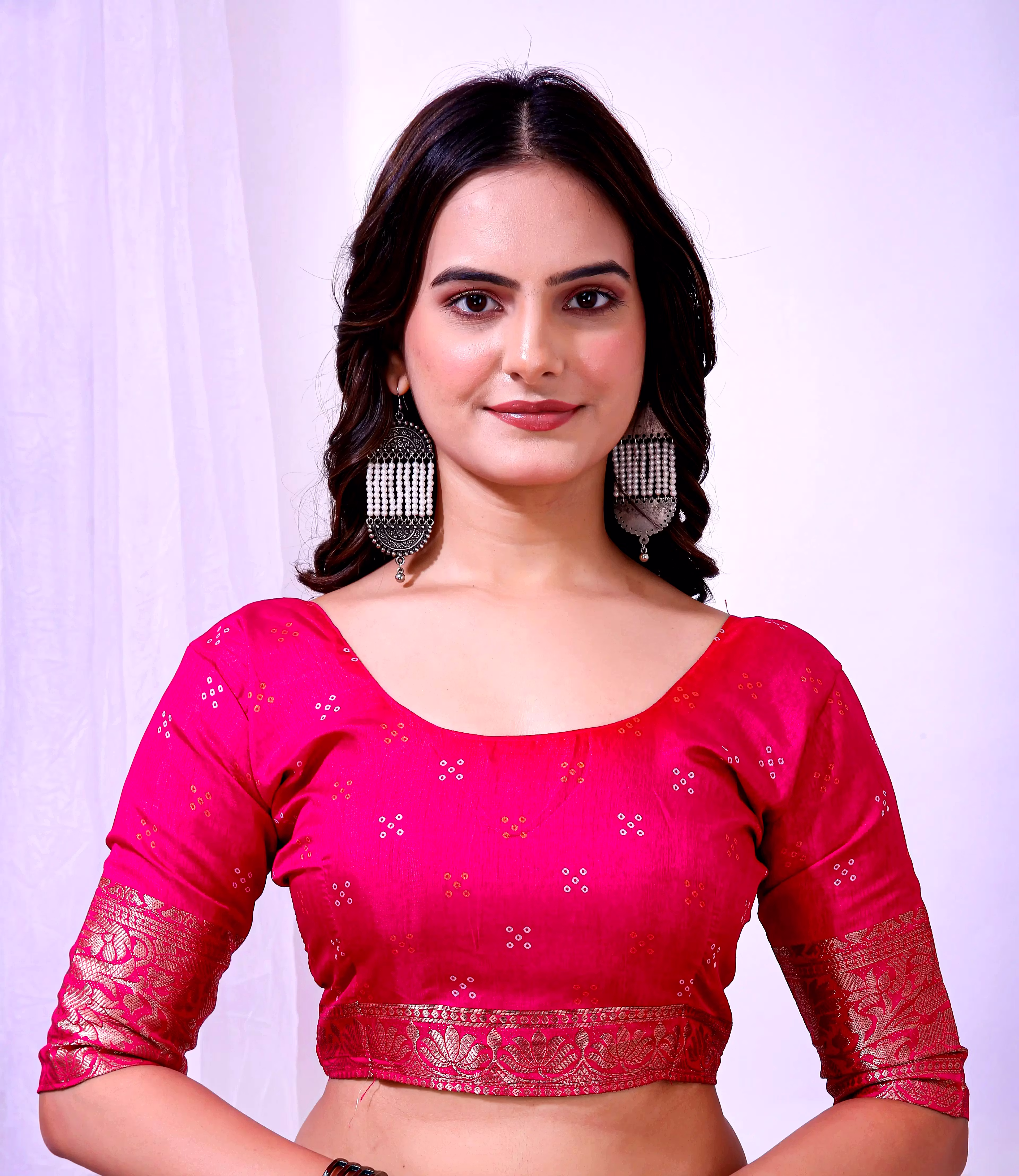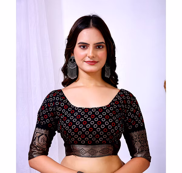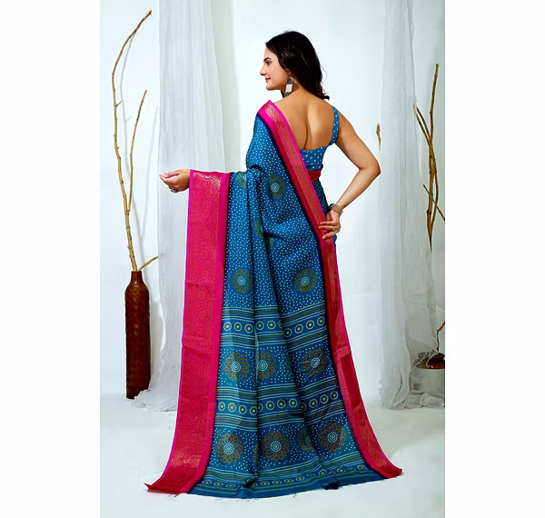 The classic beauty of the Bandhani is framed by a gorgeous Zari border saree, adding a layer of sophisticated sparkle that elevates the entire look. The traditional golden weaving provides the perfect contrast to the bright, festive prints, ensuring this silk saree with Zari border stands out in any crowd. Whether you're attending a wedding, a religious ceremony, or a grand festival, this Bandhani print saree gives you an aura of elegance and cultural richness that is truly captivating.
