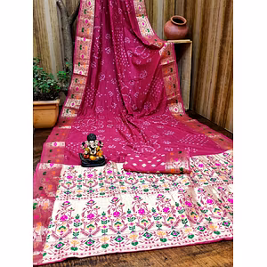 Elevate your ethnic ensemble with our Bandhani Print Dola Silk Saree featuring a stunning Zari border. Crafted from luxurious Dola Silk fabric, this saree exudes elegance and tradition.