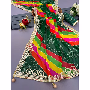 Introducing the Bandhej Saree Set with Gotta Patti Blouse - the perfect blend of traditional elegance and contemporary style. This stunning saree set boasts a beautiful bandhej pattern in three gorgeous colors that are sure to turn heads. Made from the finest quality materials, the saree is lightweight and comfortable, perfect for all-day wear. The gotta patti blouse adds a touch of sophistication and glamour, making it an ideal choice for weddings, parties, and other special occasions. The unique selling point of this saree set is its versatility. It can be dressed up for a formal event or dressed down for a more casual look, making it a great addition to any wardrobe. In addition to its stunning design, the Bandhej Saree Set offers many benefits. The saree is easy to drape and comes with a matching blouse, making it a hassle-free option for those who want to look their best without spending hours getting ready. Overall, this saree set is a must-have for any fashion-forward woman who wants to make a statement. It is a perfect blend of traditional and modern aesthetics and is sure to make you the center of attention wherever you go. Don't miss out on the opportunity to add this stunning saree set to your collection.