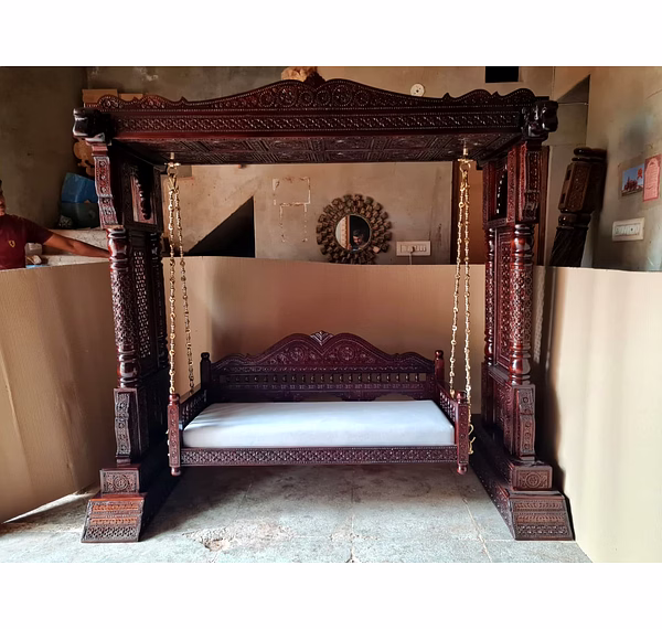 Teak wood made jhula in very best carving. All type polish avaliable. 7x3.5x7 ft size.