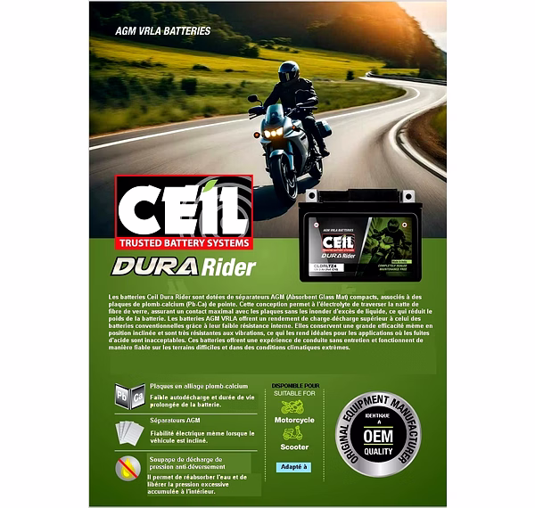 Les batteries Ceil Dura Rider sont dotées de séparateurs AGM (Absorbent Glass Mat) composés de plaques de plomb-calcium (Pb-Ca) de haute qualité.
