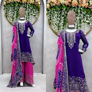 This Beautiful Designer Faux Georgette Suit with Dhoti & Dupatta, Sequins & Thread Work is an exquisite ensemble that is sure to steal the spotlight wherever you go. Crafted with utmost precision and attention to detail, this stunning suit combines traditional elements with a contemporary twist, making it a perfect choice for any special occasion. The suit is made from high-quality faux georgette fabric, known for its lightweight and flowy nature, which ensures maximum comfort even during long hours of wear. The fabric drapes beautifully, adding an elegant touch to the overall look. The vibrant color and intricate sequins and thread work further enhance the appeal of this ensemble, making it a true feast for the eyes. The highlight of this suit is the dhoti-style bottoms, which are not only trendy but also incredibly comfortable. The unique silhouette adds a modern touch to the traditional suit, making it a fashion-forward choice for those who like to experiment with their style. The dhoti is expertly tailored to ensure a perfect fit and ease of movement, allowing you to dance the night away with utmost grace and confidence. Completing the look is a matching dupatta, adorned with sequins and thread work, which adds a touch of glamour and completes the overall ensemble beautifully. The dupatta can be styled in various ways, allowing you to create different looks to suit different occasions. Whether you're attending a wedding, a festive celebration, or any other special event, this Beautiful Designer Faux Georgette Suit with Dhoti & Dupatta is a true showstopper that will make you the center of attention. With its impeccable craftsmanship, stunning design, and comfortable fit, this suit is a must-have addition to your wardrobe. So go ahead and make a style statement with this exquisite ensemble!