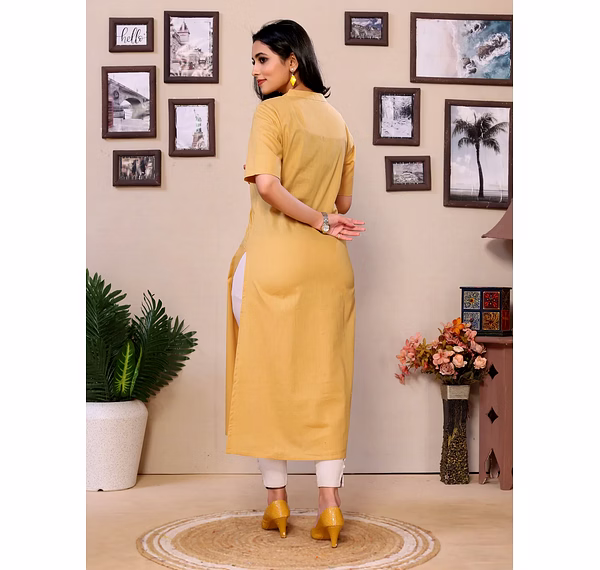 Featuring a round neckline and 3/4 sleeves, this kurti blends minimalist style with functionality. Its knee-length straight fit flatters all body types and pairs effortlessly with a variety of bottoms—be it formal trousers, ethnic leggings, palazzos, or even denim.