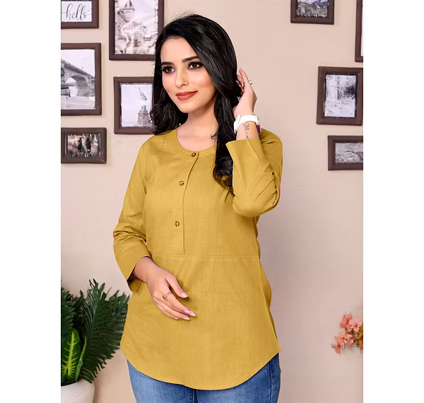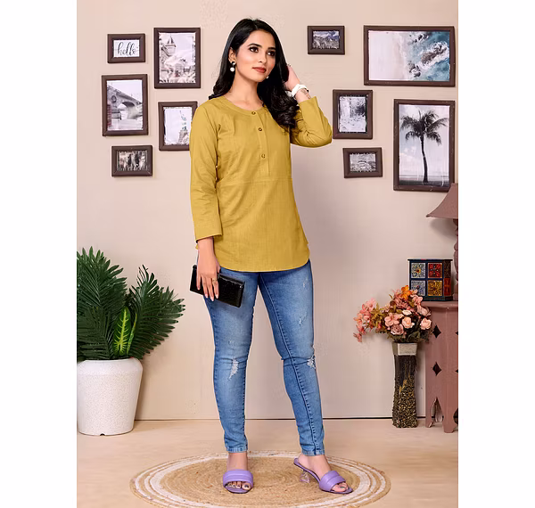 Upgrade your wardrobe with this Pure Cotton Yoke Design Stylish Top, tailored for the modern, confident woman. Perfect for both work and casual wear, this short kurti features a smart Mandarin closed collar, elegant 3/4 sleeves, and a flattering hip-length A-line cut that suits all body types.