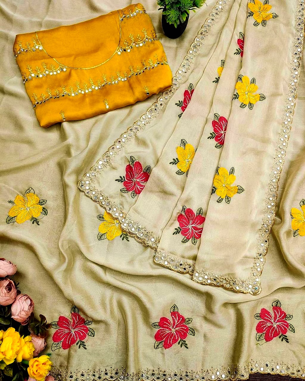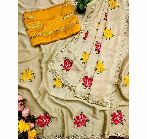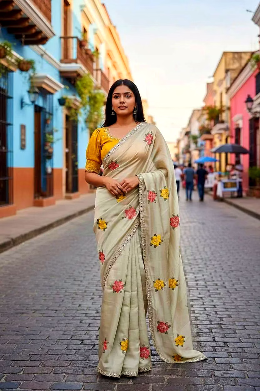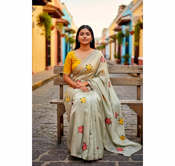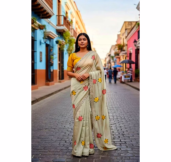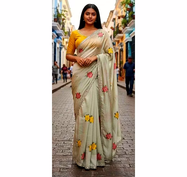 Perfect for weddings, parties, and festive occasions, this saree offers a luxurious drape, lightweight comfort, and an effortlessly elegant silhouette.