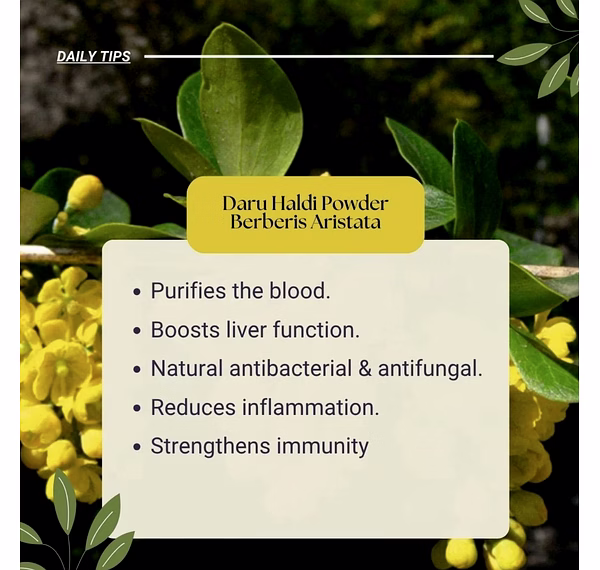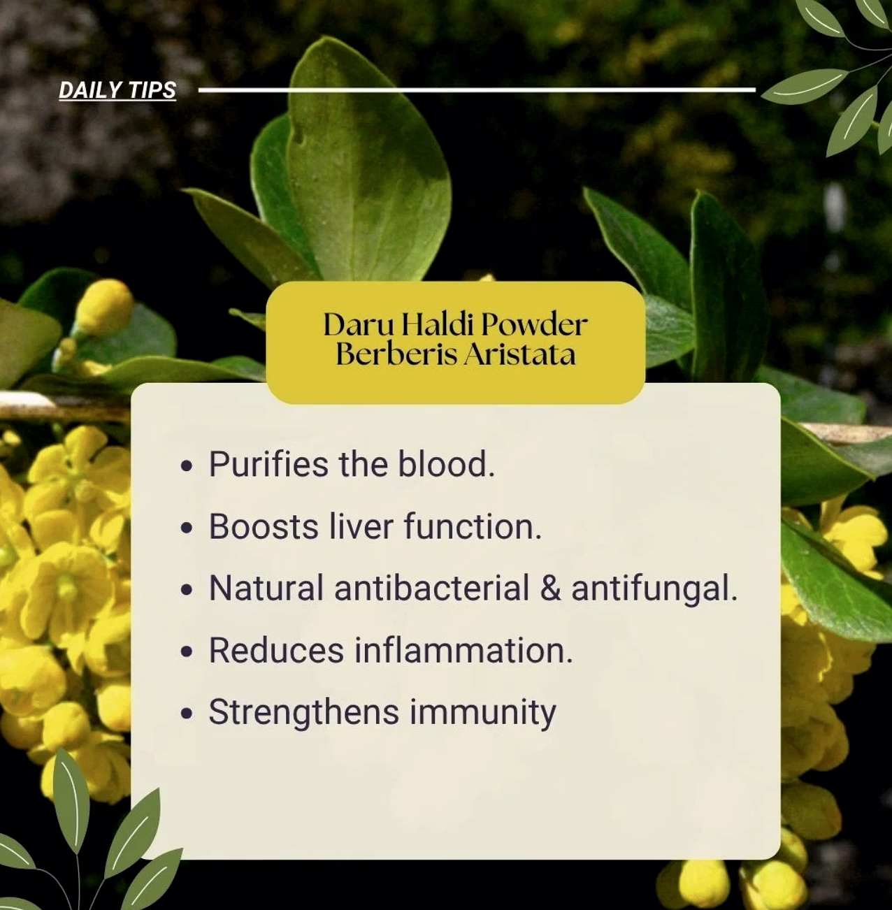 Daru Haldi (also known as Berberis Aristata or Indian Barberry) is a powerful herb in Ayurveda known for its anti-inflammatory, anti-microbial, and blood-purifying properties. It is traditionally used to support liver health, treat skin disorders, and boost natural immunity.