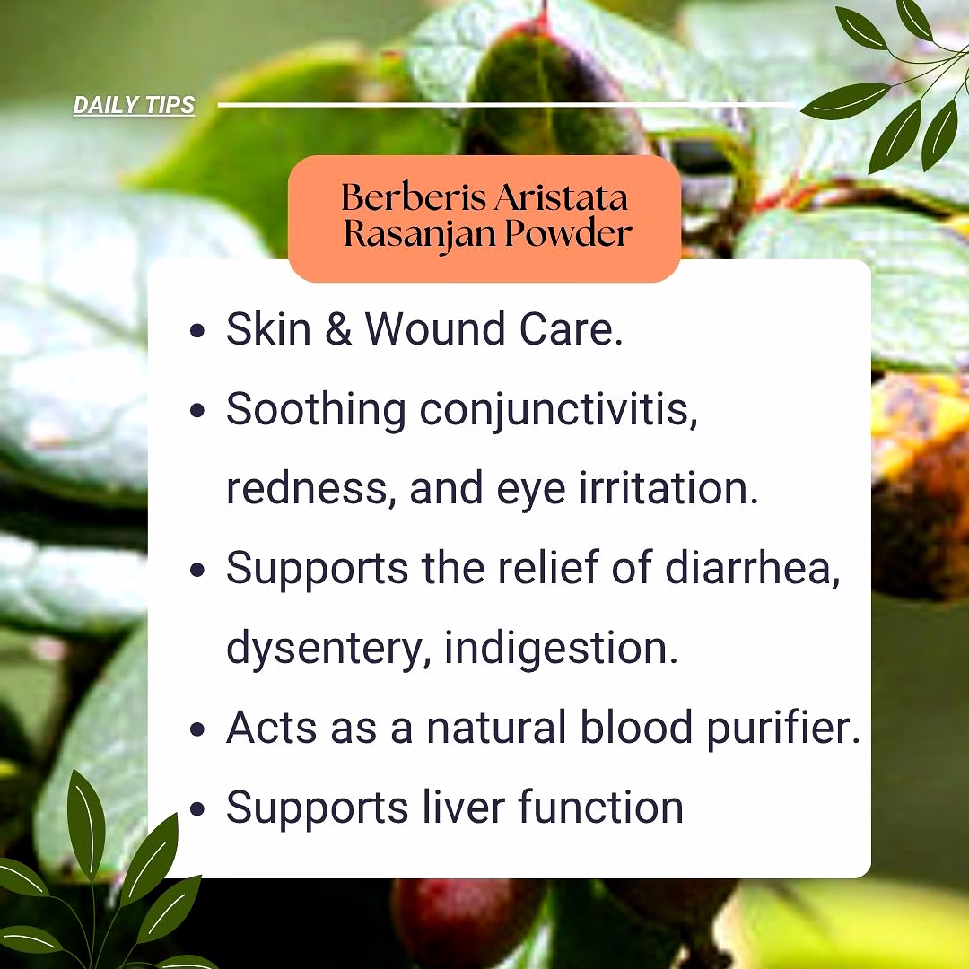 Discover the healing essence of Rasot Powder, also known by traditional names such as Rasanjan, Rasaut, Raswanti, and Rasavanti. This bright yellow resin is sourced from the roots and bark of the Berberis aristata (Indian Barberry) plant. Celebrated across , Unani, and Siddha traditions, Rasot offers a broad spectrum of health benefits that touch the skin, eyes, digestive system, and more.