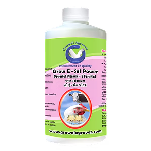 • Grow E Sel Power (Vitamin E & Selenium) is helpful in immunity building & protecting against various viral diseases, coccidiosis, Crazy Chick Disease, Exudative Diathesis, and Muscular Dystrophy and reduces leg weakness syndrome. It helps to overcome the stress of poultry deworming, vaccination, and debeaking. It reduces the incidence of ascites and sudden death syndrome in poultry. Vitamin E Selenium improves hatchability and egg production of layer poultry.
