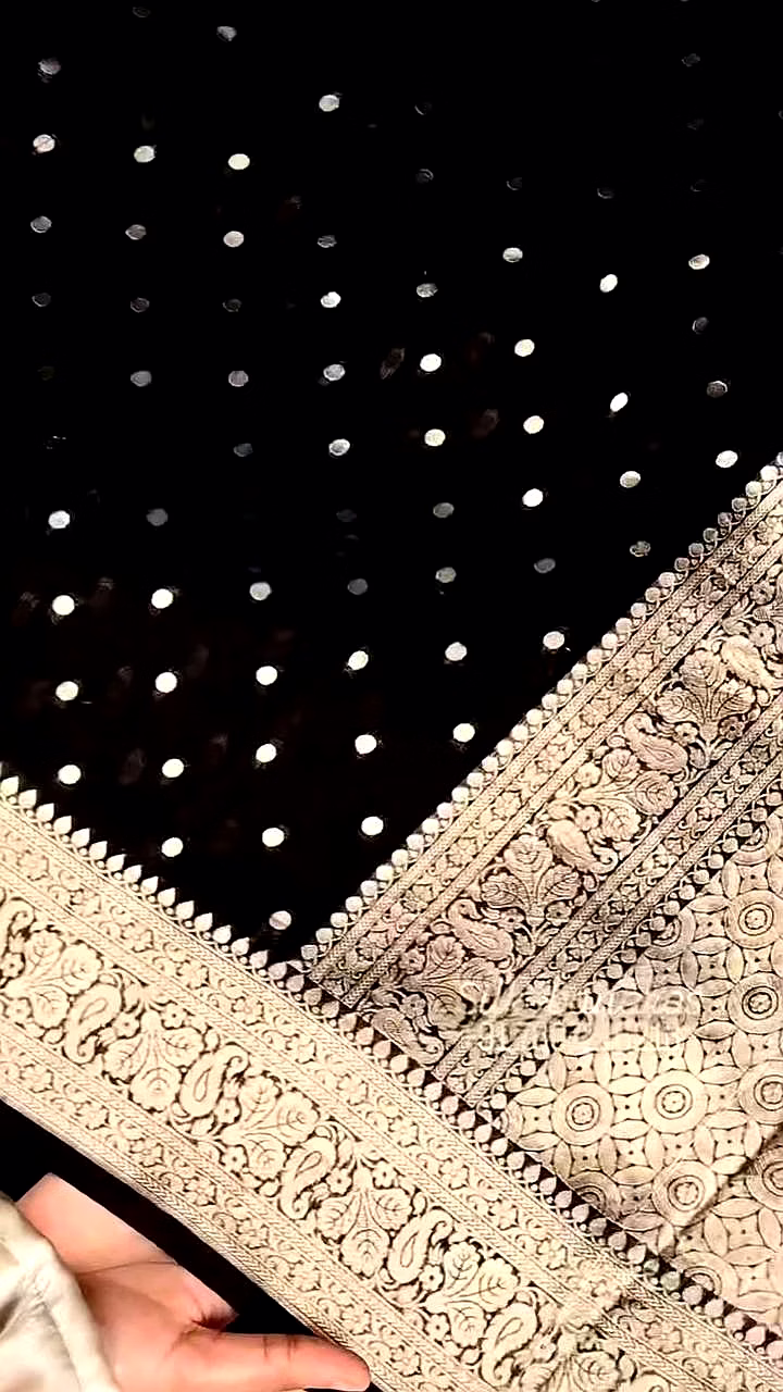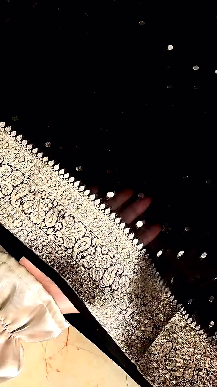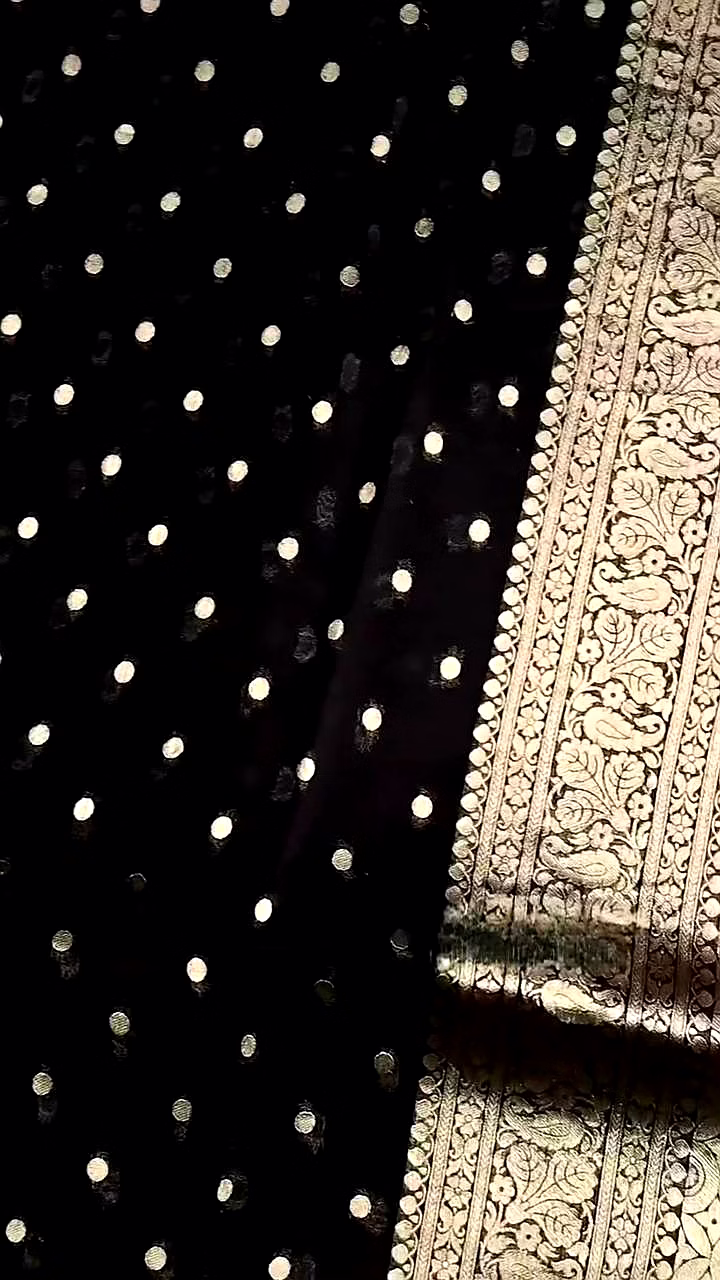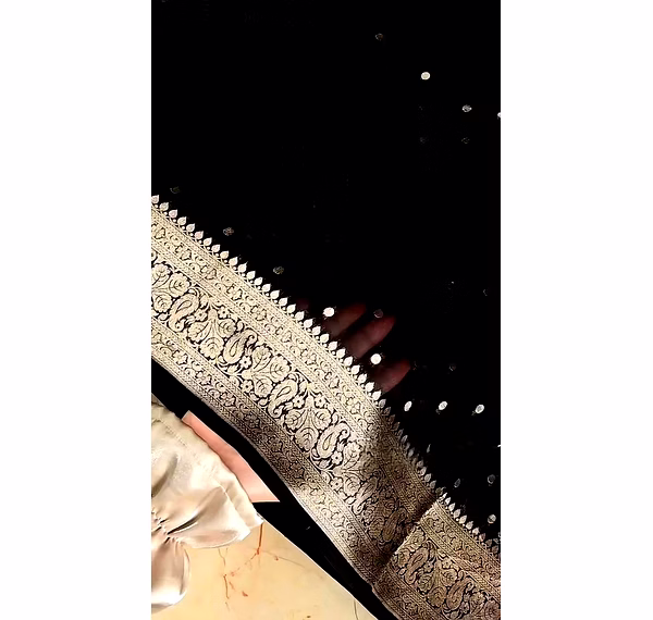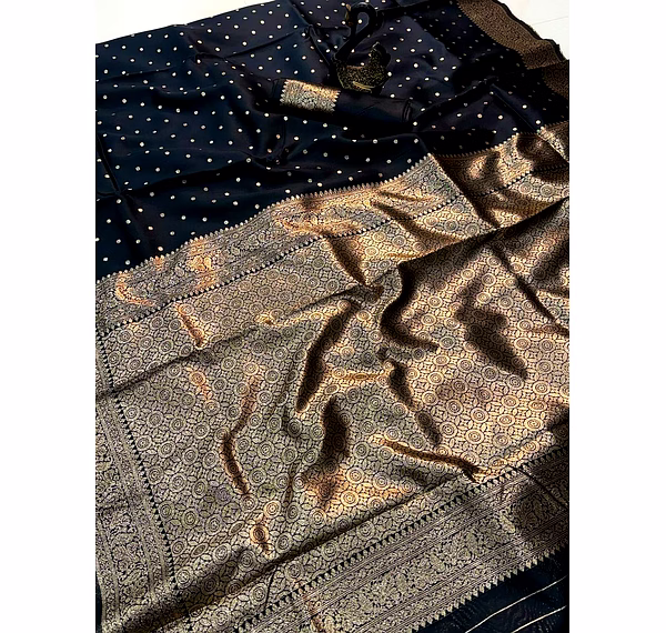 Make a bold statement with our Midnight Black Lichi Silk Saree. Combining the mystery of black with the luster of gold-toned jacquard, this saree is the epitome of modern ethnic luxury.