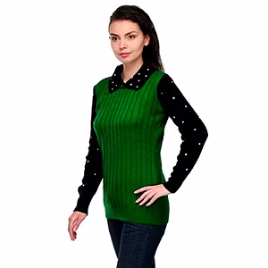 This is a casual ladies cable knit sweater with contrast color sleeves and collar .