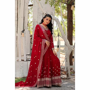 Experience the elegance and grace of our stunning gown set, complete with gown, dupatta, and pent. Our gown is crafted from high-quality Blooming Vichitra fabric, offering a luxurious and comfortable feel for any occasion. With a full flair of 4 meters and canvas support, this gown is designed to capture the attention of everyone in the room. Our gown is available in a free size of up to 42 inches, making it versatile and comfortable for all body types. The waist measures 42 inches and the height is 55 inches, providing a flattering fit that accentuates your natural curves. The inner lining is made of Micron fabric, ensuring that you feel comfortable and confident all day long. The accompanying dupatta is made of Butterfly Net fabric and features full embroidery work with a fancy Zalar lace measuring 2.5 meters. The intricate embroidery adds a touch of elegance, making this gown set perfect for any formal event. The pent is crafted from Micron Cotton fabric, designed to offer the perfect balance of style and comfort. It comes in a size of 42 inches with an ilastik rubber band and a height of 40 inches, ensuring that it fits perfectly and comfortably. Our gown set is perfect for those who want to make a statement at any event. With its full flair, intricate embroidery work, and comfortable fit, you are sure to turn heads wherever you go. Don't settle for ordinary when you can have extraordinary with our stunning gown set.