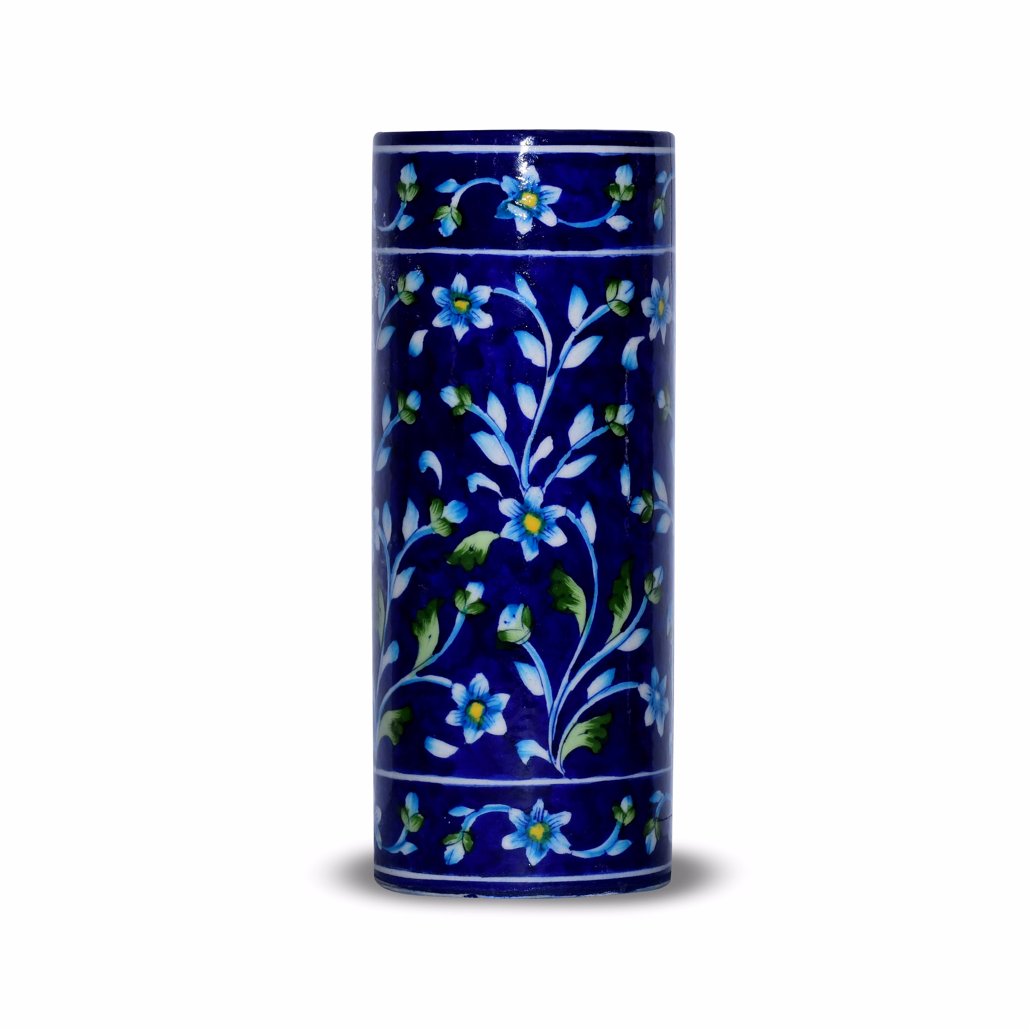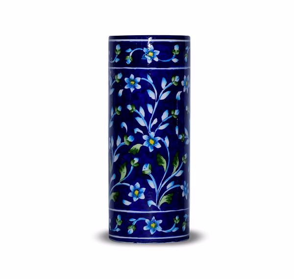 Enhance your living space with the timeless beauty of this handcrafted Jaipur Blue Pottery Vase in an elegant cylindrical design. Expertly made by skilled artisans of Jaipur, Rajasthan, this vase embodies the rich legacy of Blue Pottery, known worldwide for its striking cobalt blue glaze, intricate floral motifs, and smooth, lustrous finish.