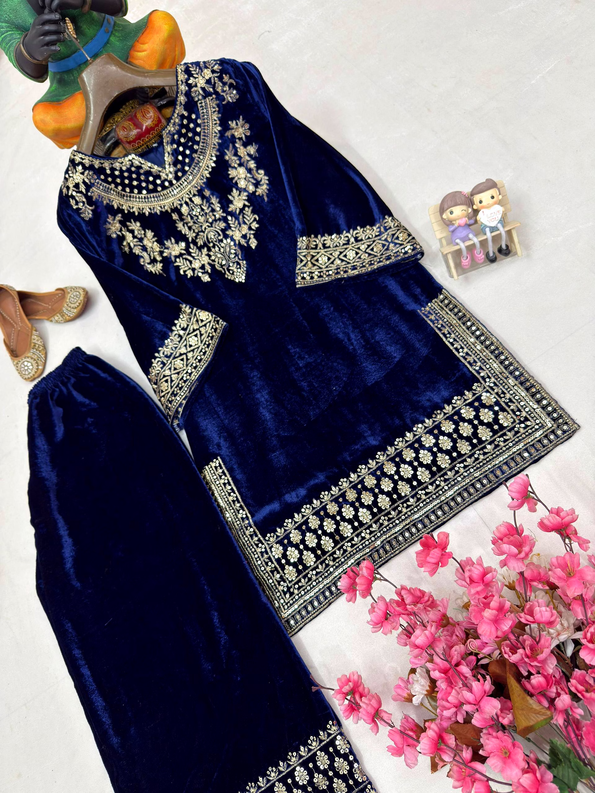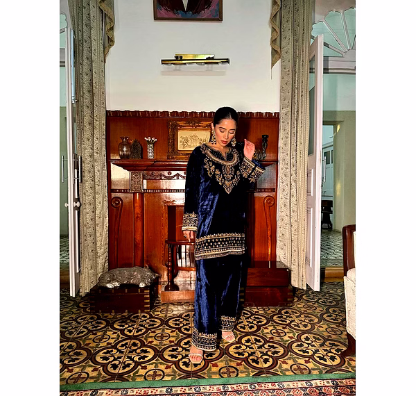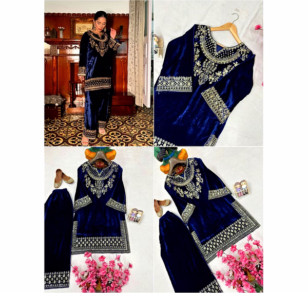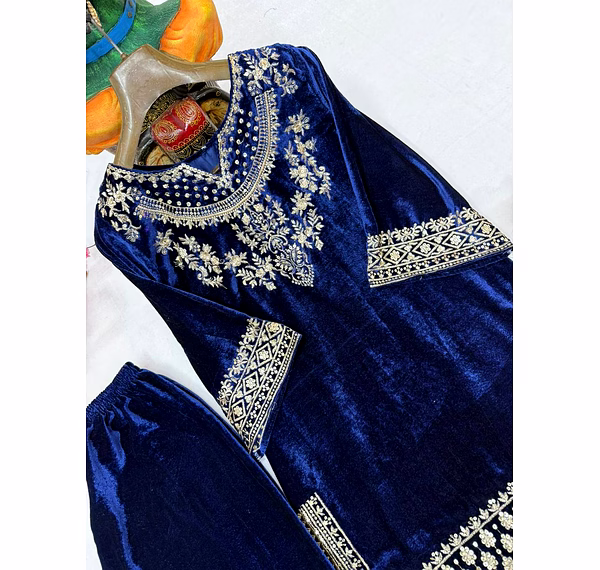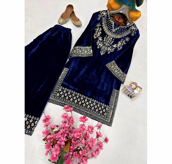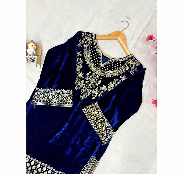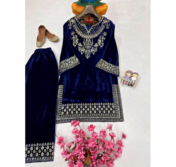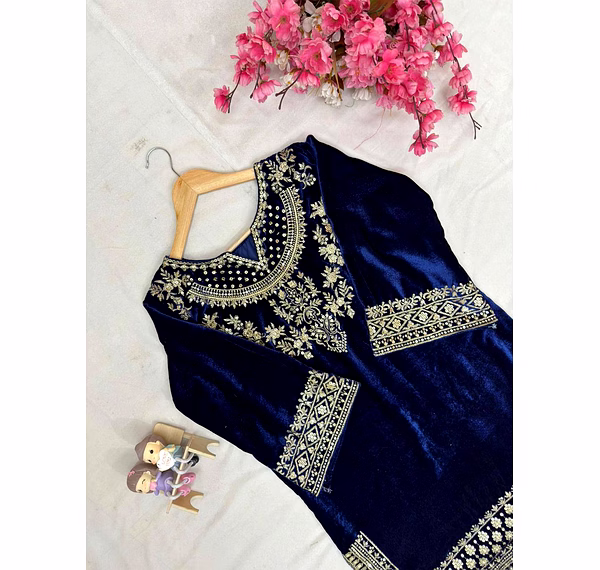 Add timeless elegance to your ethnic wardrobe with the Blue Velvet Kurti with Sequence Work. Crafted from plush velvet fabric and enhanced with shimmering sequence embroidery, this kurti delivers a perfect blend of luxury, comfort, and festive charm.