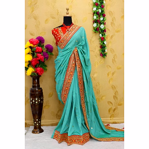 Introducing the Bluming Vichitra Silk Saree, a true masterpiece that combines elegance, craftsmanship, and timeless beauty. Made with utmost care and precision, this saree is a perfect blend of tradition and modernity. Crafted with fine Vichitra silk, this saree exudes a luxurious and regal aura. The intricate zari work and stone embellishments add a touch of opulence, making it a standout piece for any occasion. The attention to detail is evident in every stitch, showcasing the fine artistry of our skilled craftsmen. The accompanying blouse, also made with Bluming Vichitra silk, features exquisite embroidery work that beautifully complements the saree. It adds a contemporary twist to the overall traditional look, making it a versatile ensemble that can be styled in various ways. With its lightweight and soft fabric, the Bluming Vichitra Silk Saree ensures comfort without compromising on style. It drapes effortlessly, enhancing your natural grace and leaving a lasting impression wherever you go. Whether it's a wedding, festival, or any special event, this saree will make you the center of attention. Bluming Vichitra Silk Saree is more than just a piece of clothing; it is an expression of your unique personality and style. It is a symbol of timeless elegance and sophistication. With its exquisite craftsmanship and attention to detail, this saree is a true work of art. Indulge yourself in the beauty of the Bluming Vichitra Silk Saree and experience the joy of wearing a truly exceptional piece. Be prepared to receive compliments and turn heads wherever you go. Elevate your style and make a statement with this stunning saree that effortlessly captures the essence of grace and glamour.