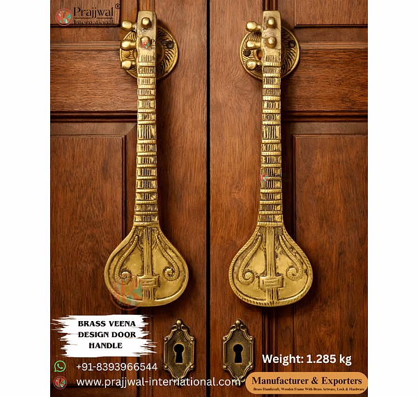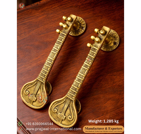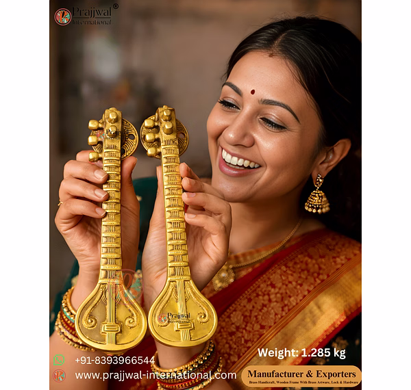 Enhance your entrance with timeless elegance and divine symbolism through our Brass Veena Design Door Handle, inspired by the sacred Veena — a symbol of knowledge, art, and prosperity. Expertly handcrafted from premium solid brass by skilled artisans of Aligarh, this decorative pull handle is perfect for main doors, temple entrances, luxury homes, villas, hotels, and heritage projects worldwide.